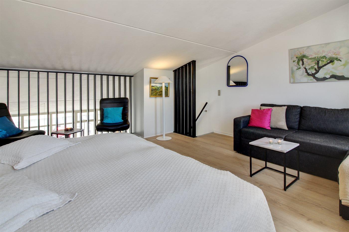 Der er i alt 1 soveværelse. Sovepladserne fordeler sig på: 4 sovepladser i dobbeltsenge. 2 sovepladser i sovesofa (dobbelt). 2 af disse sovepladser befinder sig i opholdsstuen og 2 af dem befinder sig på hemsen.