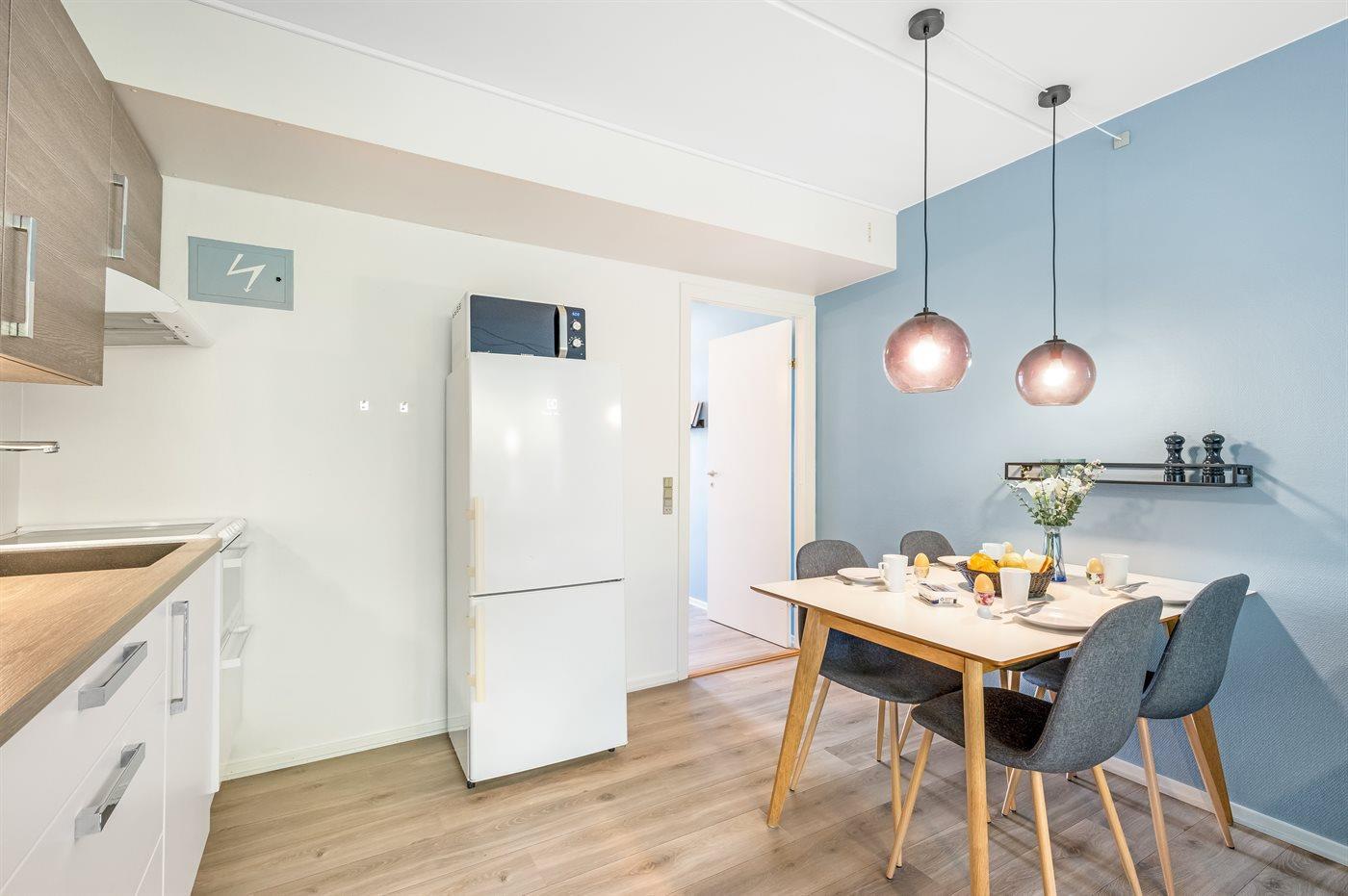 Køkkenet er udstyret med 1 køleskab. Der er 4 keramiske kogeplader, varmluftovn, mikrobølgeovn samt opvaskemaskine.