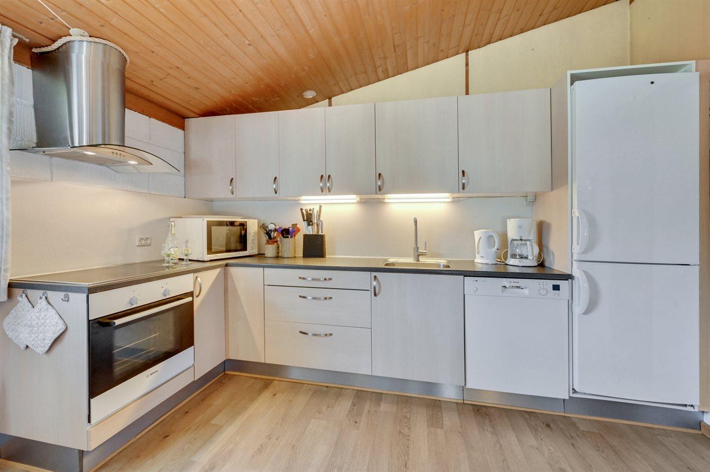Køkkenet er udstyret med 1 køleskab. Der er 4 elkogeplader, bageovn, mikrobølgeovn samt opvaskemaskine.