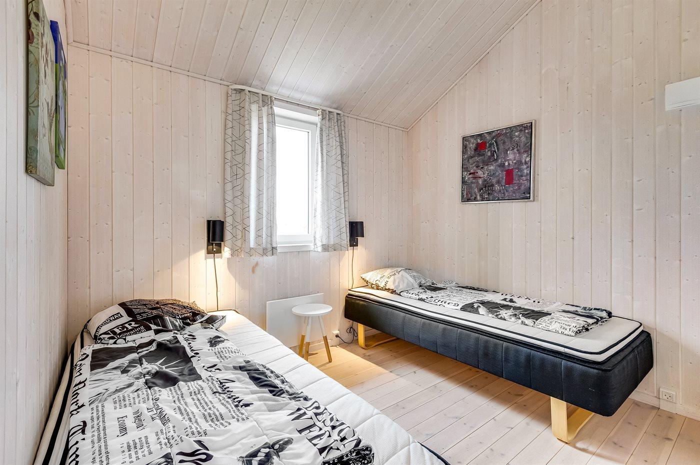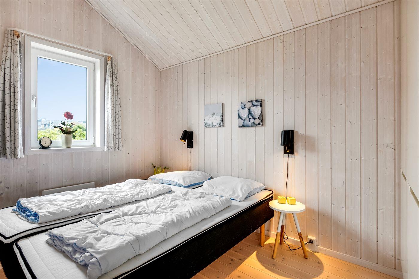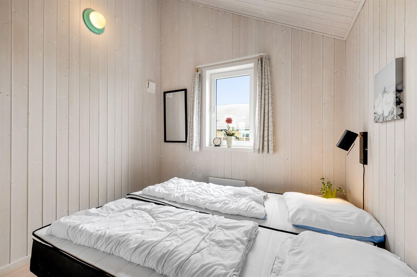 Der er i alt 2 soveværelser. Sovepladserne fordeler sig på: 2 sovepladser i dobbeltseng. 2 sovepladser i enkeltsenge. Derudover er der 1 stk. barneseng.