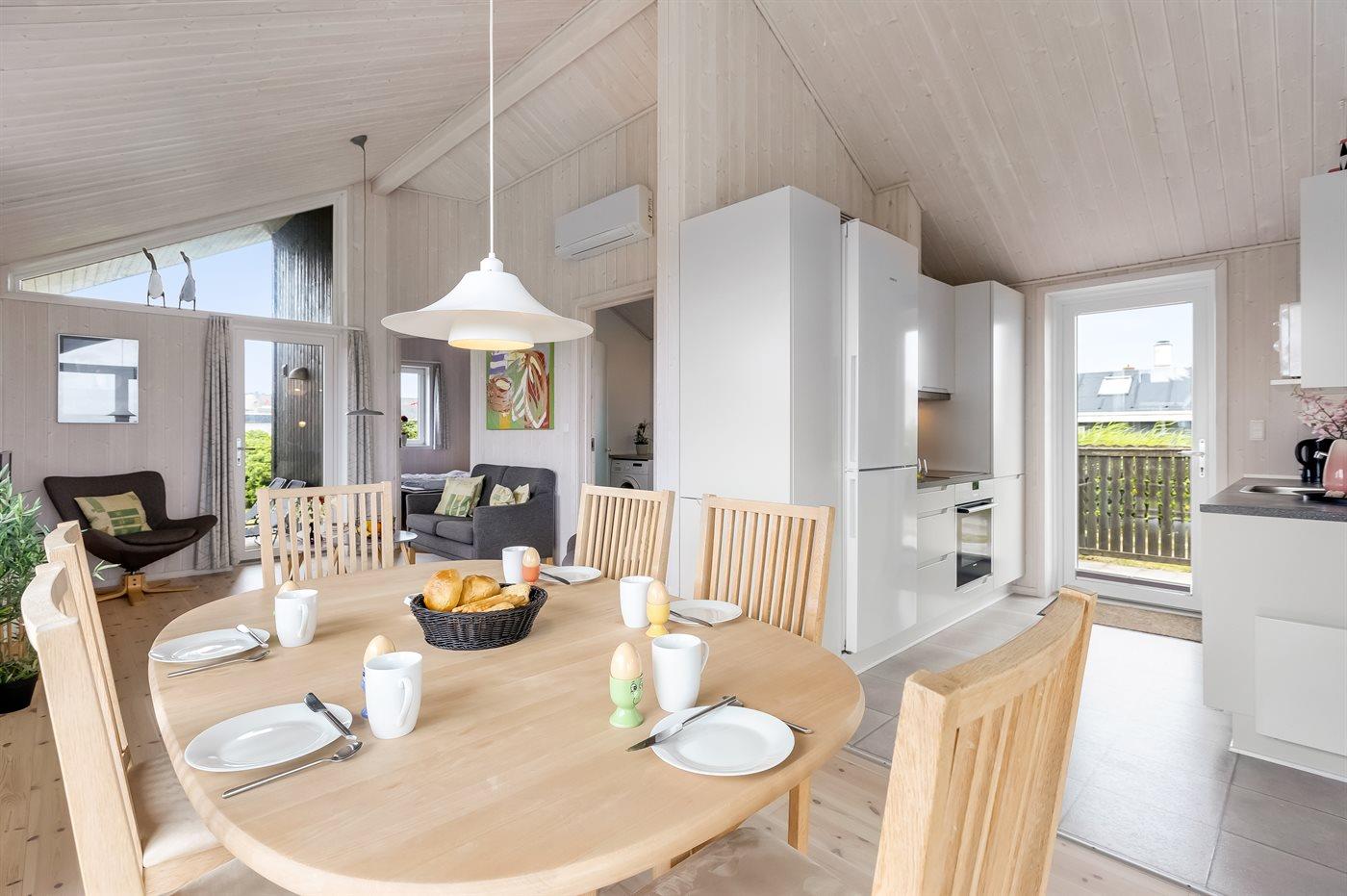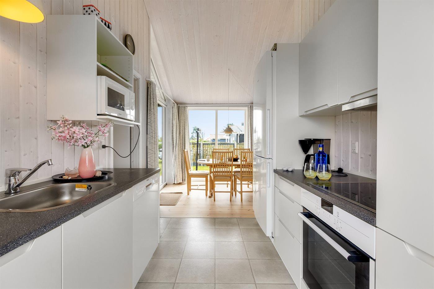 Køkkenet er udstyret med 1 køleskab. Der er 4 keramiske kogeplader, varmluftovn, mikrobølgeovn samt opvaskemaskine.