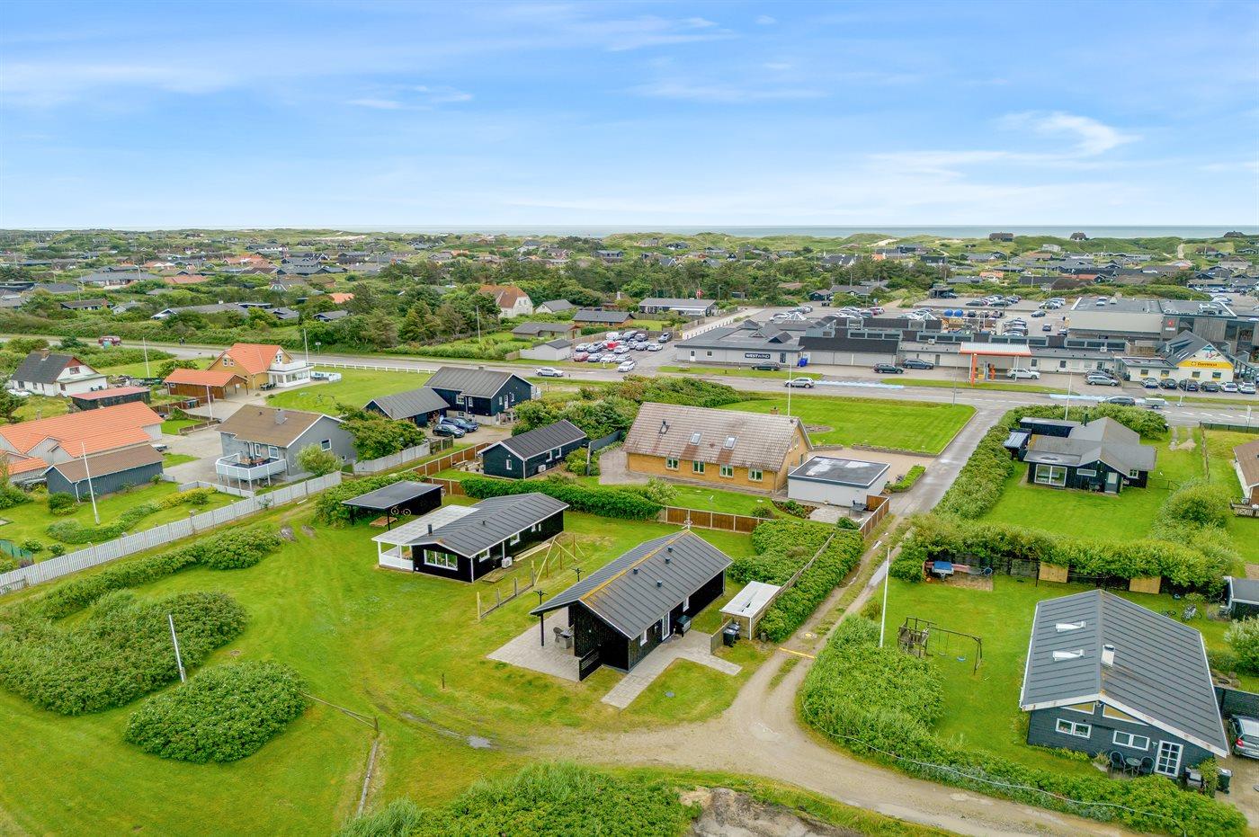 Ferieboligen er beliggende på en 1500 m² stor naturgrund. Der er 700 m til havet. Der er 800 m til fjorden. Nærmeste forretning er beliggende i en afstand af 150 m. Der er en golfbane i en afstand af 700 m. Til ferieboligen hører 20 m² terrasseareal. Desuden er der 20 m² overdækket terrasse. Grill til rådighed. Parkering ved ferieboligen.