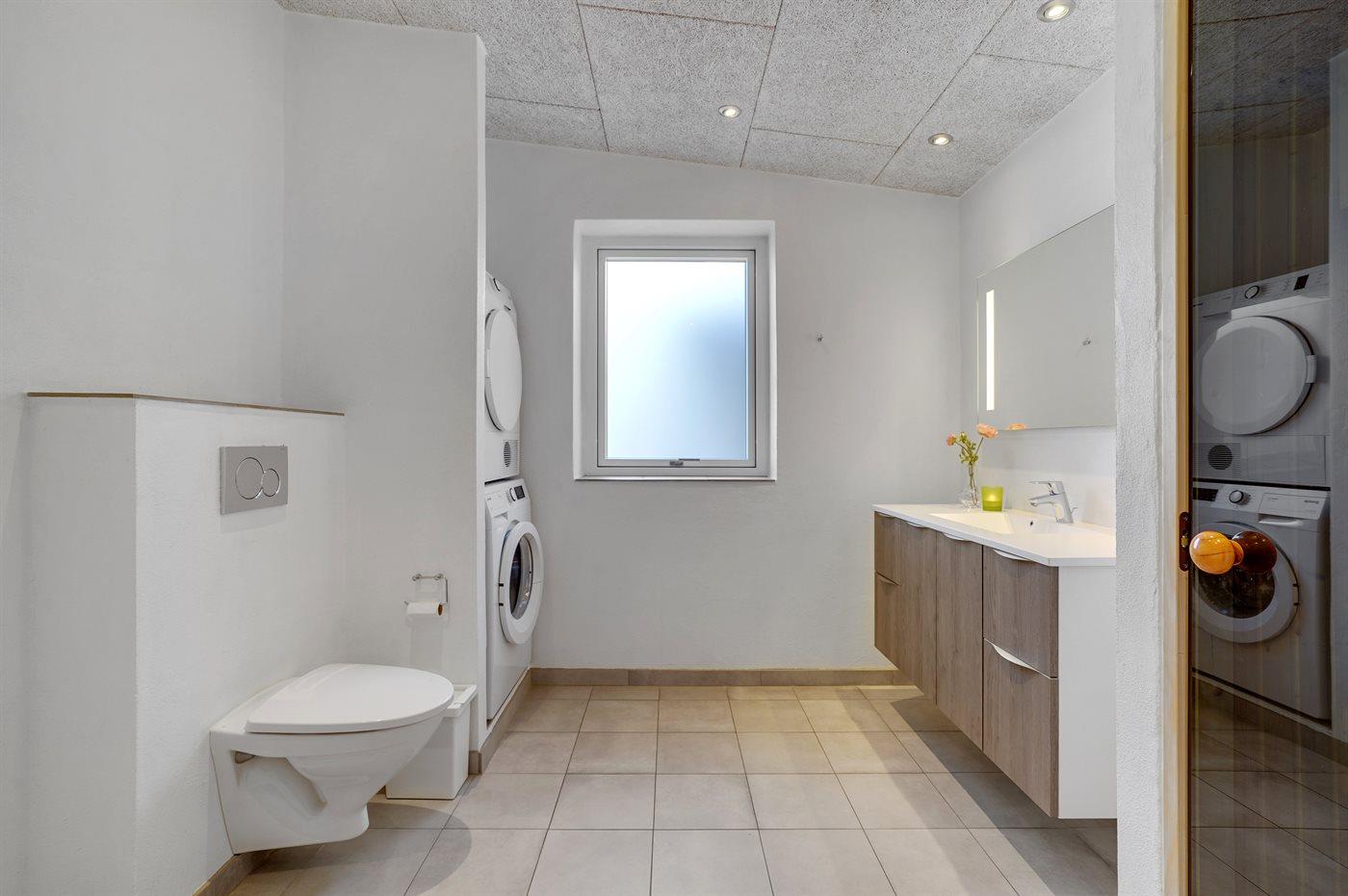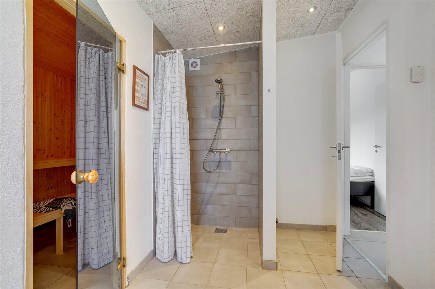 Der er 2 badeværelser med bruseniche og 2 toiletter. Der er gulvvarme på 2 badeværelser. I saunaen er der mulighed for afslapning.