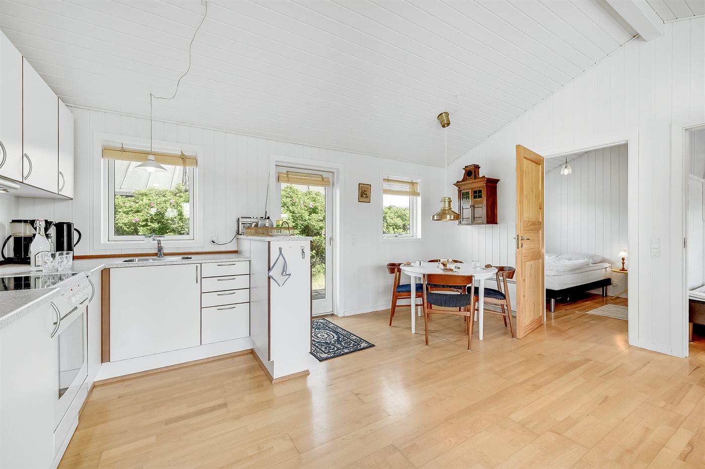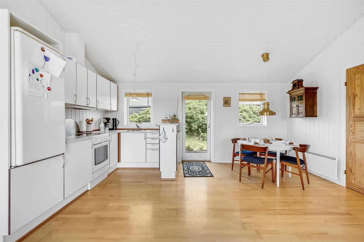 Køkkenet er udstyret med 1 køleskab. Der er 4 keramiske kogeplader, varmluftovn.