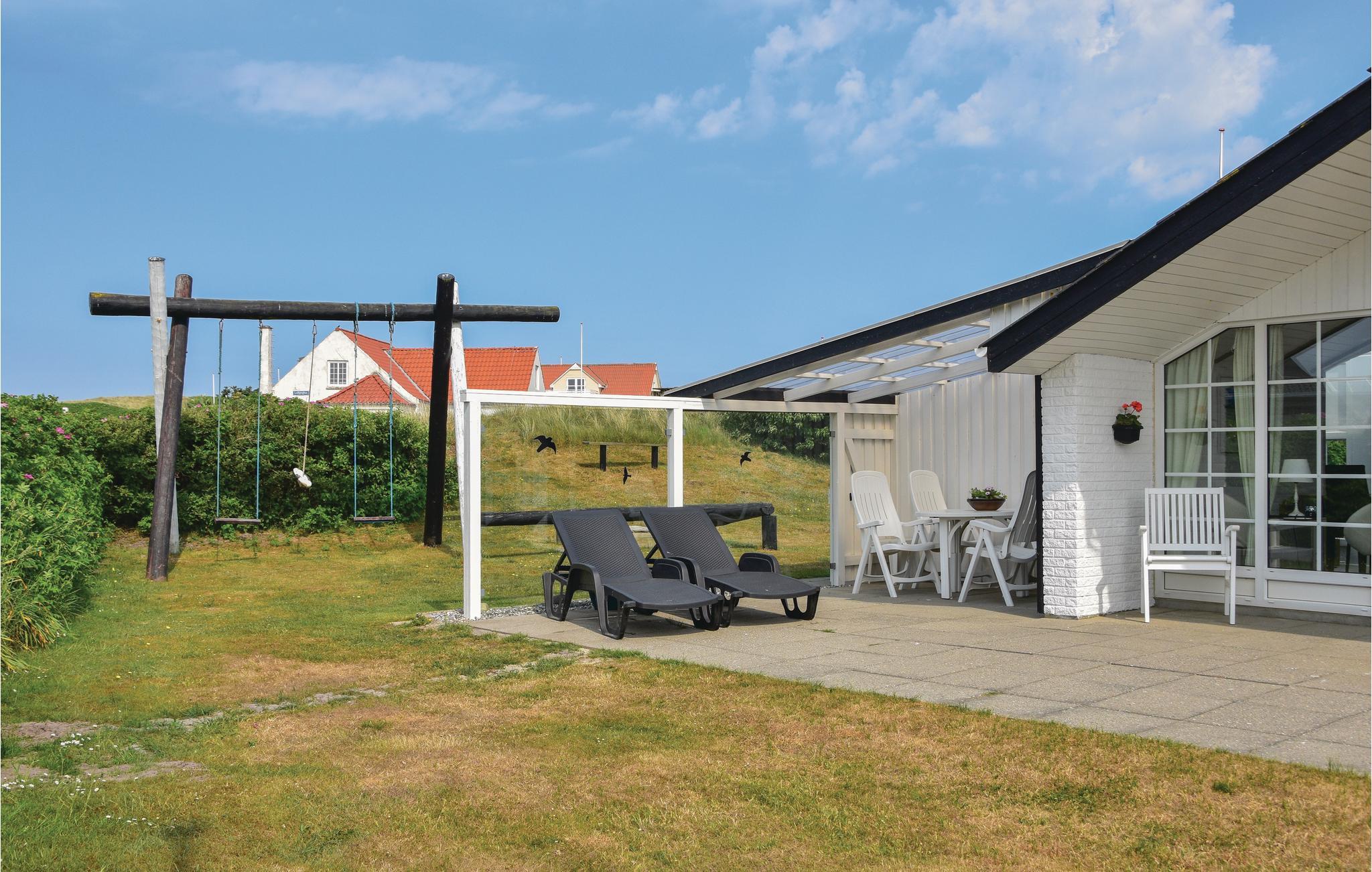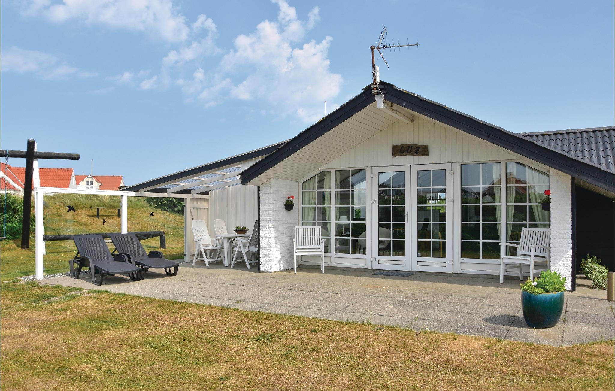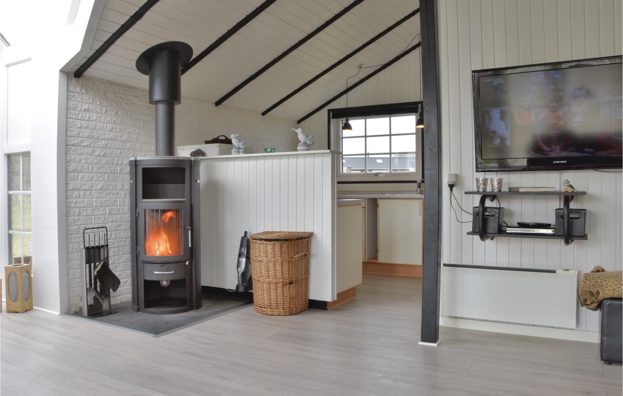 Skønt træhus nær Vesterhavet med overdækket terrasse og brændeovn i Søndervig.