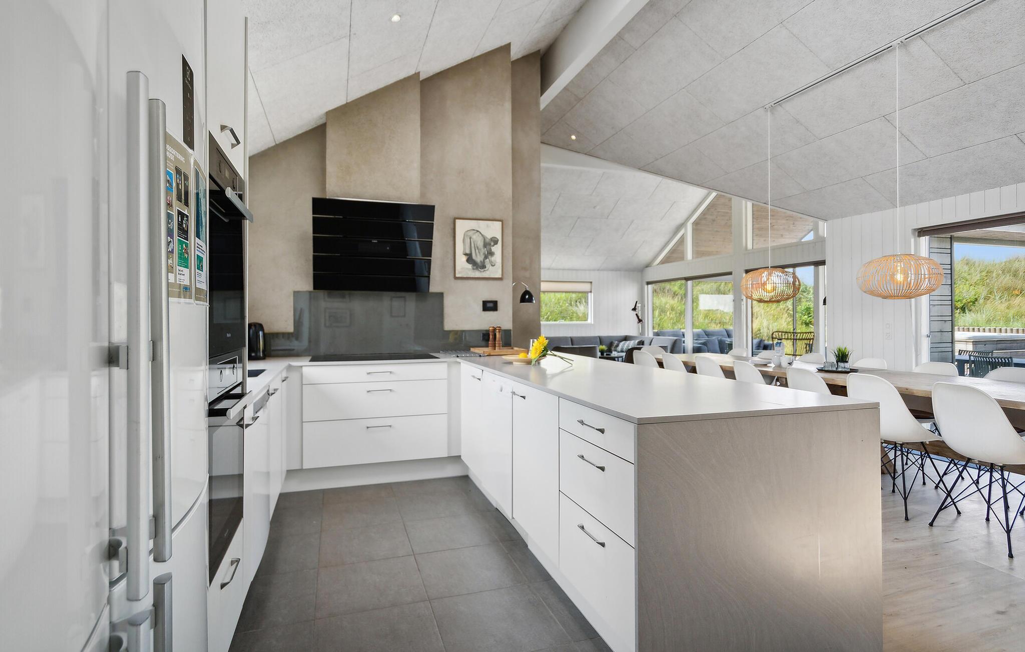 Køkkenet er særdeles velindrettet og udstyret med to komfurer og to opvaskemaskiner samt to køle-/fryseskabe, så der kan uden problemer være mange kokke om den fælles madlavning.