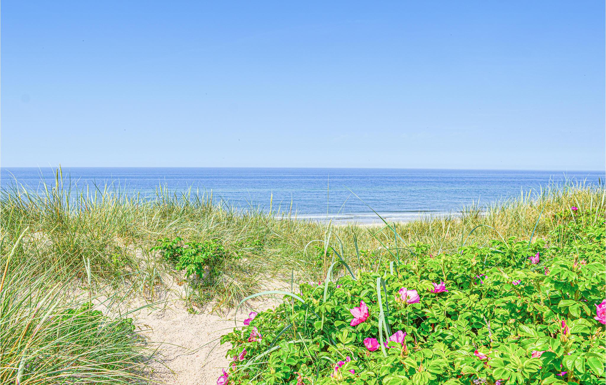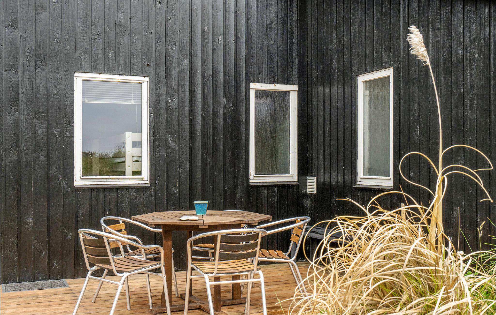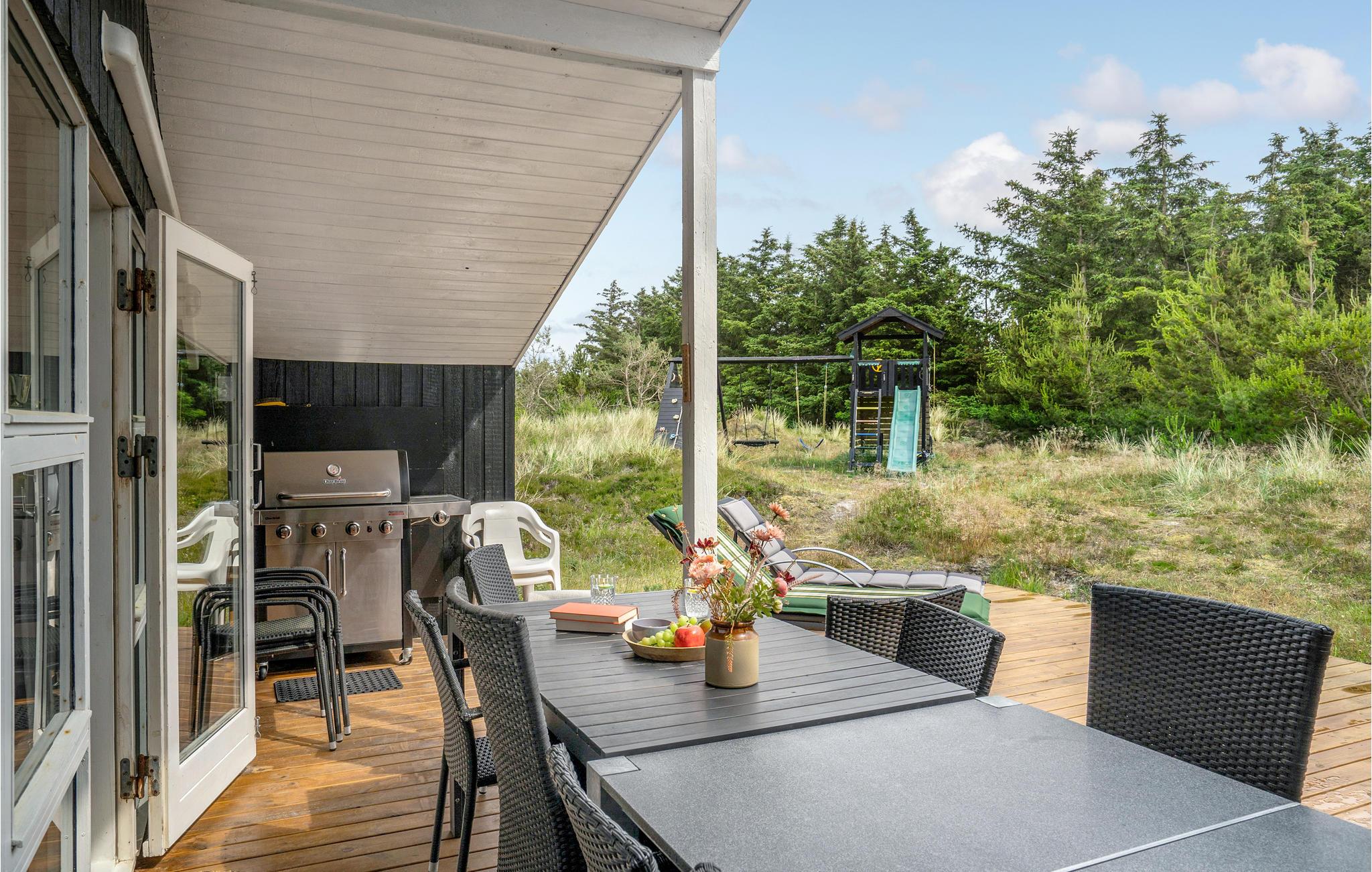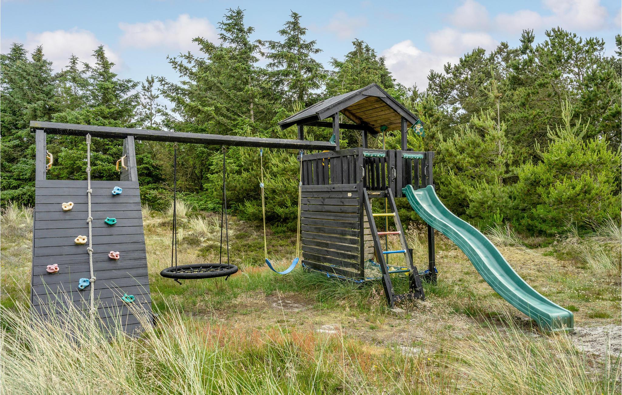 Gå ud på den kuperede klitgrund, og oplev de mange kroge omkring huset, hvor I kan få læ fra vinden. Slap af på en af de to skønne terrasser, eller tilbered lækre måltider i udekøkkenet. Lad jeres børn lege på legetårnet med gynge, rutsjebane og klatreelementer, mens I nyder den rolige beliggenhed for enden af den lille stikvej.