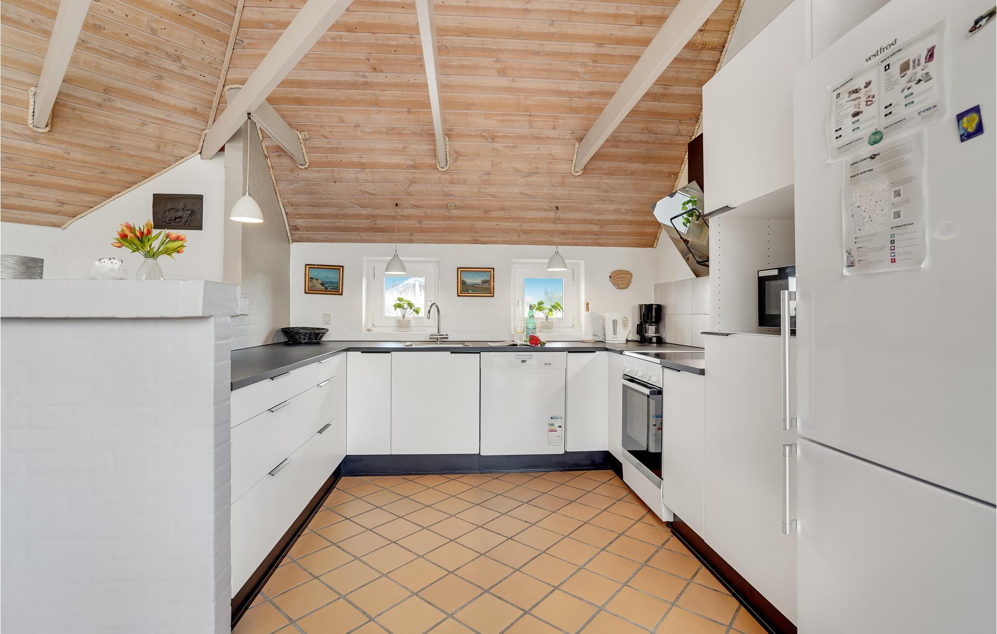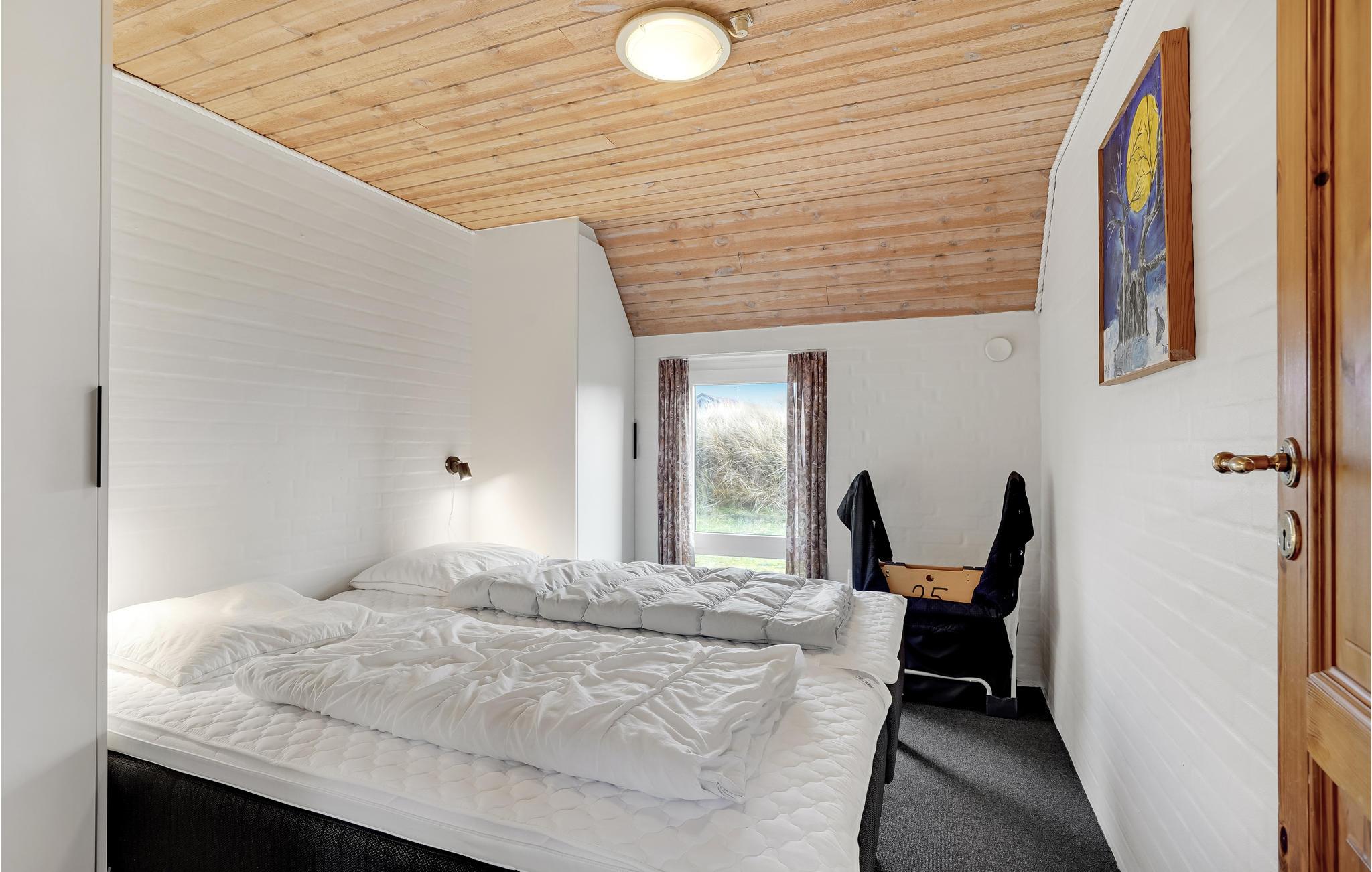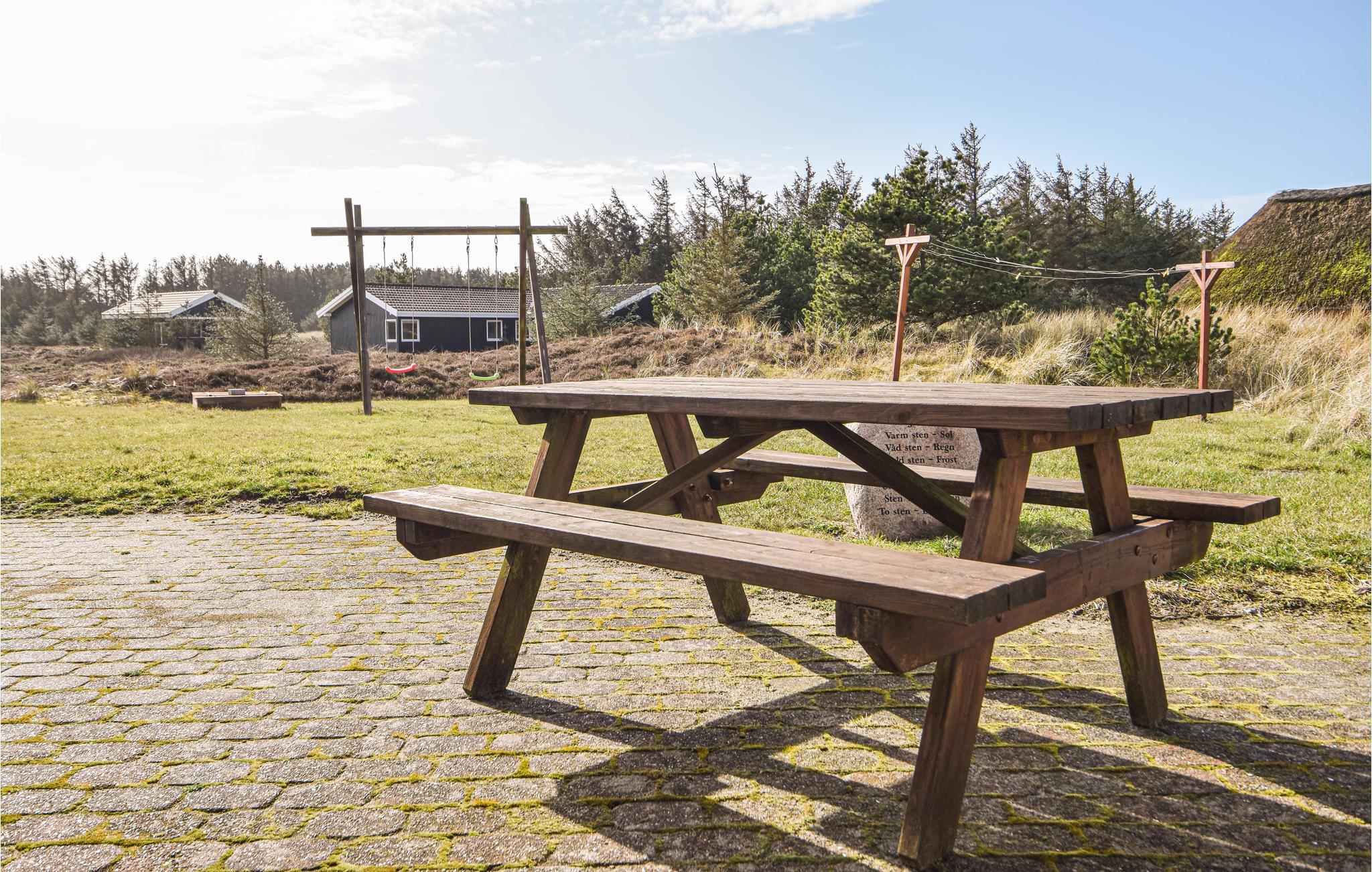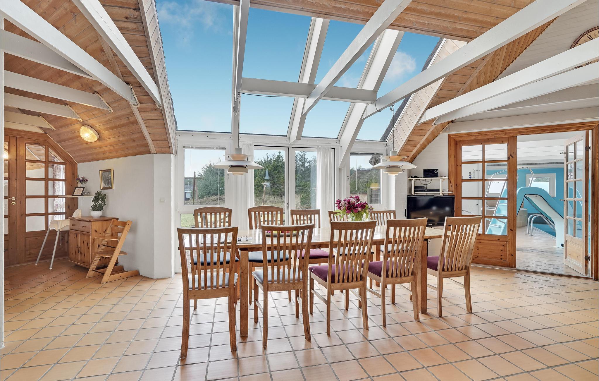 I det smukke naturområde tæt på den populære ferieby Søndervig ligger dette store feriehus med swimmingpool. Huset er godt indrettet til en større familie, 2 familier eller måske flere vennepar, der gerne vil holde ferie sammen. I centrum af huset ligger det store, kombinerede køkken-/stueområde med brændeovn og med loft til kip. Det store vinduesparti giver et dejligt lysindfald i rummet. Fra stuen er der adgang til husets wellnessafdeling med både en stor (30 m²) swimmingpool med rutsjebane, spabad og sauna. Ligeledes i wellnessafdelingen ligger det ene af de 2 badeværelser. I modsatte ende af huset og mere roligt, ligger soveafdelingen med 4 soveværelser samt 2 hemse med hver 3 madrasser. Hertil kommer husets andet badeværelse. Fra terrassen har I udsigt over den store have med både gynge og sandkasse til de yngste gæster, og ligeledes en skøn udsigt til hedelandskabet omkring huset.