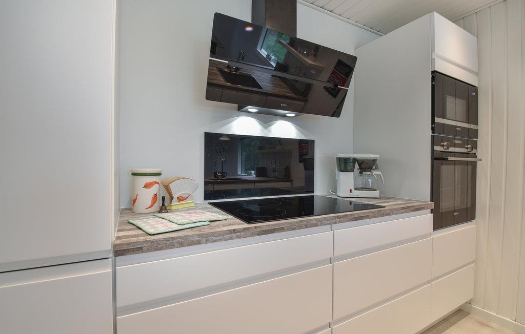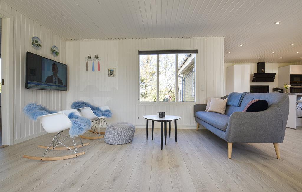 Moderne sommerhus nær Søndervigs strand og fjord med stor terrasse og åben planløsning.