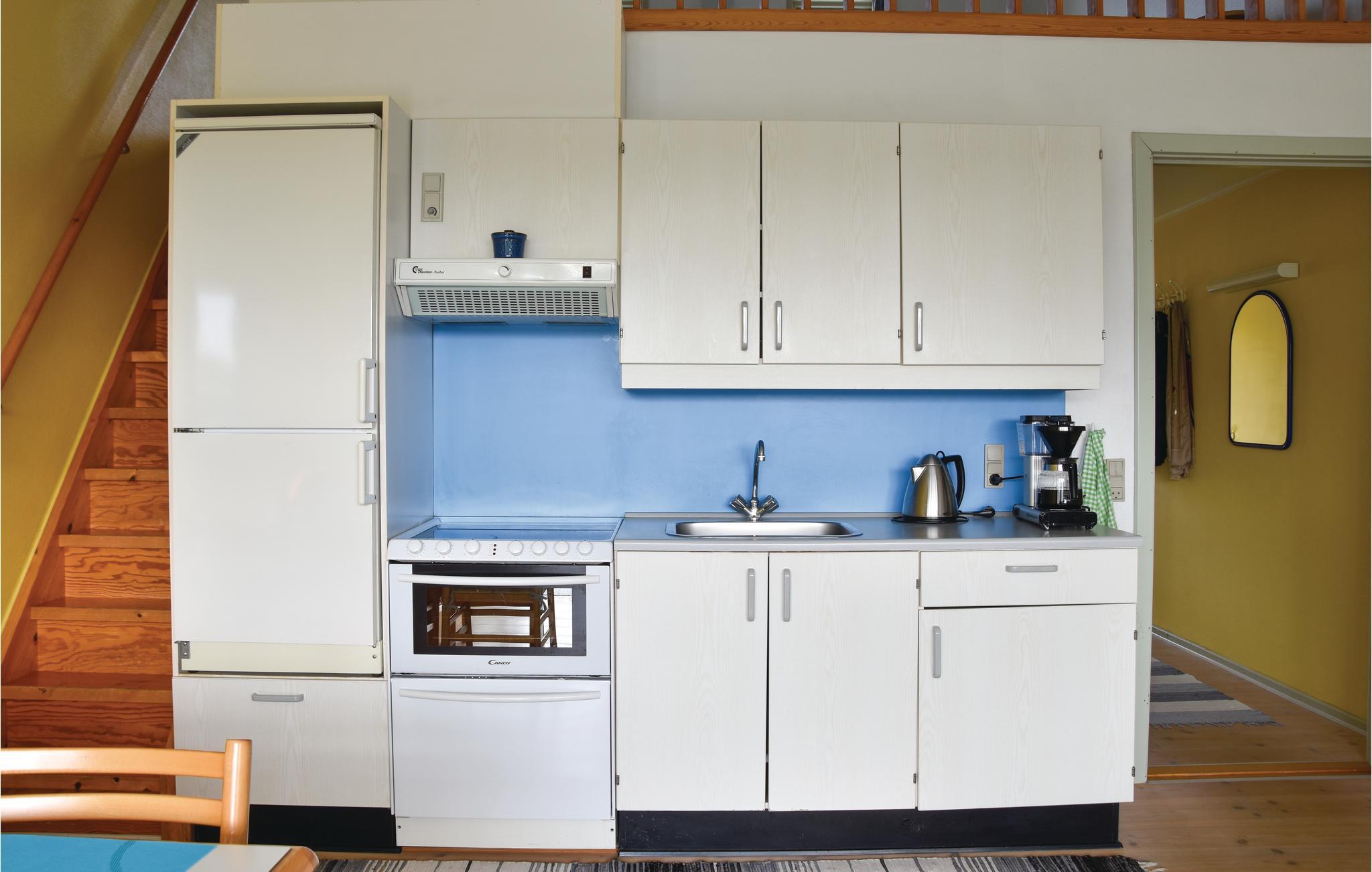 Lejligheden ligger på første sal, og er godt indrettet med et kombineret stue og køkken, hvorfra der er udgang til den overdækkede altan. Fra altanen er der kig til fjorden. I lejligheden findes endvidere et badeværelse med brus samt et soveværelse med to enkeltsenge. Fra stuen går en trappe op til et åbent værelse, hvor der står en dobbeltseng. De sidste to sovepladser er på en sovesofa i stuen.