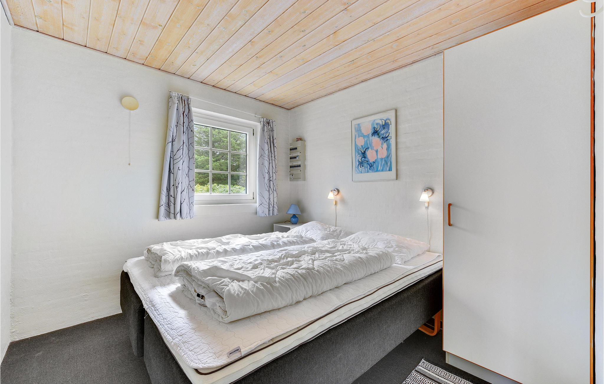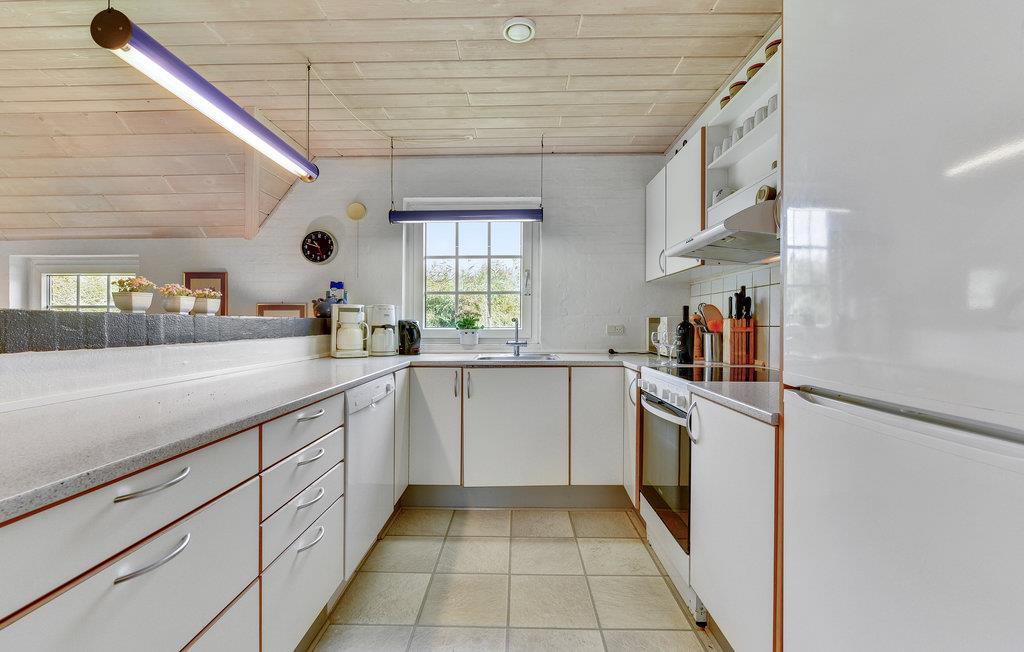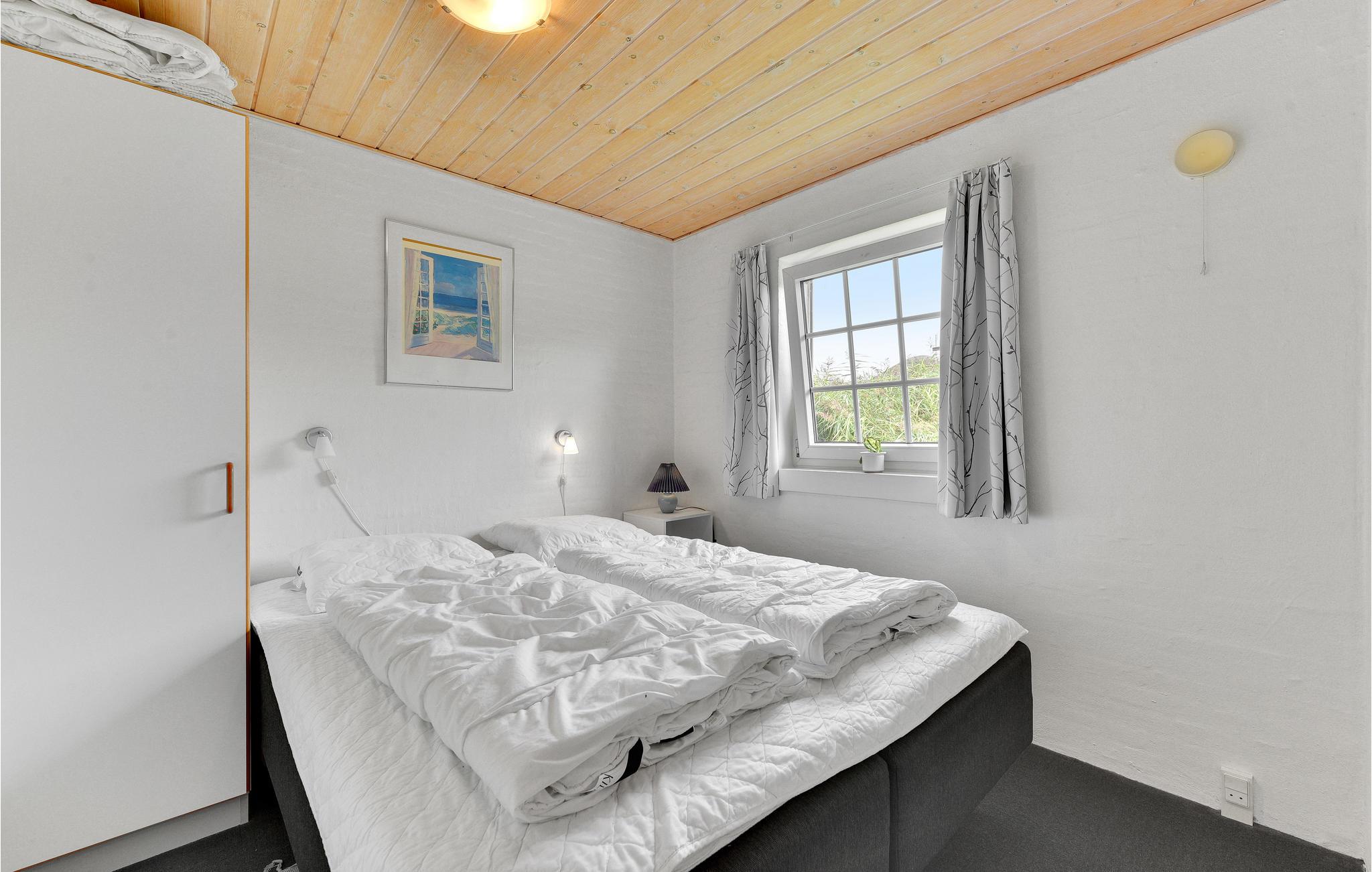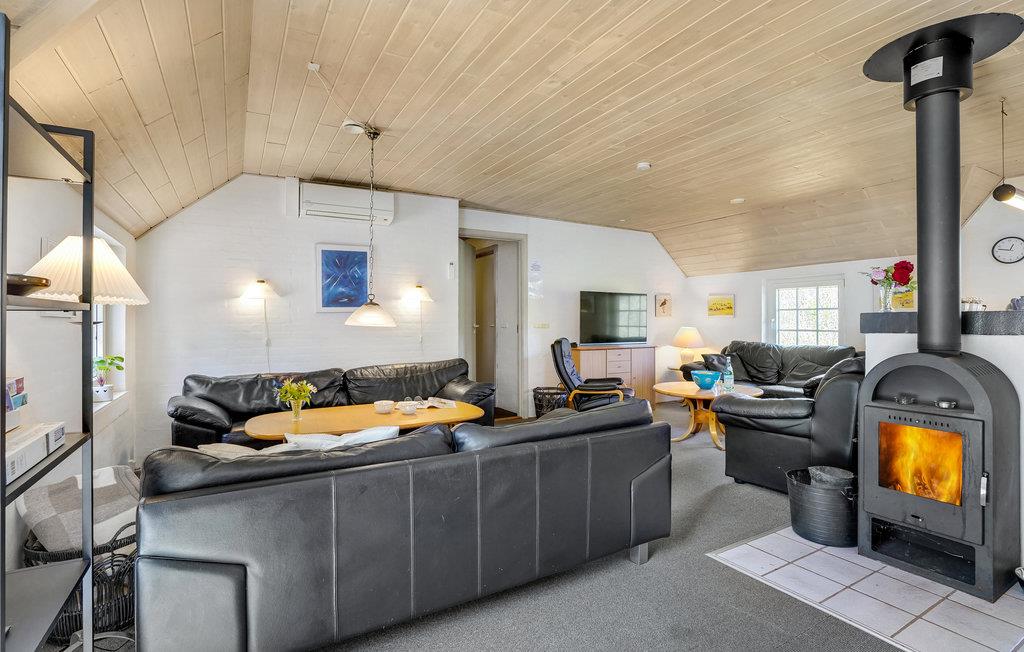 I husets midte ligger køkkenet i åben forbindelse til stuen og spiseområdet, i hver ende af huset er der en soveafdeling med hver tre soveværelser samt et badeværelse med bruser. I poolafdelingen er der, ud over den 17 m2 store swimmingpool, en sauna og et spabad. Så her kan der bruges mange timer på afslappende wellness-stunder efter en aktiv dag på stranden. I stuen er der både brændeovnen, som sørger for en rar atmosfærre og hurtig opvarmning, samt en varmepumpe som supplerende varmekilde. Huset har både vaskemaskine og tørretumbler, så I behøver ikke at have en hel kuffert fyldt med vasketøj med hjem.