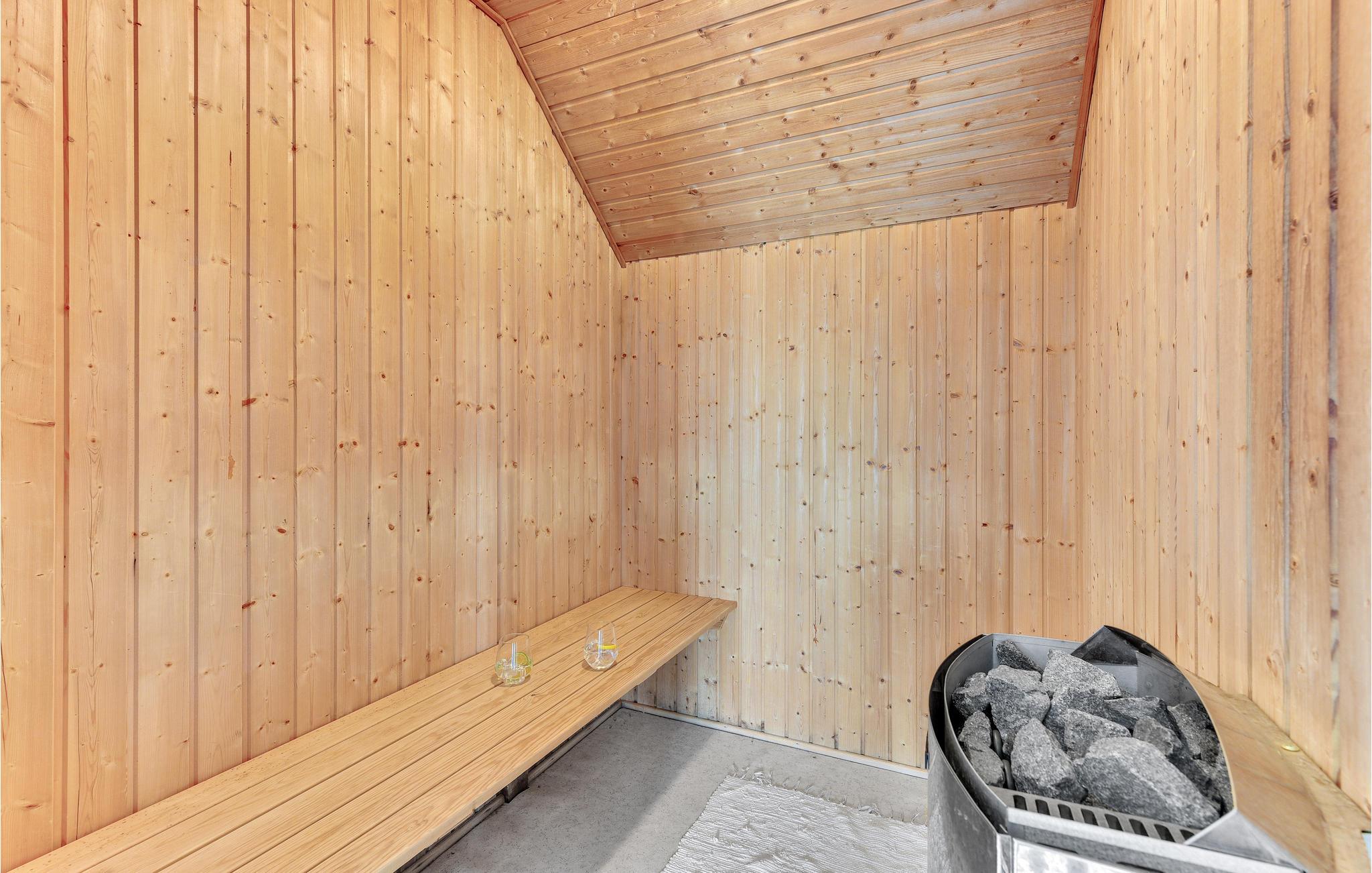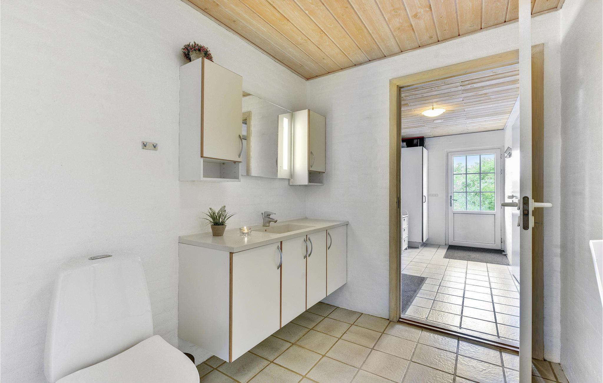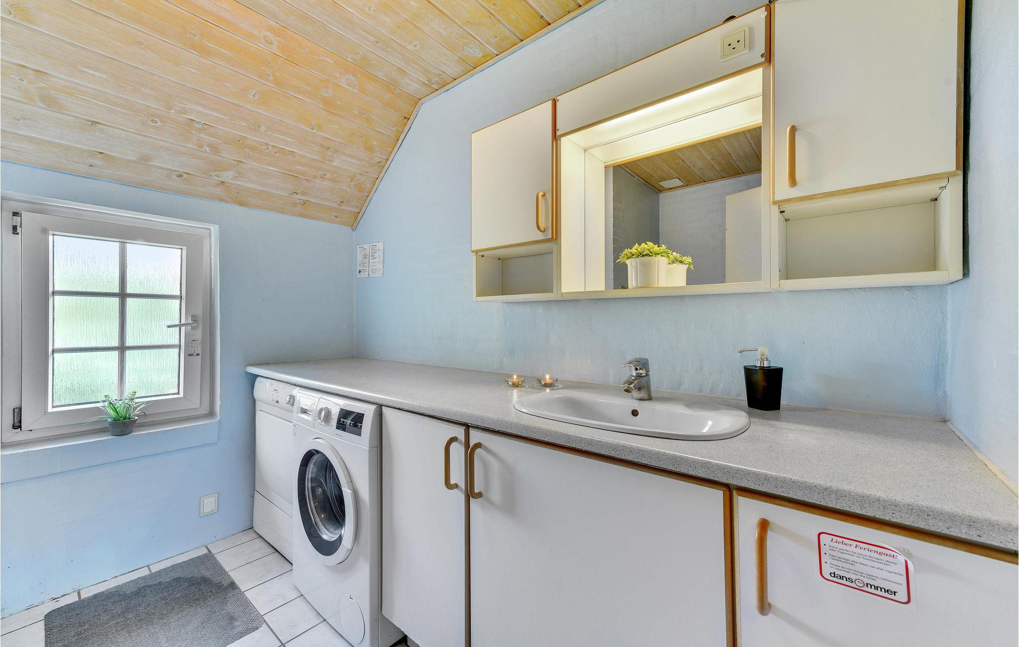 I husets midte ligger køkkenet i åben forbindelse til stuen og spiseområdet, i hver ende af huset er der en soveafdeling med hver tre soveværelser samt et badeværelse med bruser. I poolafdelingen er der, ud over den 17 m2 store swimmingpool, en sauna og et spabad. Så her kan der bruges mange timer på afslappende wellness-stunder efter en aktiv dag på stranden. I stuen er der både brændeovnen, som sørger for en rar atmosfærre og hurtig opvarmning, samt en varmepumpe som supplerende varmekilde. Huset har både vaskemaskine og tørretumbler, så I behøver ikke at have en hel kuffert fyldt med vasketøj med hjem.