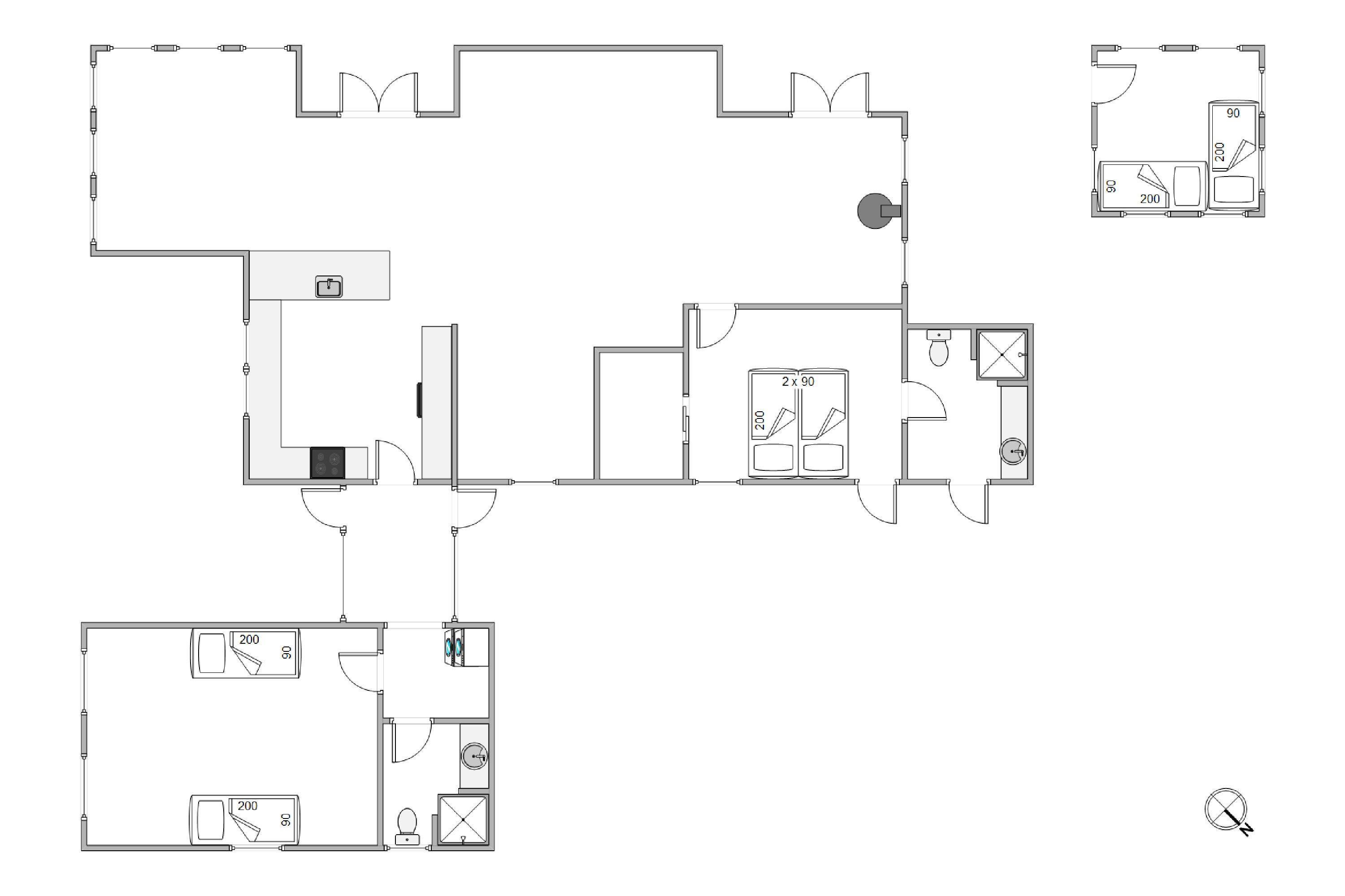 Sommerhuset er perfekt designet til at rumme op til 6 feriegæster, fordelt mellem tre soverum. En dobbeltseng i det ene soveværelse og de resterende to soveværelser er hver indrettet med to enkeltsenge, hvilket der sikrer en komfortabel indkvartering for alle. To af sovepladserne findes i det tilstødende anneks.