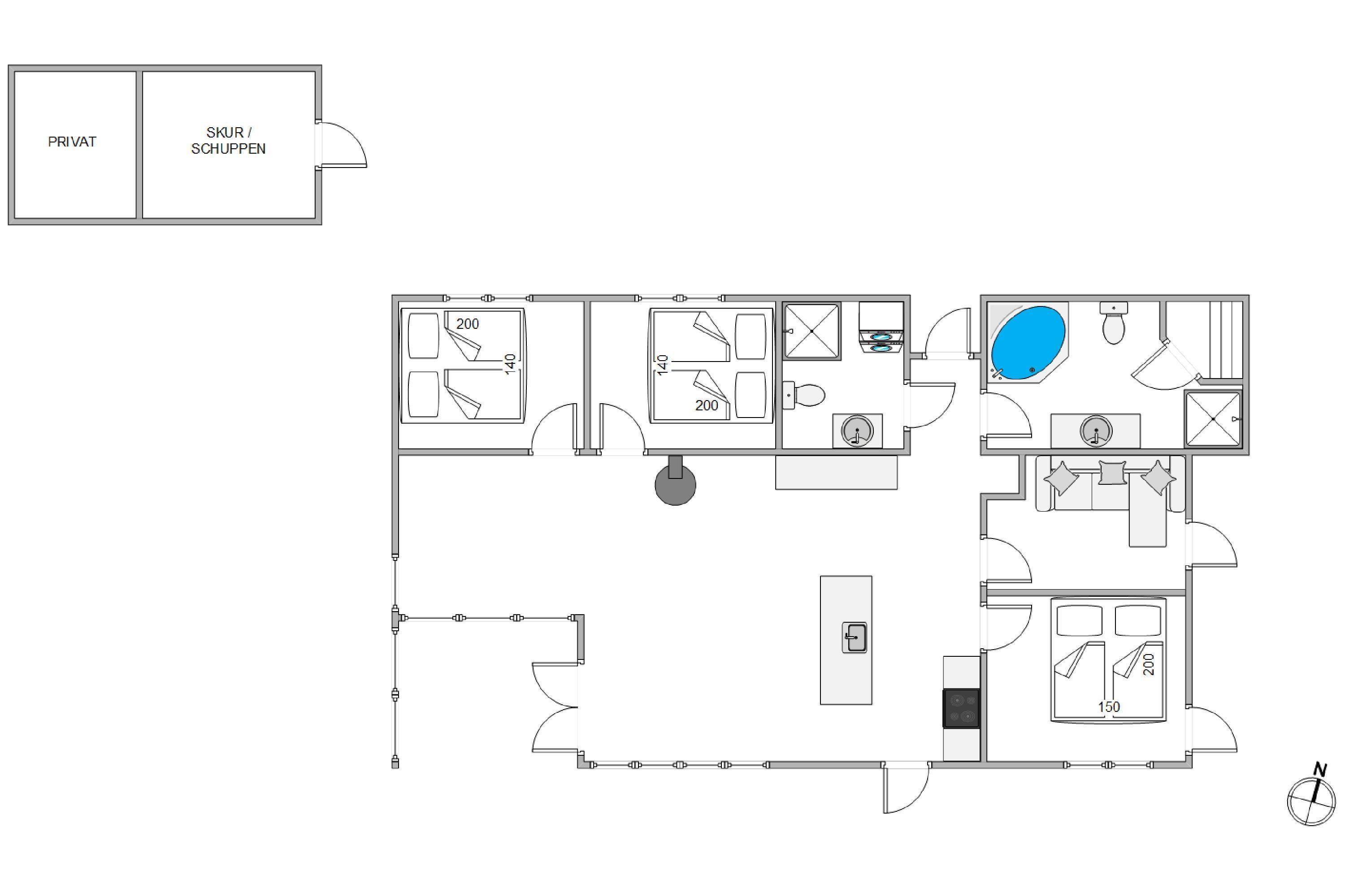 Sommerhuset er designet til at imødekomme behovet for komfort og luksus. Det rummer tre gode soveværelser, hvoraf hvert er udstyret med en dobbeltseng, perfekt til en familie eller en lille gruppe på op til fem personer. Med to badeværelser er huset udstyret til at håndtere hverdagens krav, og luksusfaciliteter som gulvvarme, sauna og en spa sikrer et afslappende og dejligt ophold. Opvaskemaskine, vaskemaskine og tørretumbler er der også for jeres bekvemmelighed, så I ikke skal tænke på beskidt tøj.