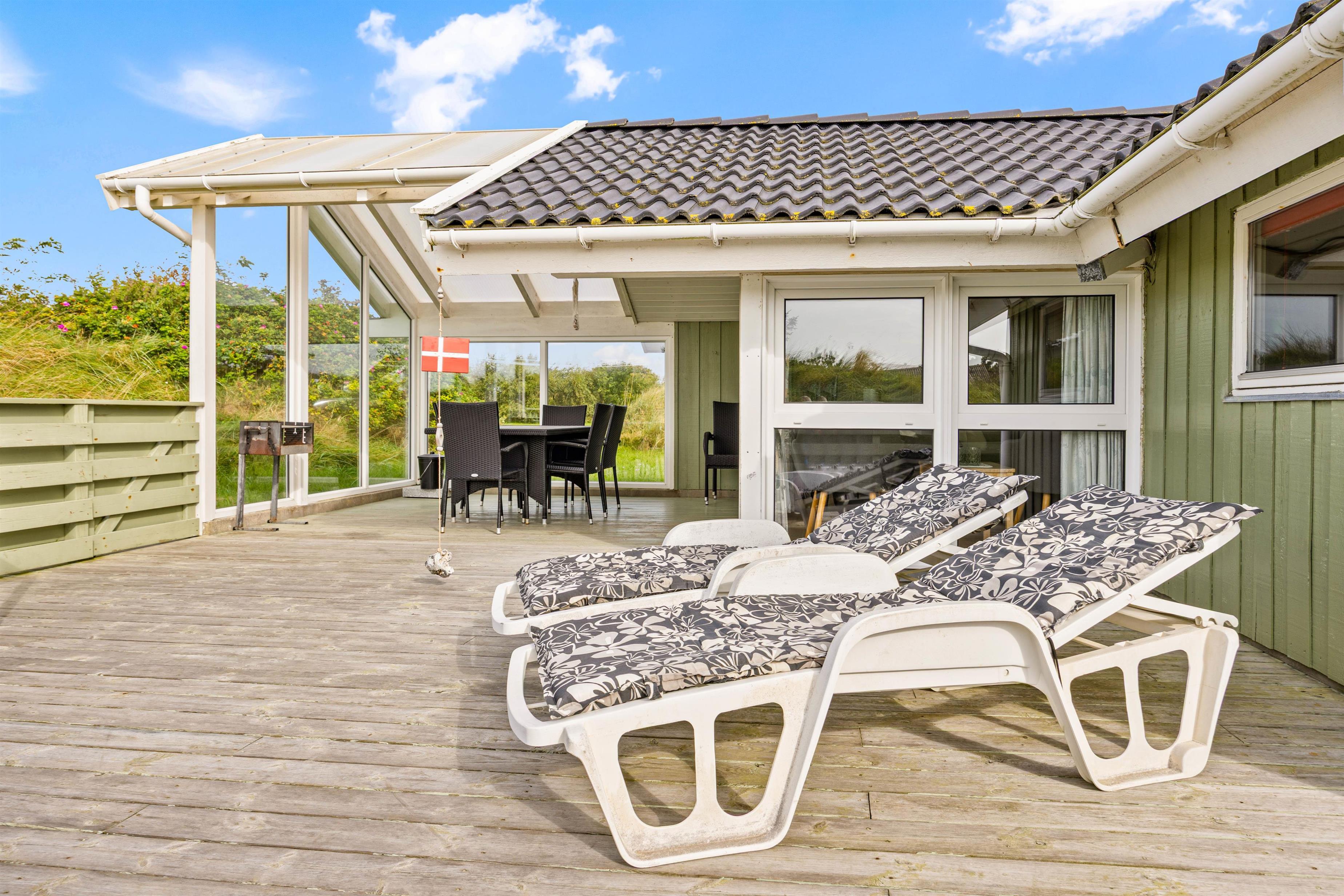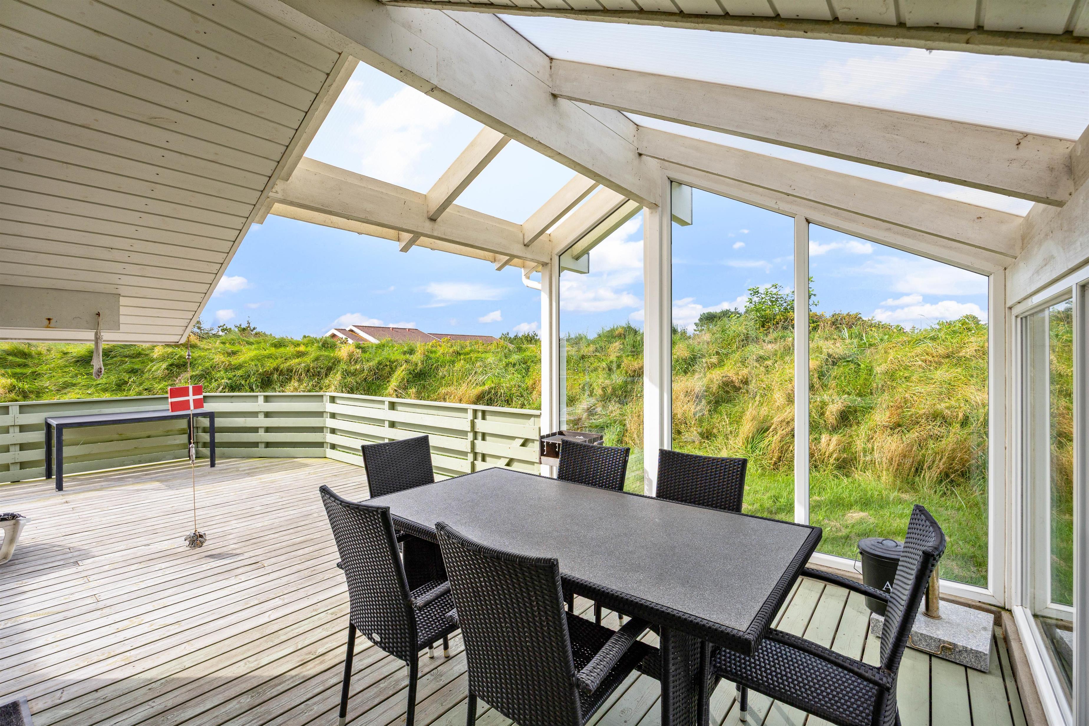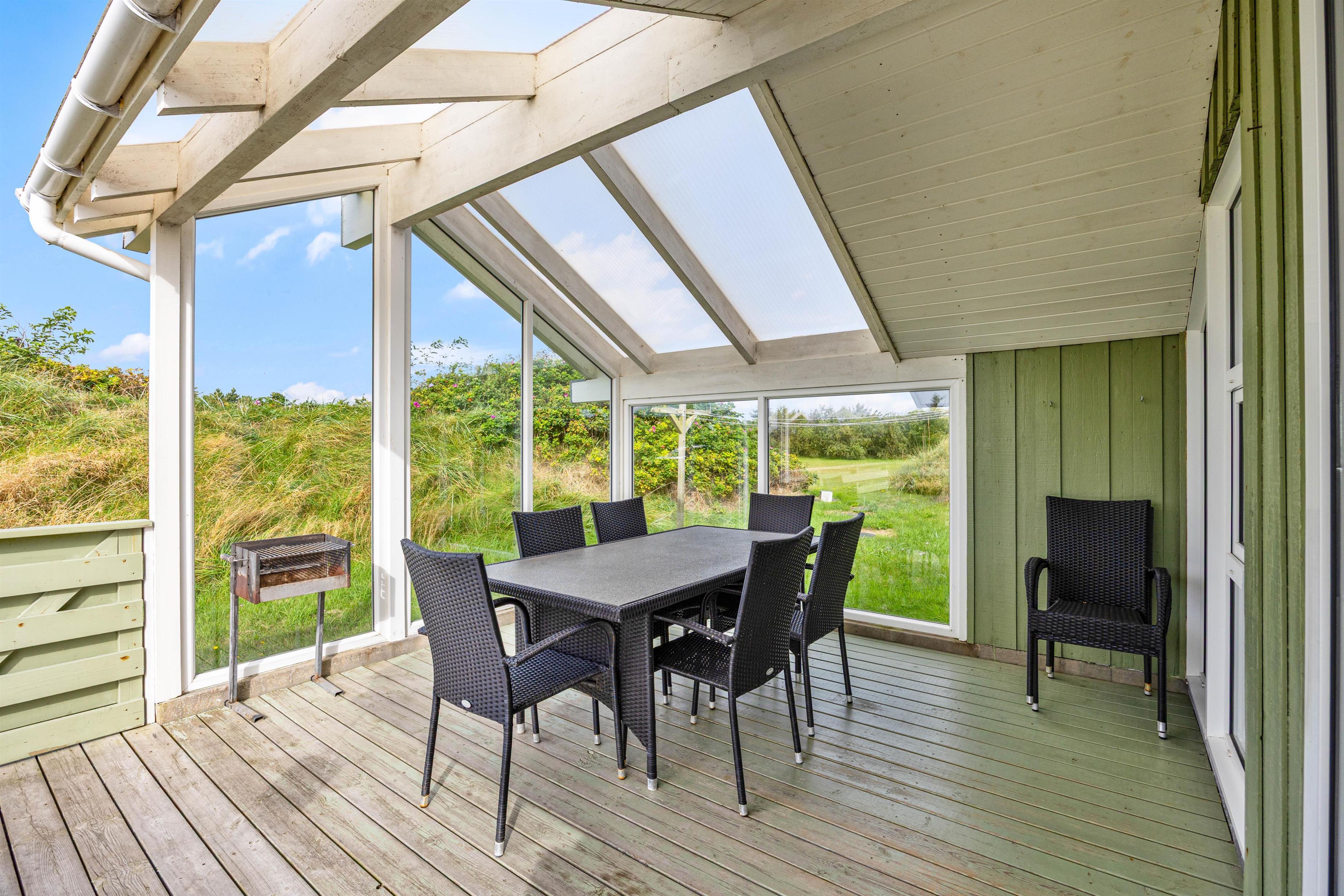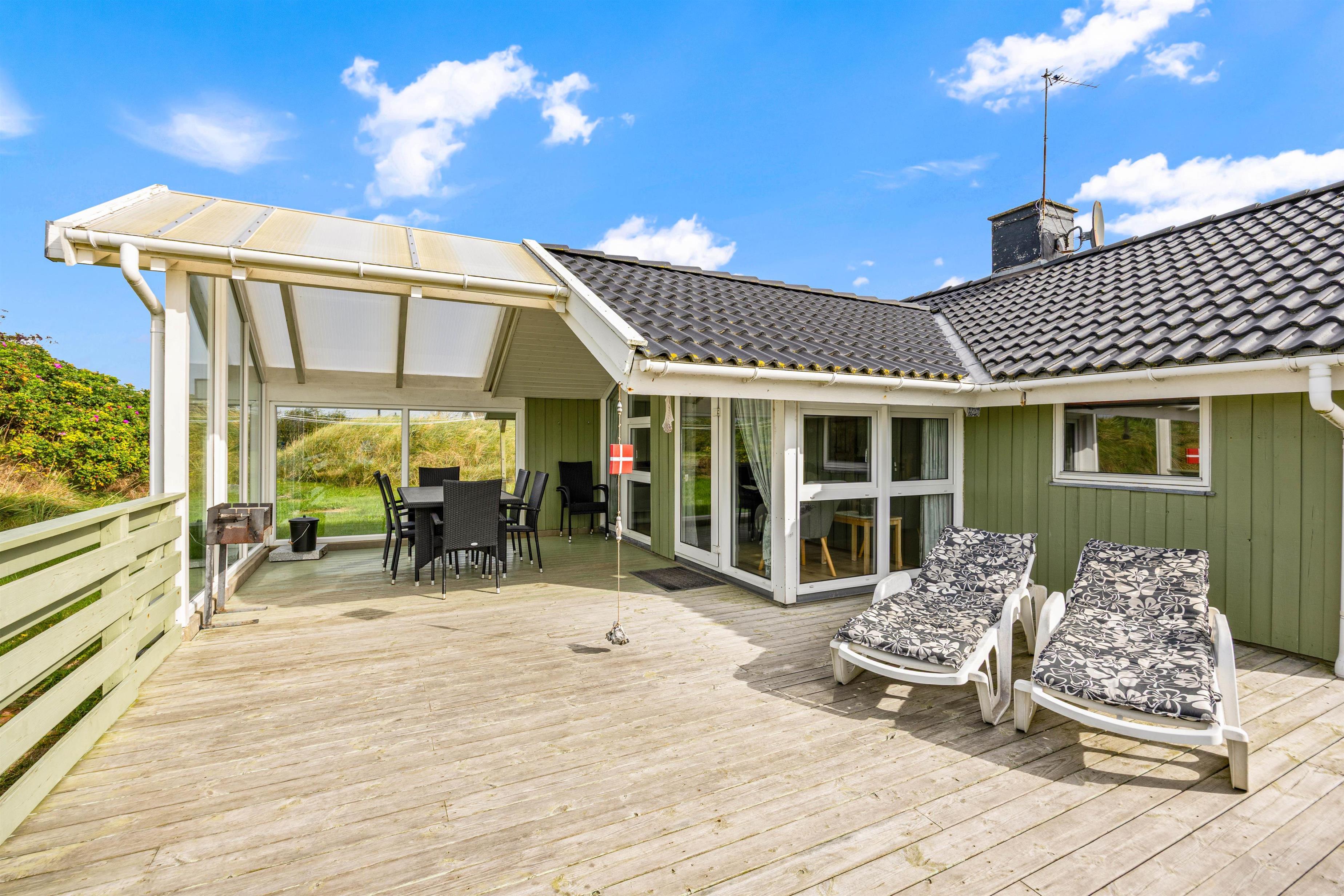 Sommerhuset byder på en lukket terrasse, hvor I kan nyde jeres måltider i det fri takket være grillen og de tilhørende havemøbler. Den overdækkede terrasse er perfekt til de lidt køligere aftener hvor man bare ikke har lyst til at være indenfor. Her kan man virkelig nyde solen og den friske luft fra Vesterhavet. Beliggende blot 900 meter fra havet, er der rig mulighed for at tage en forfriskende dukkert eller gå en tur langs stranden. På den naturskønne grund kan I også nyde stilheden eller lade børnene lege frit og sikkert.