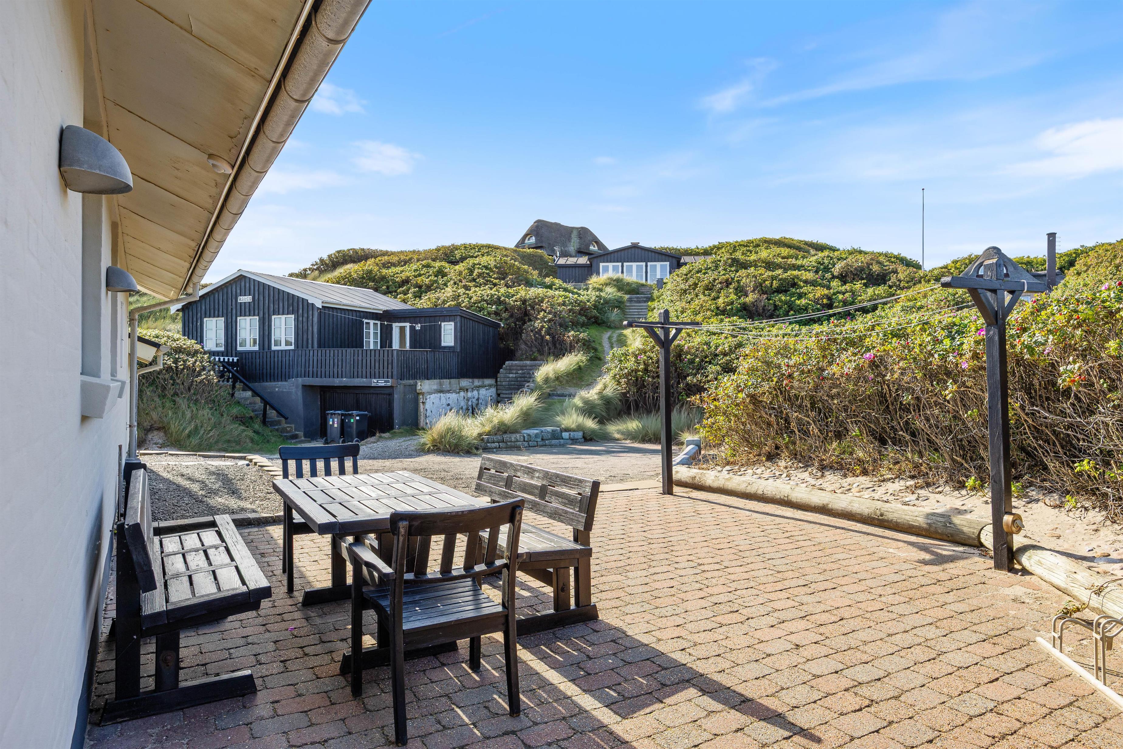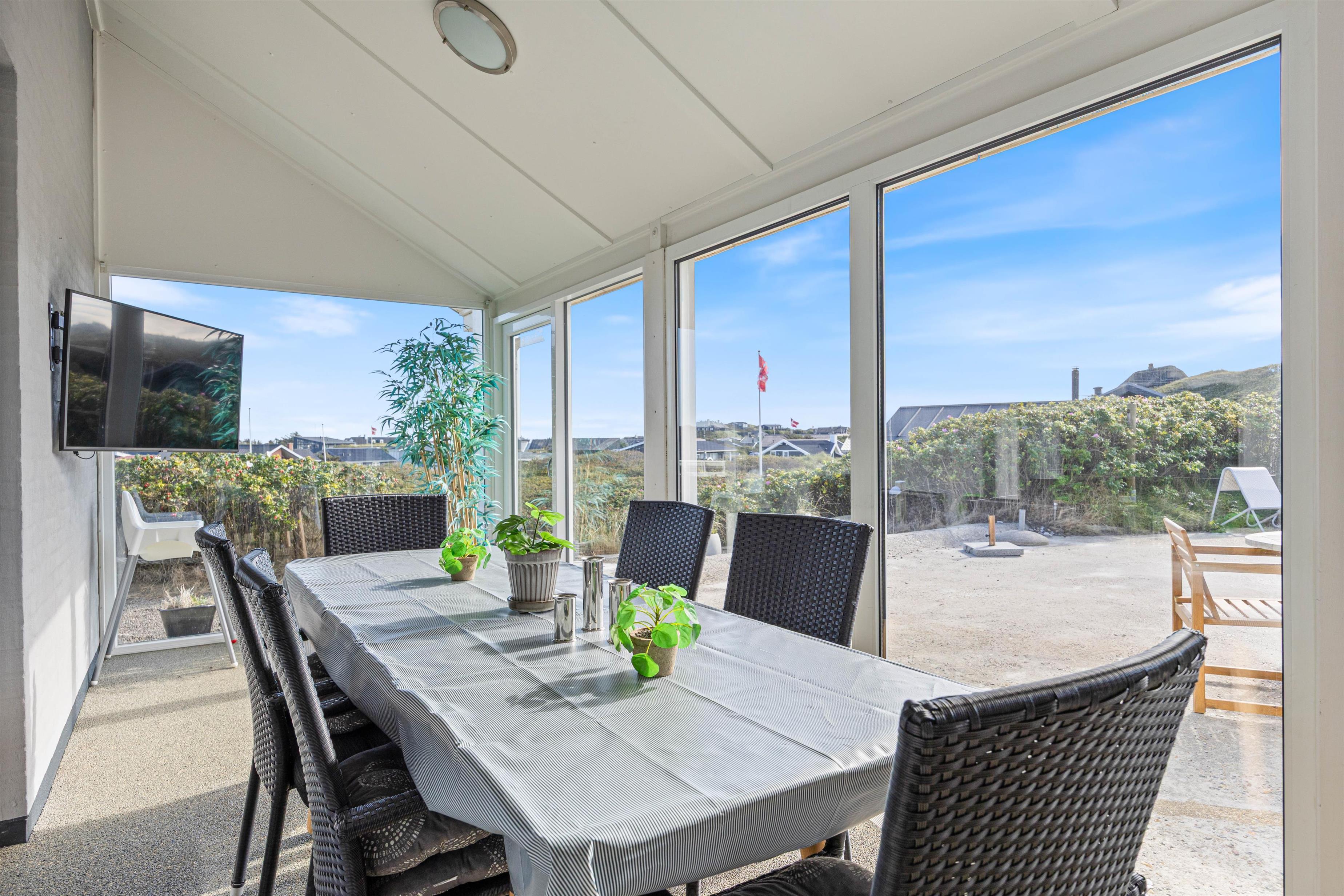 Feriehuset har to dejlige terasser mod nord/øst og syd/vest. Fra terrasserne kan I følge solens gang hele dagen. Ydermere kan I læne jer tilbage i de tilhørende havemøbler og liggestole til sommerhuset samtidig med, at andre står for tilberedning af et lækkert måltid på grillen. Sommerhuset ligger blot et stenkast fra det storslåede Vesterhav og populære badestrand.