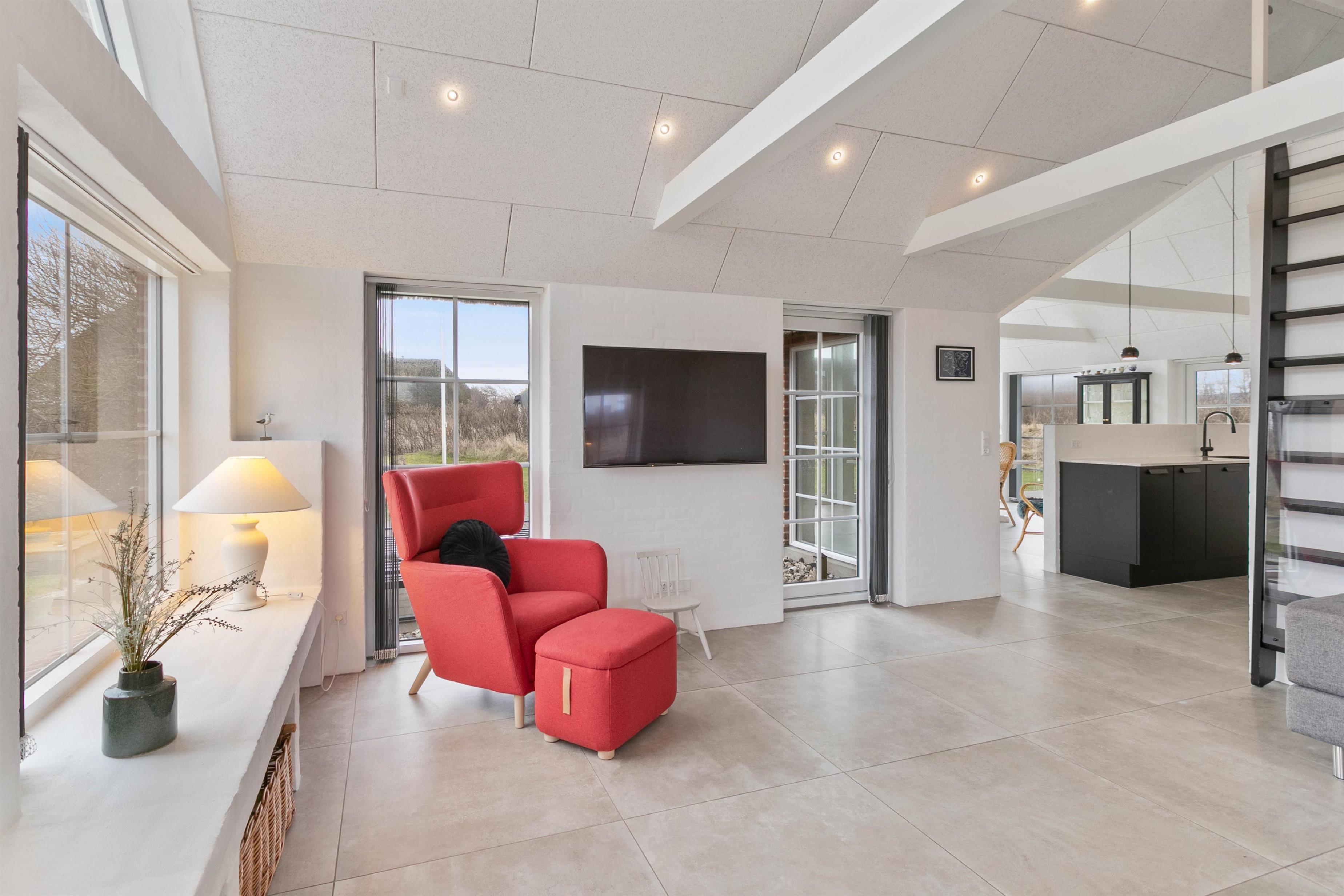 Husets hjerte bliver dannet af det åbne køkken- og stuerum, som har flere hyggelige kroge og bliver centrum for samvær i løbet af ferien. Der er chromecast på alle tv - på den måde har I mulighed for at alle kan se deres yndlingsfilm. Store vinduespartier inviterer solens stråler og det smukke klitlandskab indenfor, og loftet ført til kip skaber endnu mere rummelighed og en behagelig ferieatmosfære. For et ekstra godt indeklima sørger husets ventilationsanlæg, der giver samme fugtighed i hele huset, hvilket især asmatikere vil nyde godt af.