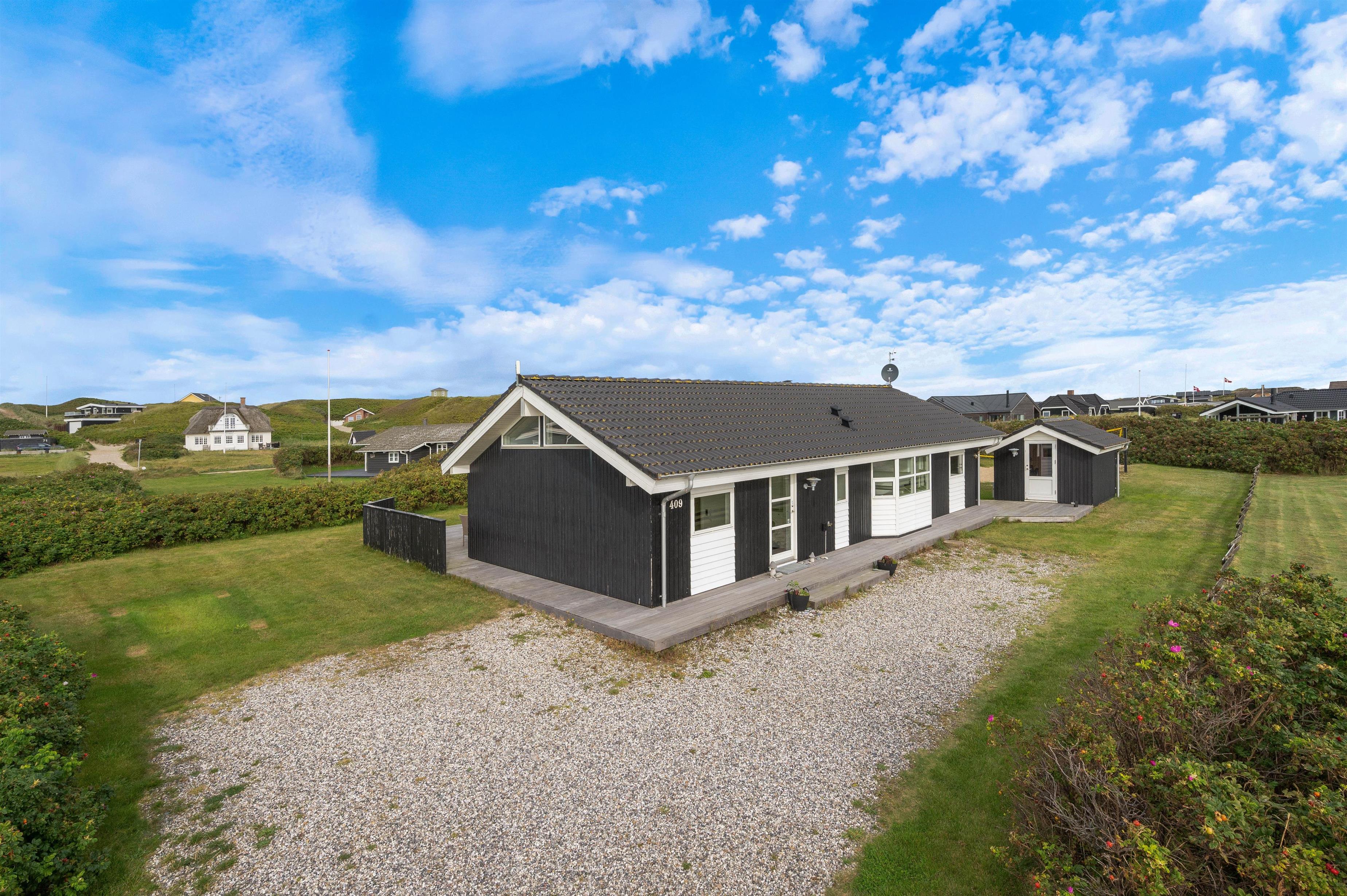 Sommerhuset på Lodbergsvej 409 har en delvist overdækket terrasse, som forlænger jeres sommerdage udendørs. Her kan I sammen nyde en lækker frokost i det fri eller hygge med familien over et lækkert måltid fra den tilhørende grill. Den store plæne, der omkranser feriehuset har både volleyball-bane og masser af muligheder for timevis af leg og hygge.