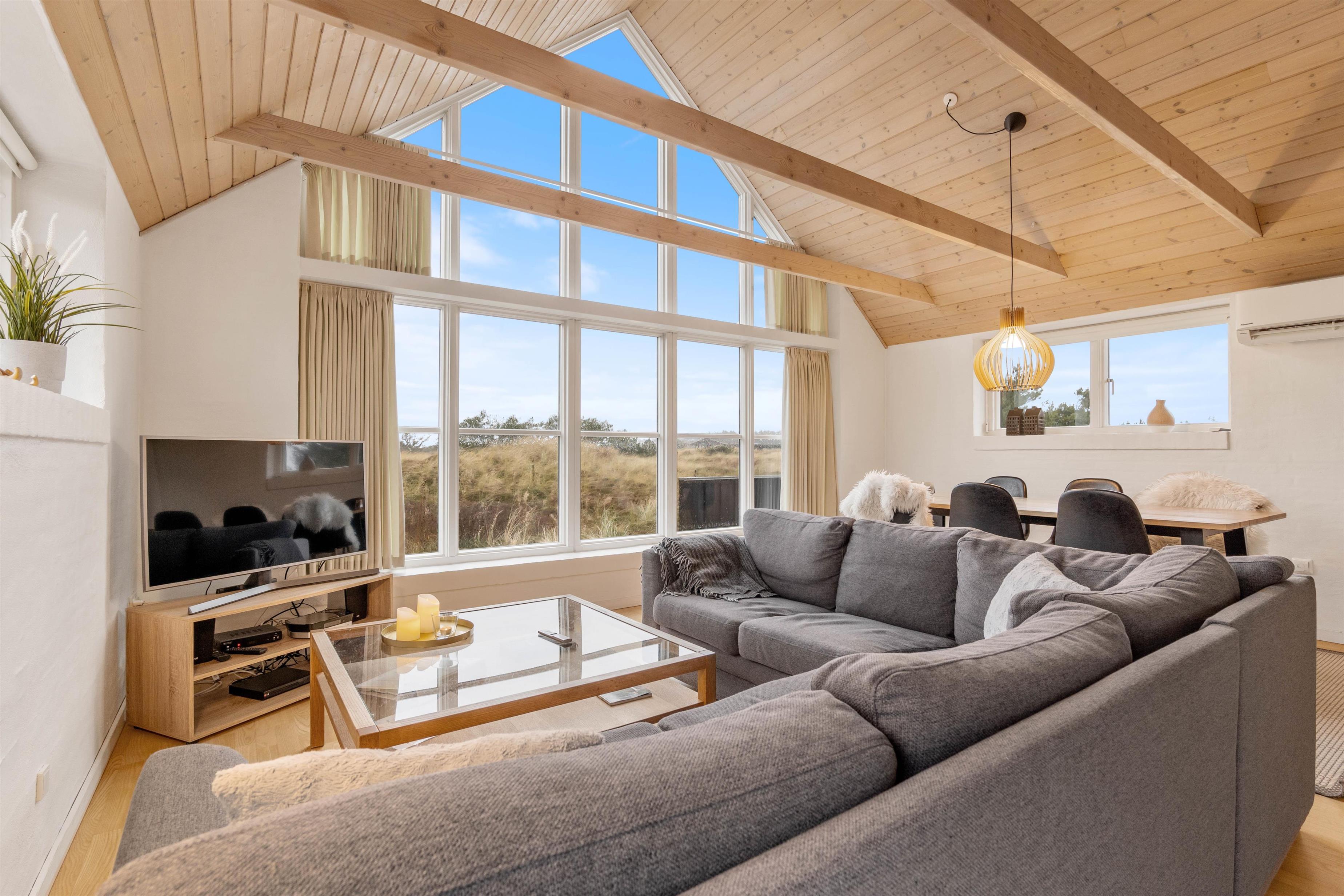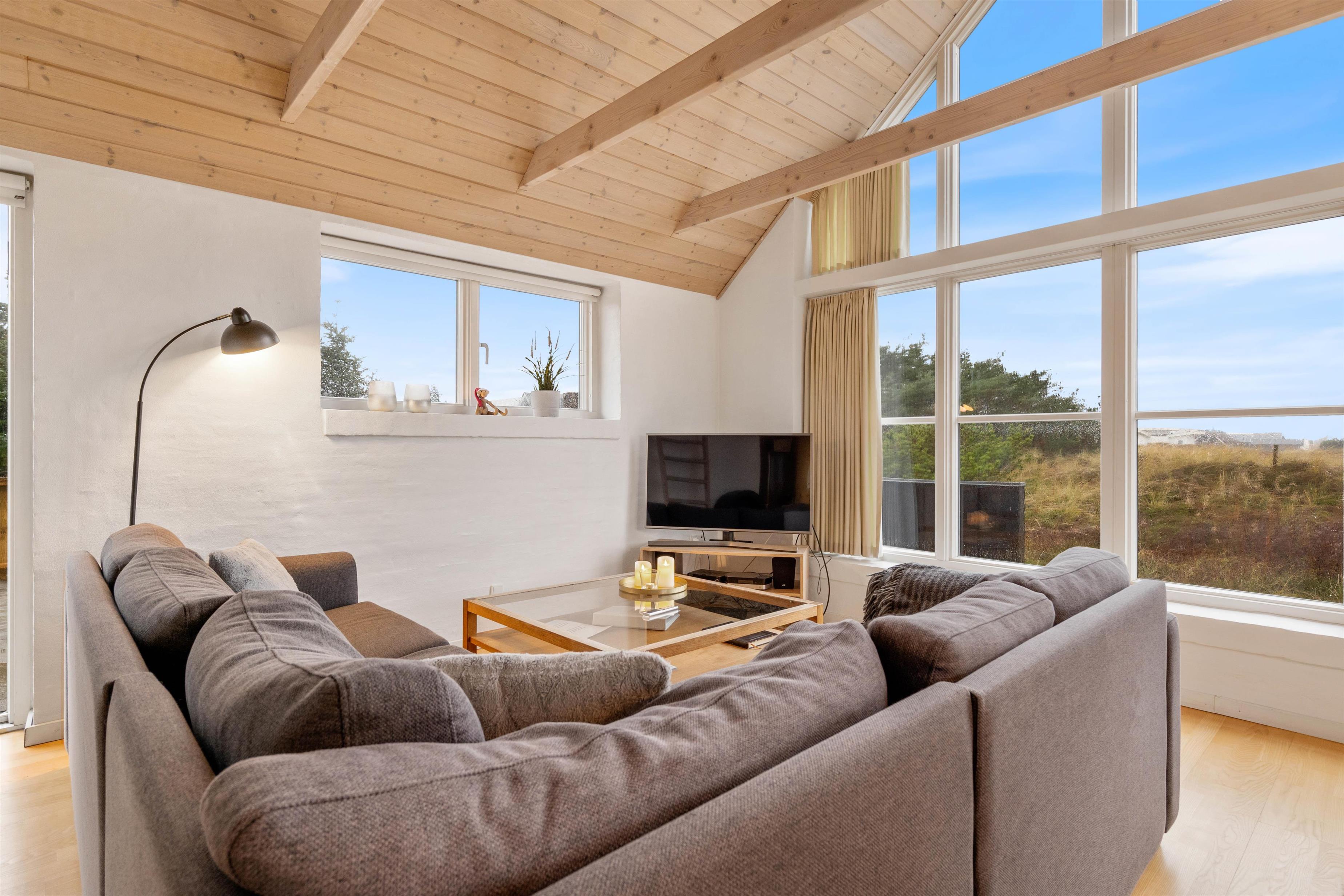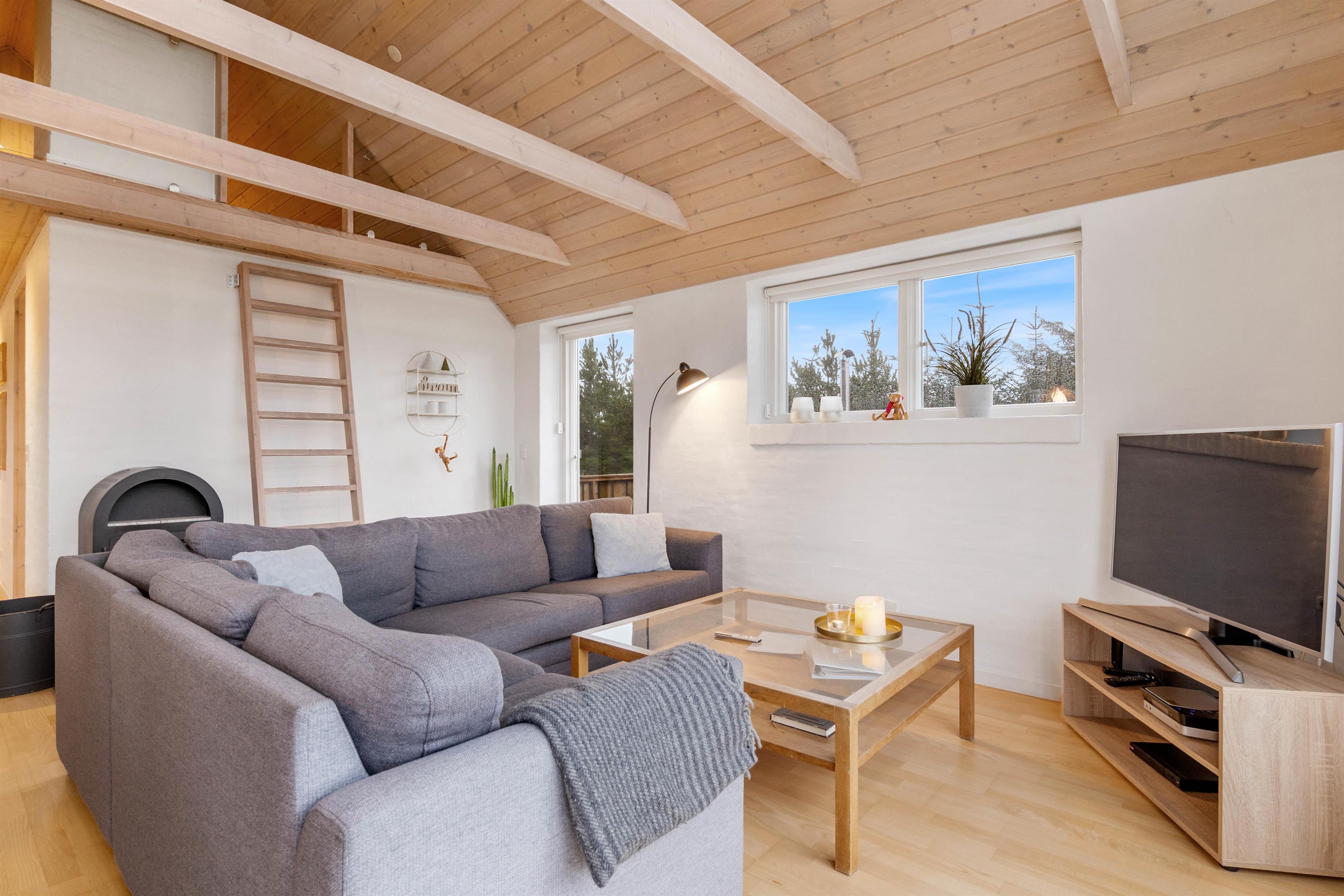 Stuen har et behageligt sofamiljø, med fantastisk lysindfald fra de store vinduer, hvilket skaber en lys og luftig atmosfære. En af de bedste ting ved dette sommerhus er brændeovnen, som er placeret i stuen. Dette er det perfekte sted, at samles til aftenen, når temperaturen falder, varme sig og hygge sig med en god bog eller en film. Men det bedste ved dette sommerhus er det lækre "wellness"- badeværelse. Det er udstyret med et spabad og sauna, så du kan slappe helt af og nyde den ultimative spa-oplevelse og komme helt ned i tempo og slippe hverdagen stress og jag.