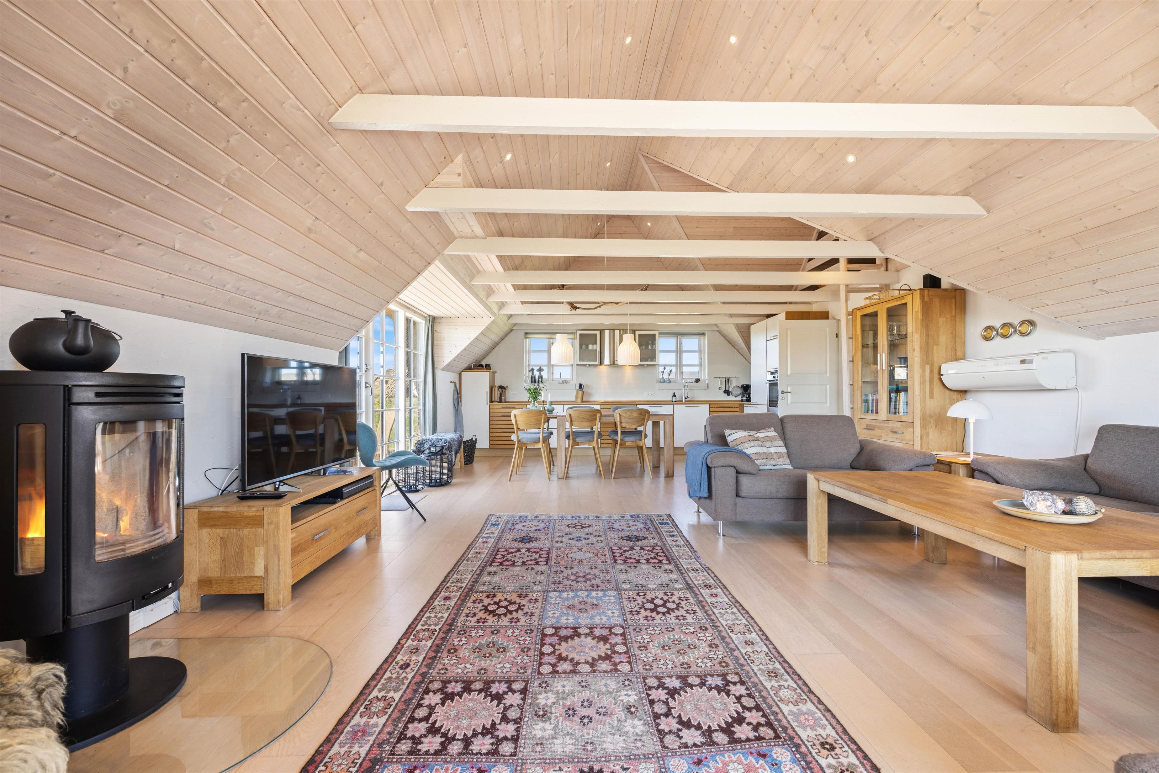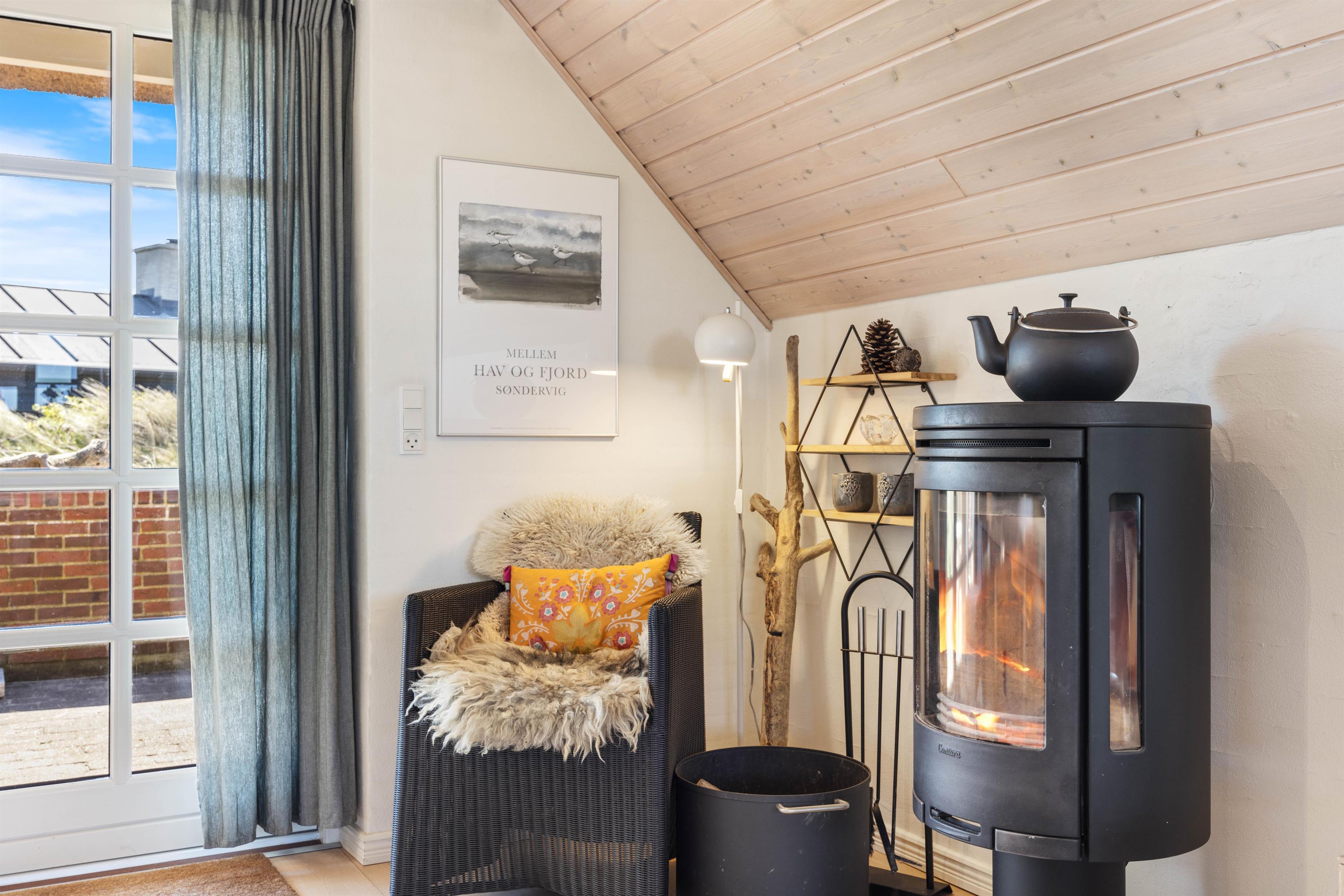 Atmosfæren er afslappet og hyggelig, og de flotte detaljer sætter prikken over i'et på en smagfuld indretning. Den klassiske brændeovn sørger for varme og god feriestemning hele året rundt, og gennem de mange vinduer har I udsigt til det smukke klitlandskab, mens de samtidigt også sørger for et godt lysindfald.