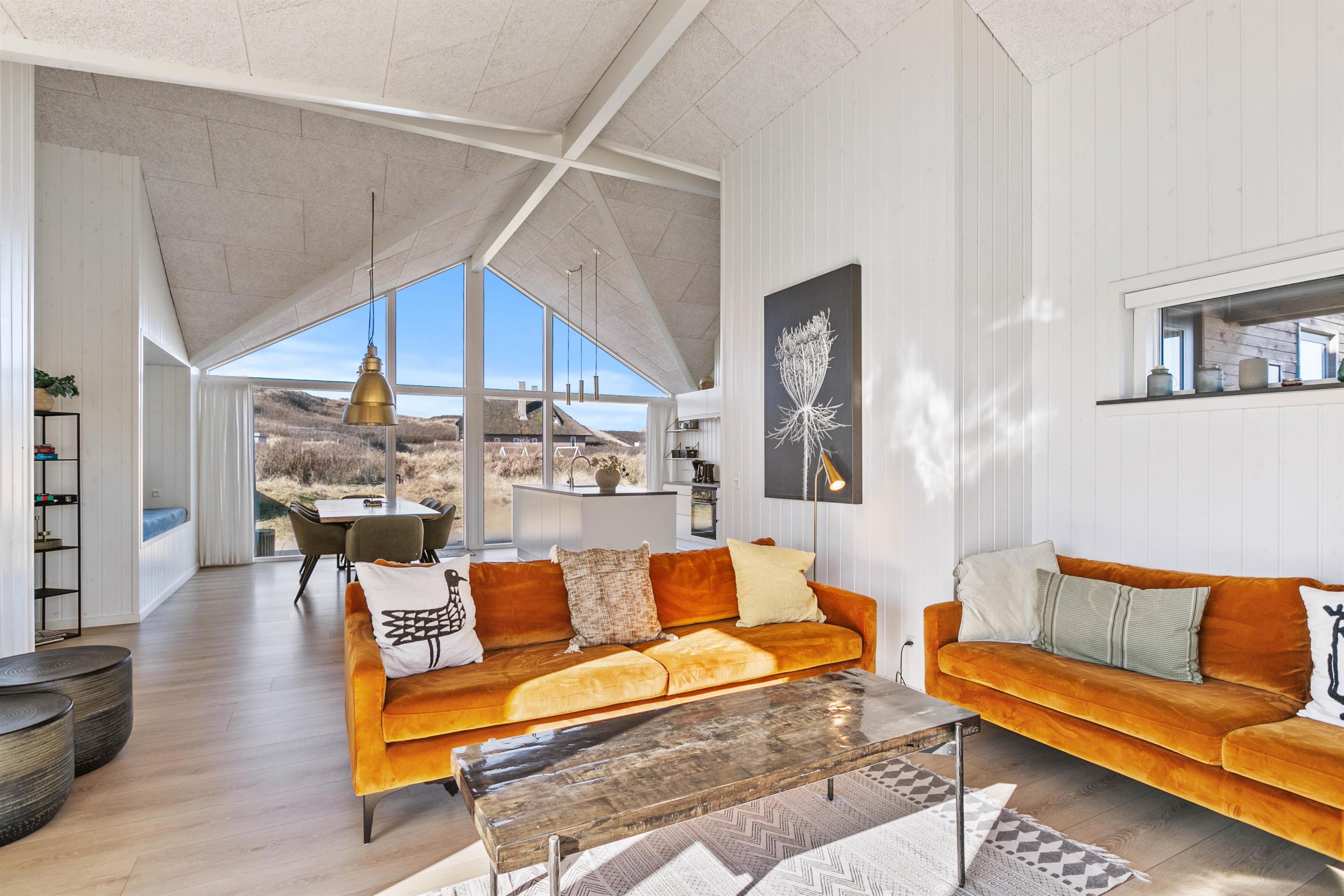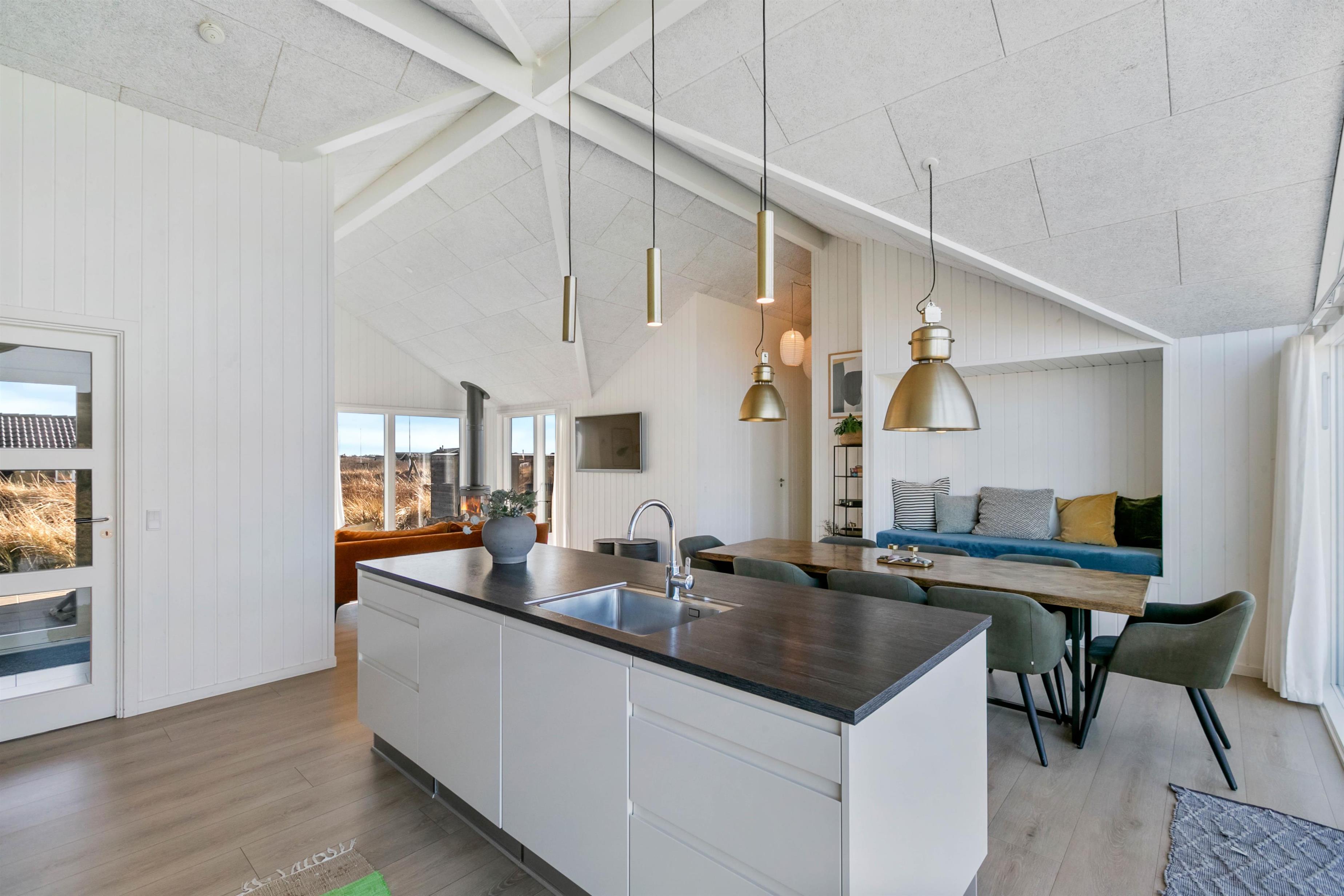 Dette flotte feriehus rummer med sine 121 m2 plads til otte personer, og her er alt, hvad feriehjertet begærer. Den skandinavisk-inspirerede indretning er både stilfuld og hyggelig, og I vil hurtigt falde til i de skønne ferieomgivelser. Feriehuset er opført i 2019, og derfor er det yders moderne og velholdt. Her er naturligvis akoustik-venlige troldtekst lofter, der giver et god lyd og akoustik. Derudover går loftet hele vejen til kip, hvilket skaber en fantastisk rumfornemmelse.