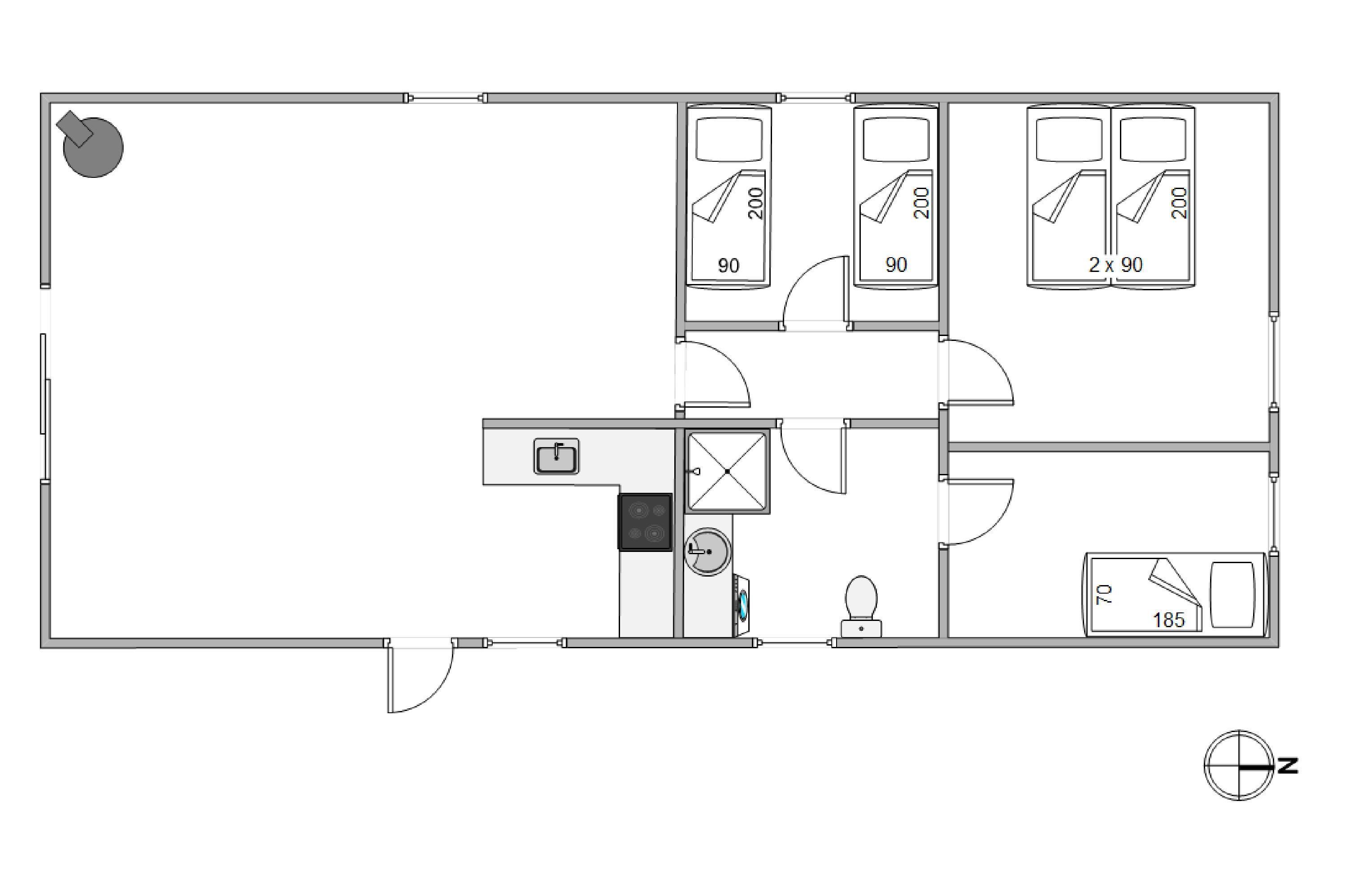 Sommerhuset er lyst og venligt indrettet, og der er helt sikkert garanti for hygge. Den store kombinerede køkken, stue– og spiseafdeling er perfekt til socialt samvær. Her kan man følge med i madlavningen, samtidig med at der hygges med et spil Ludo. Sommerhuset er fordelt på 3 soverum hvorafdet ene har dobbeltseng, og et værelse har 2 x 90 senge, mens det sidste har en slags køjeseng, som er egnet til mindre børn.