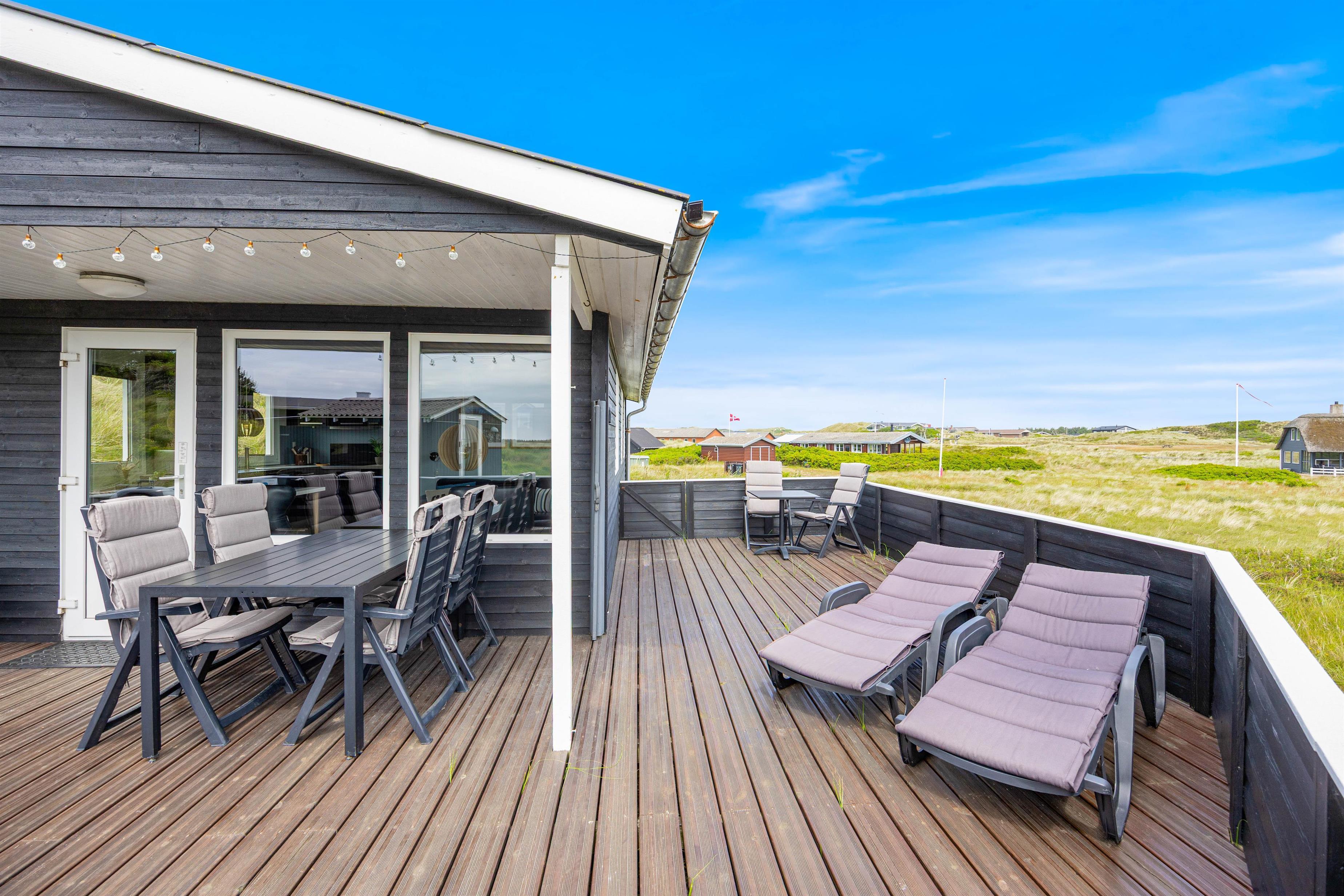 En del af den dejlige, lukkkede terrasse er overdækket. Det holder på varmen på gode sommeraftener, så I kan sidde ude lidt længere. Hele terrassen er indhegnet, så I kan roligt sætte jer tilbage i terrassemøblerne, imens børnene helt uforstyret kan lege her på terrassen. Sommerhuset ligger på en 2.500 m2 stor naturgrund, hvor børnene også kan boltre sig med fodbold og masser af udeleg. Kun fantasien sætter grænserne. Sommerhuset befinder sig kun 300 meter fra det brusende Vesterhav. En gåtur gennem det unikke klitlandskab til stranden er hvert et skridt værd - Også uanset hvilken tid på året I besøger den danske vestkyst.