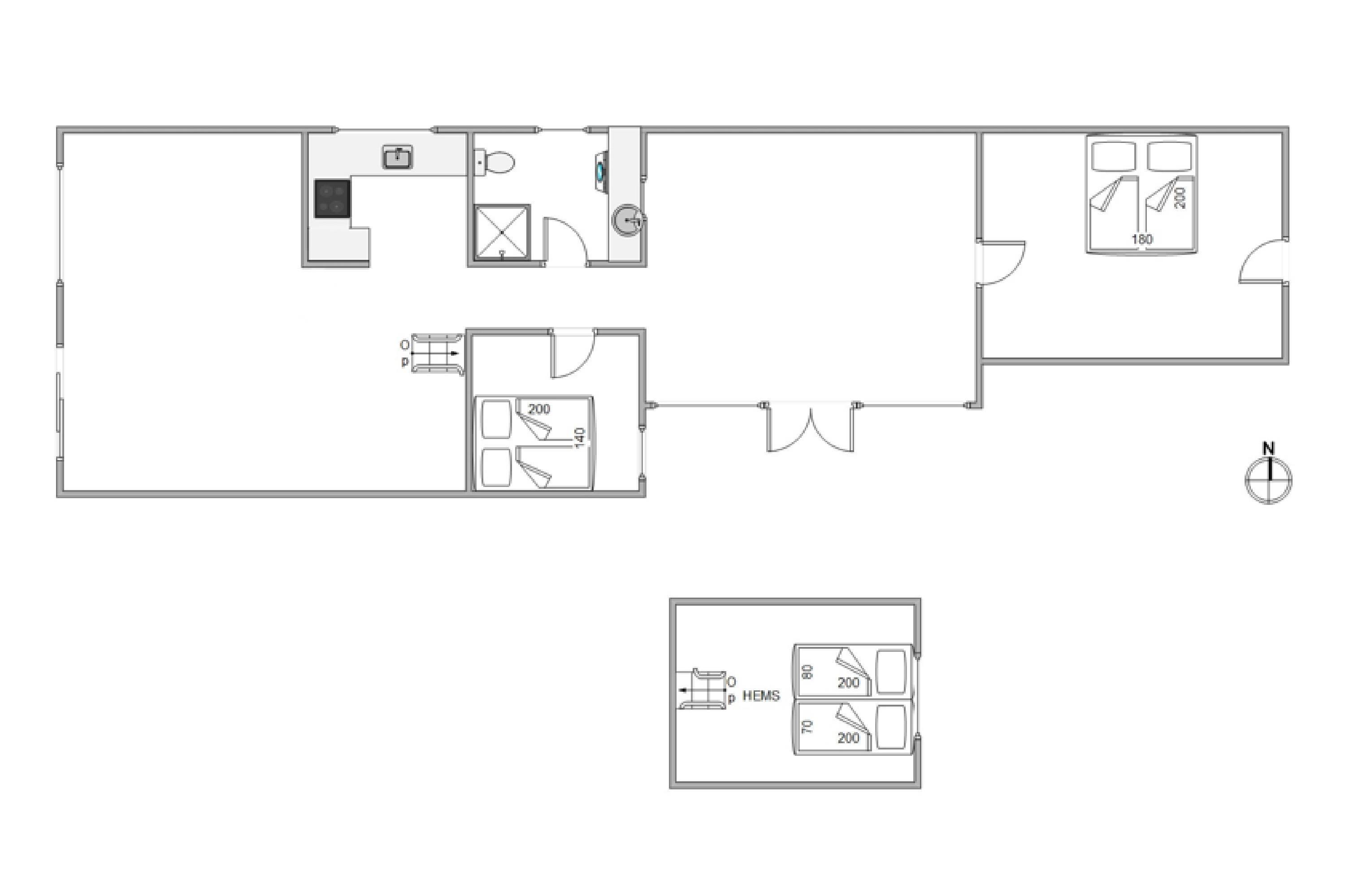 Sommerhuset er indrettet med to gode soveværelser samt en hems med dobbeltseng. I sommerhuset finder I også et lyst og lækkert badeværelse med opvarmet flisegulv. Og hvis en i familien spiller klaver, står der i stuen et klaver, I frit kan benytte.