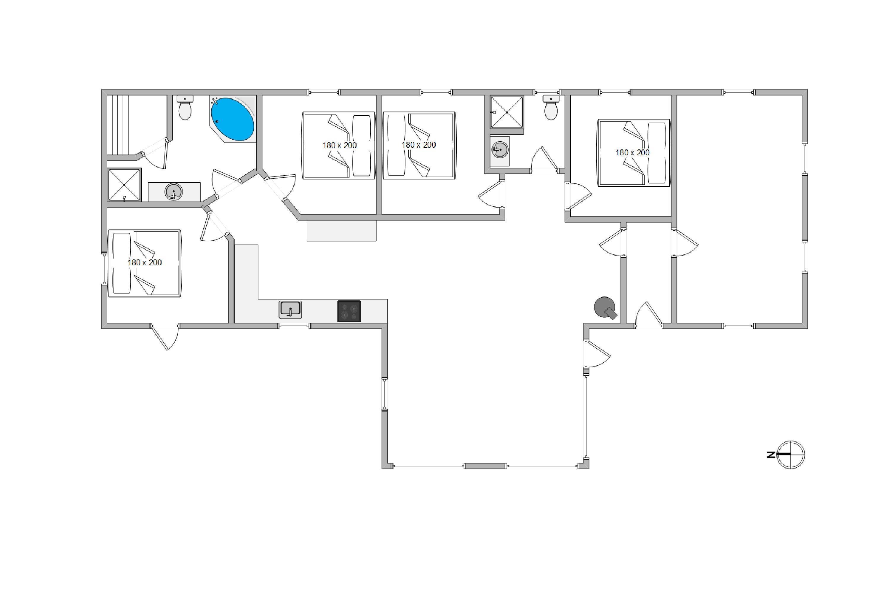 Indretningen i det 154 m2 store sommerhus er stilrent og rummeligt. Her er der højt til loftet og masser af plads til alle. De mange store vinduespartier i huset lukker lyset og de flotte omgivelser indenfor – selv på regnvejrsdage. Det store køkken, som ligger i åben forbindelse med stuen, er husets samlingspunkt. Her har du alt, hvad du forventer af et moderne køkken. Her begynder dagen med morgenkaffe og avislæsning og her kan I samles i løbet af dagen og snakke, mens maden tilberedes. I forlængelse af køkkenet er spisestuen med plads til 8 personer. De praktiske klinker i køkken og stue er desuden med gulvvarme.