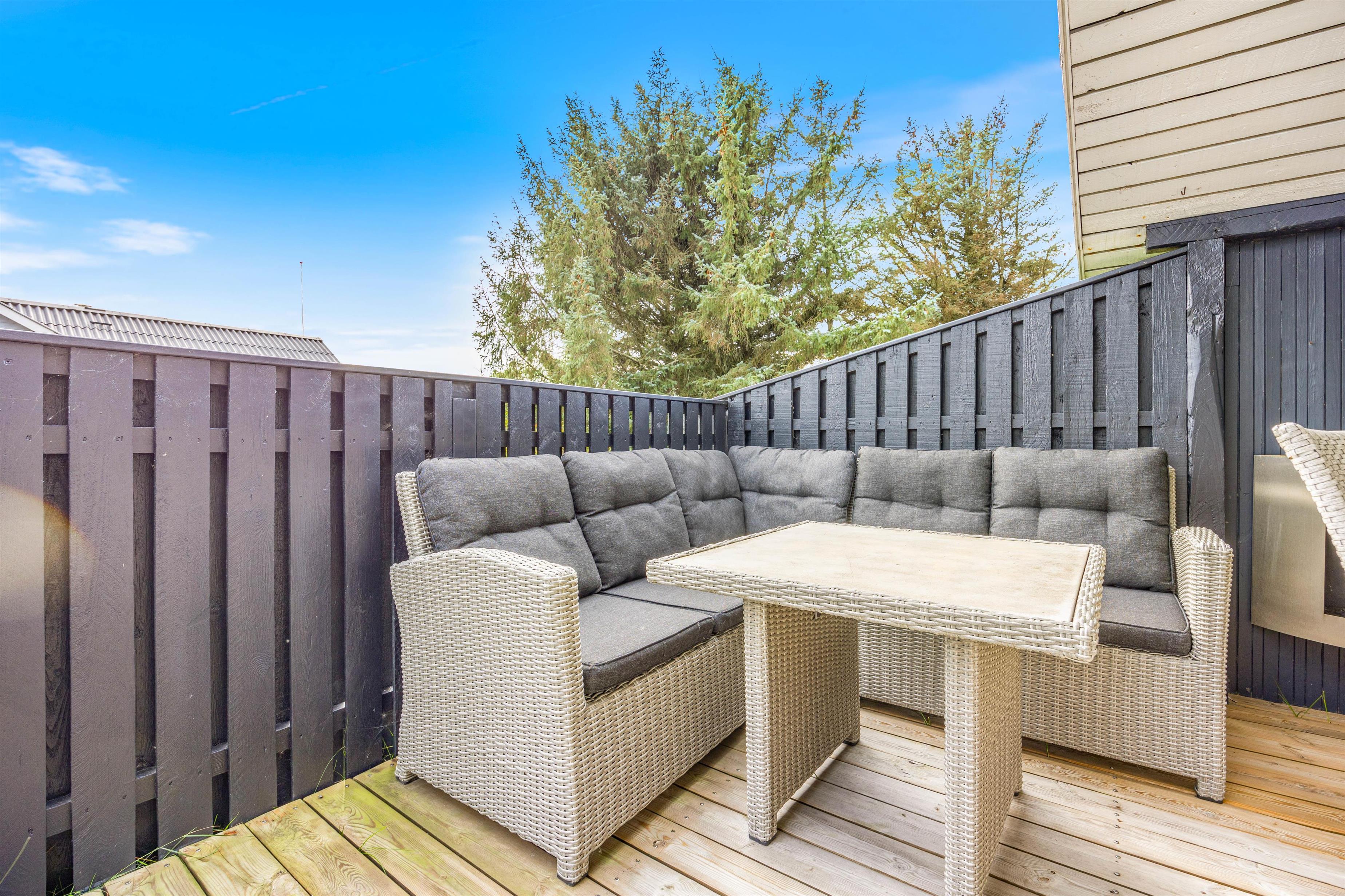 Der er to skønne terrasser. Den mod syd er helt lukket og delvis overdækket og delvis afskærmet. Den er derfor ideel det meste af dagen, ligesom den er særdeles god til lange grillaftener. Har man små børn med, kan de lege frit på terrassen. Mod nord er indgangspartiet til huset. Her er der en stor skøn terrasse, som er velegnet til morgenkaffen. På naturgrunden er der en gynge til de små.