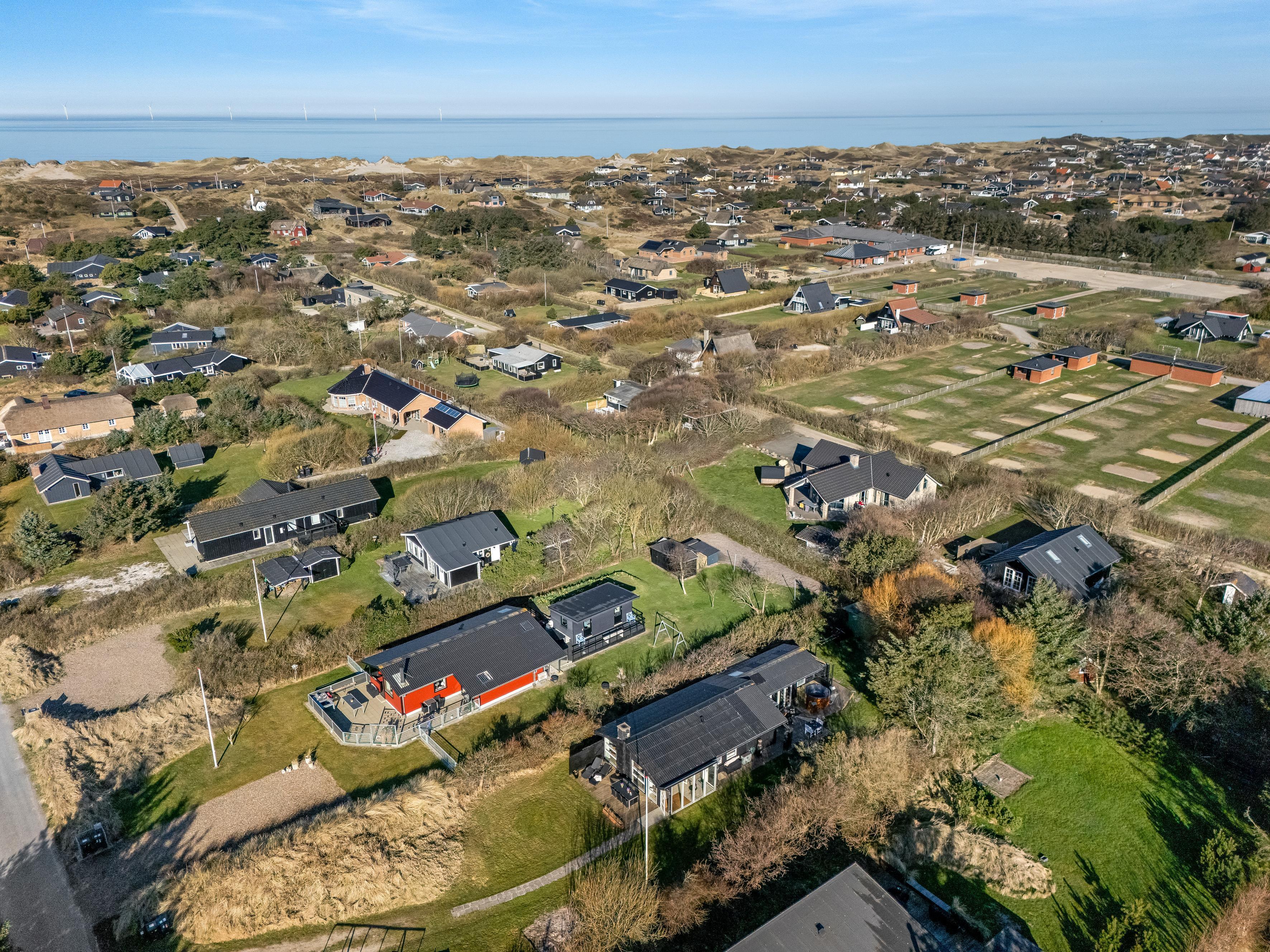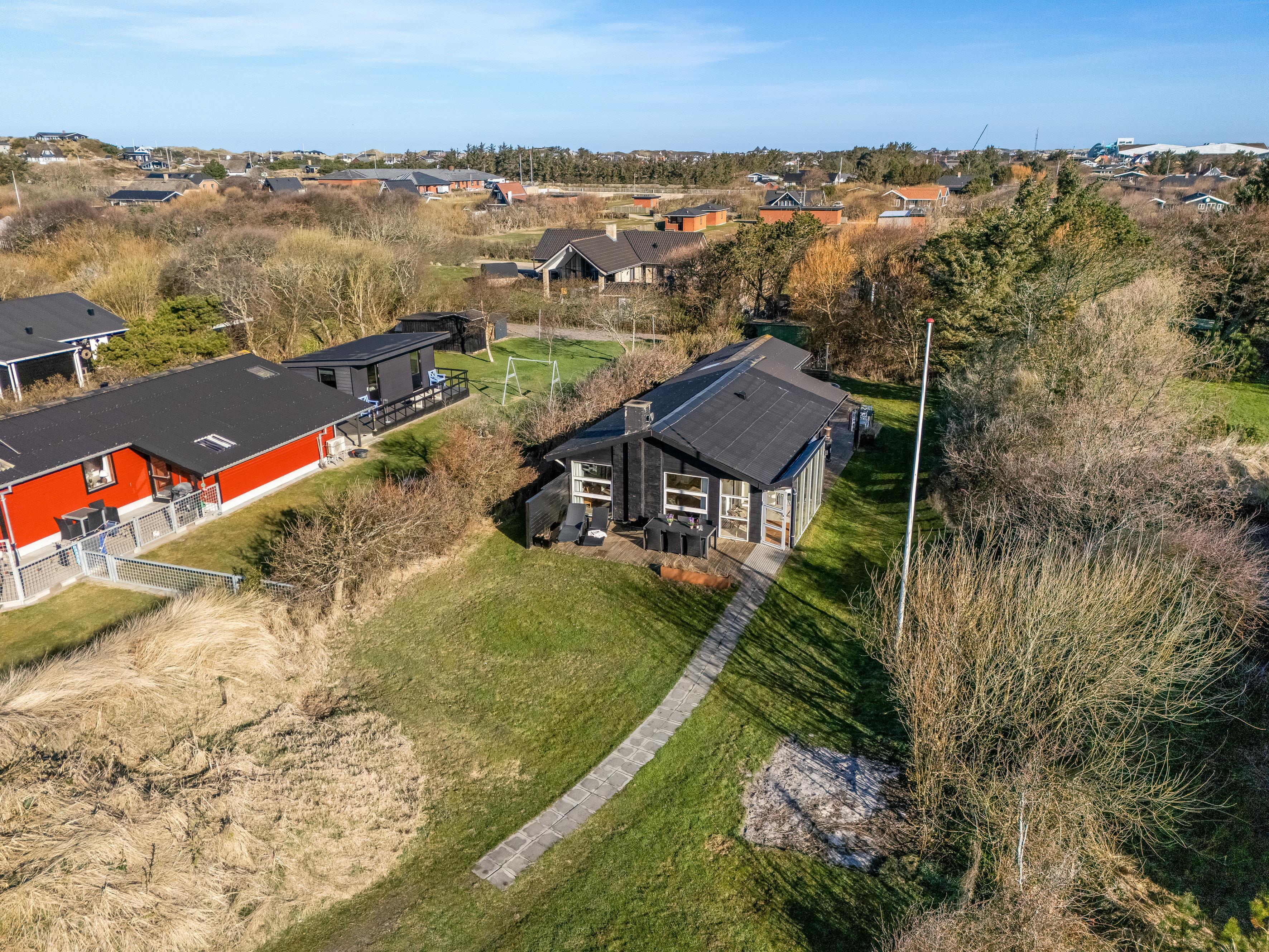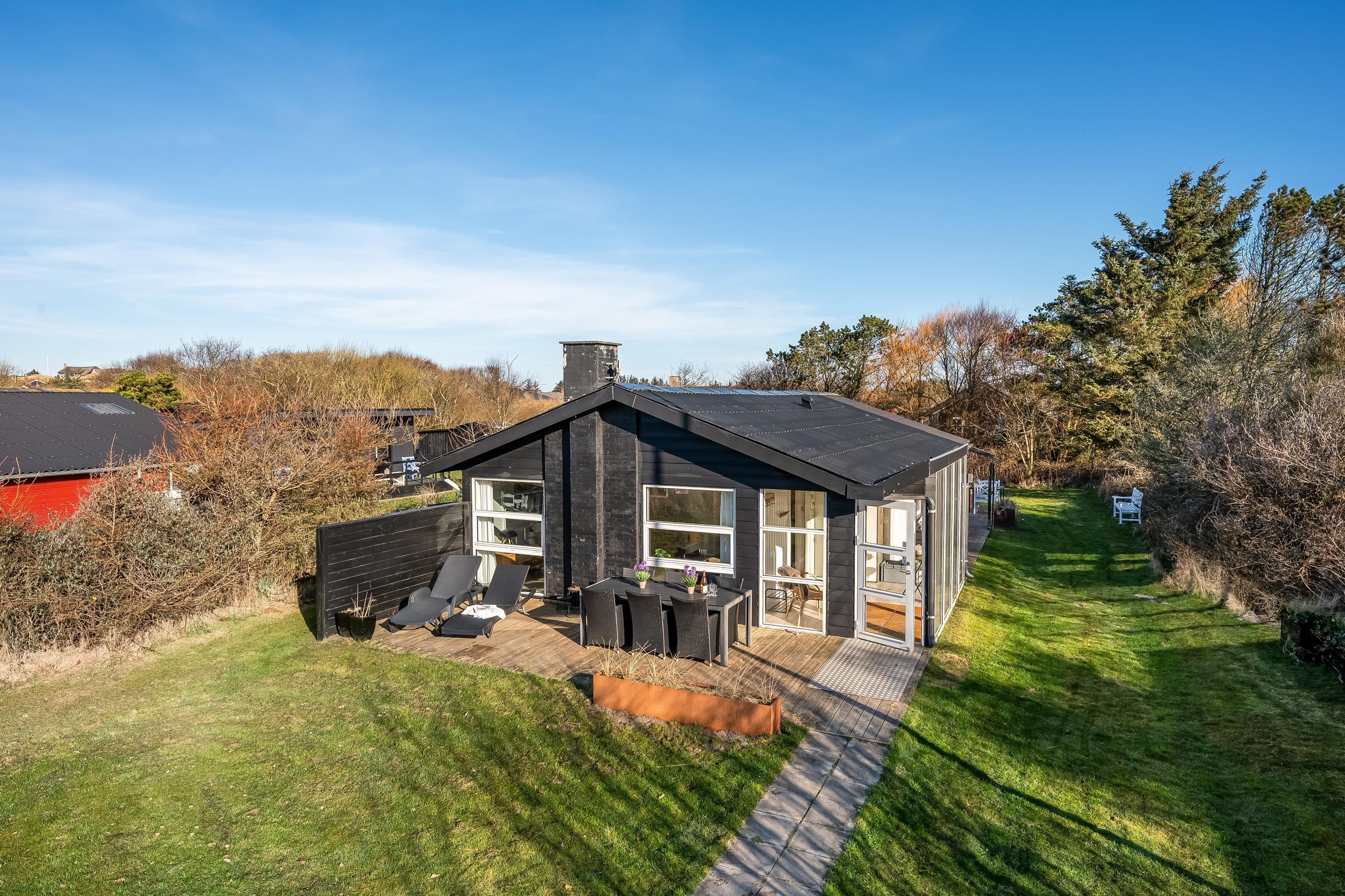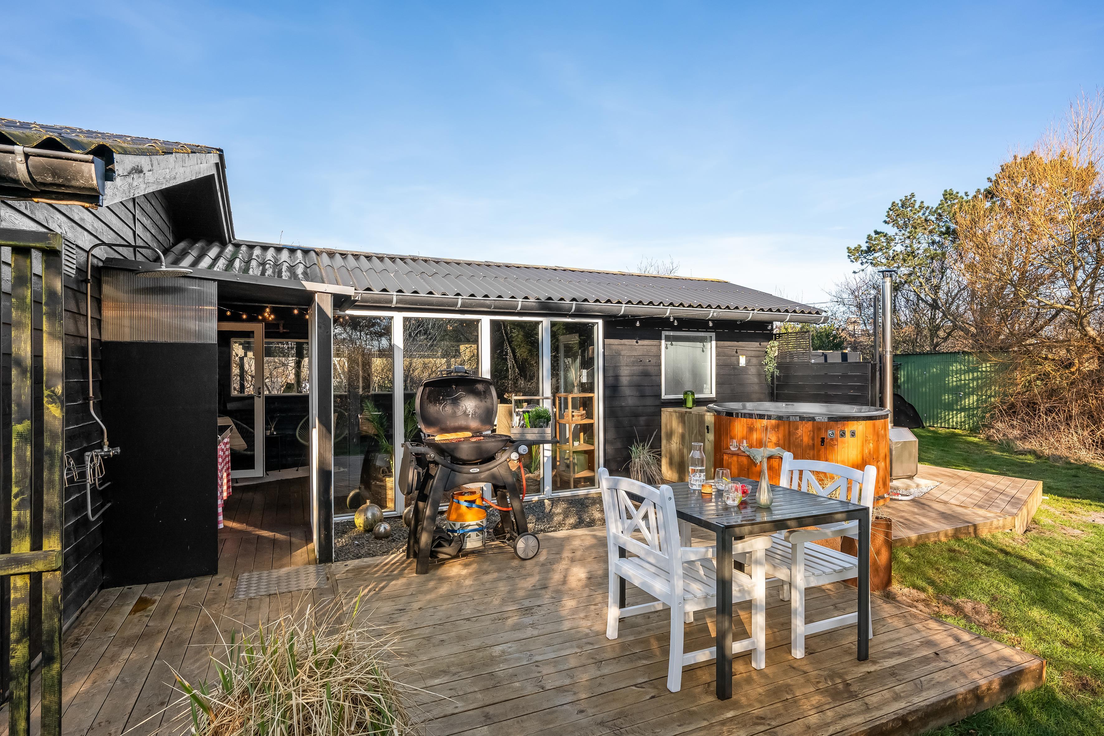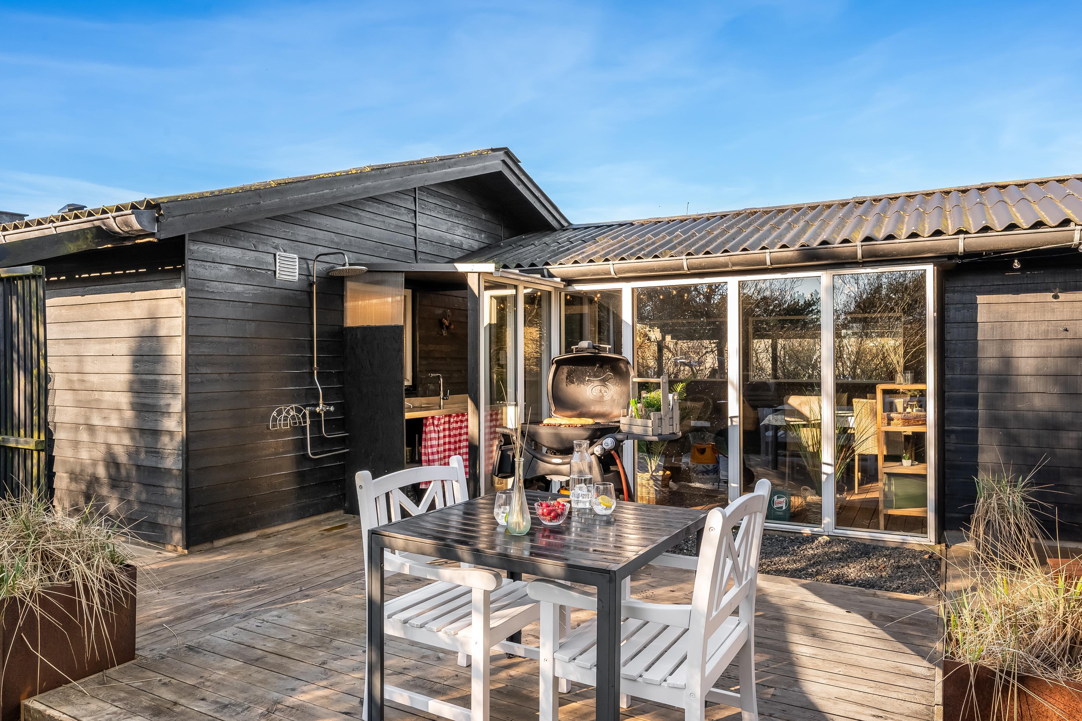 Køkkenet er veludstyret med moderne apparater, herunder en mikrobølgeovn, ovn, keramisk komfur, køleskab og fryser på 80 liter. Opvaskemaskinen gør oprydningen efter måltiderne til en leg. Udenfor kan du nyde de dejlige danske sommeraftener på den overdækkede terrasse, hvor der også er en grill til hyggelige grillfester. Udebruseren er perfekt til at skylle sand og salt af efter en dag ved Vesterhavet, som ligger kun 600 meter væk.