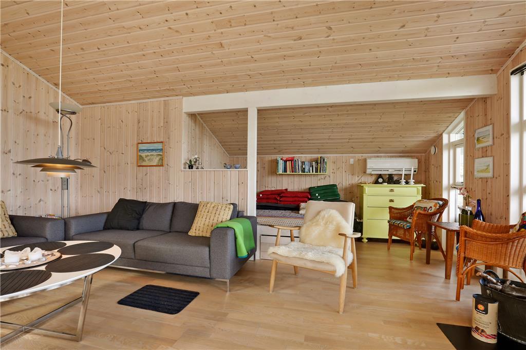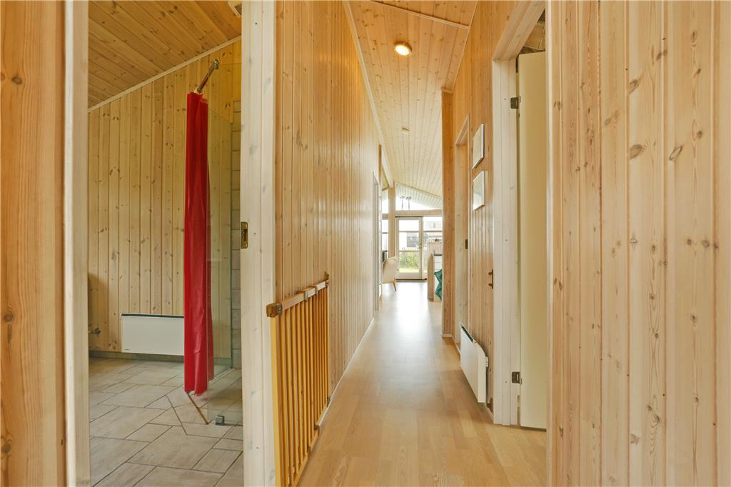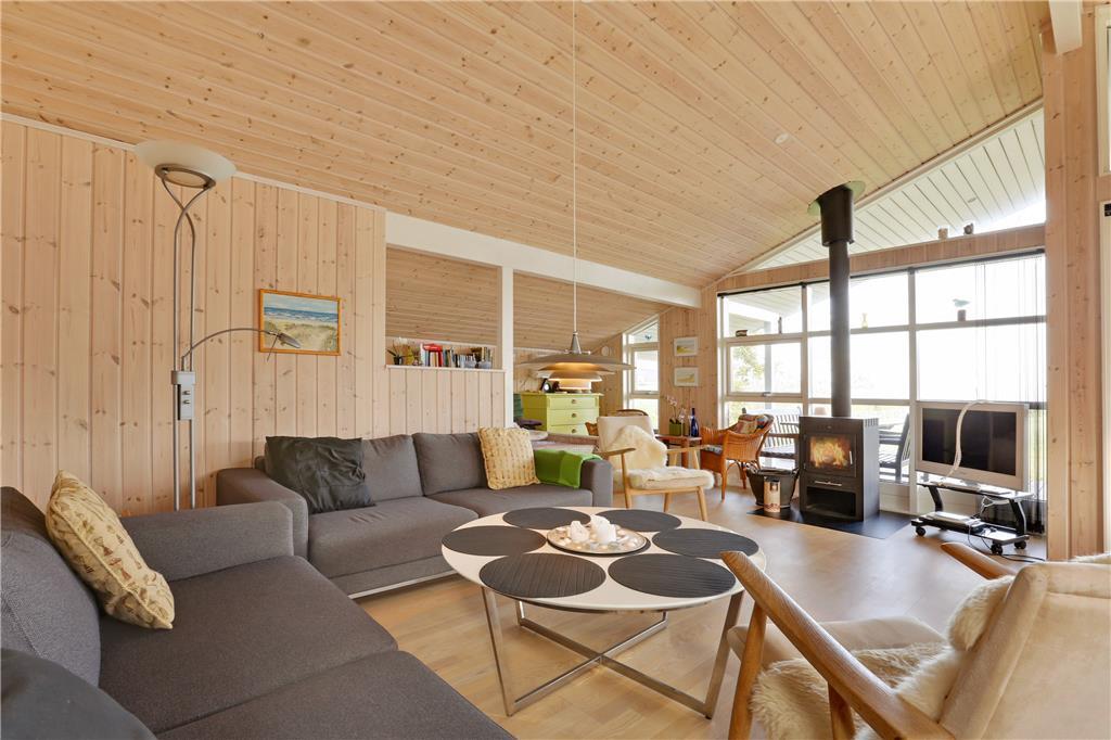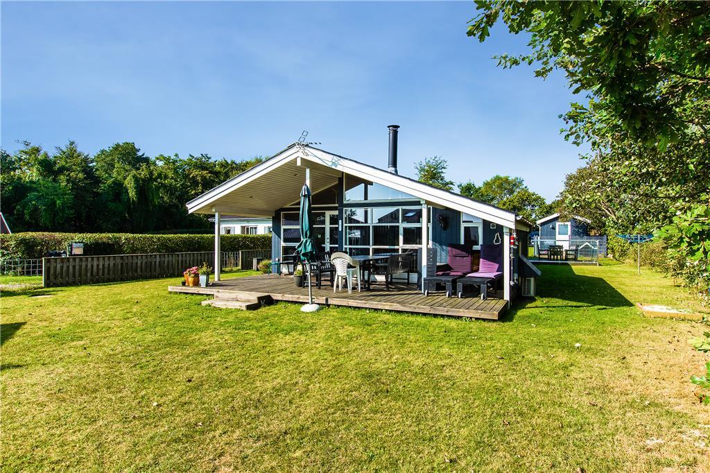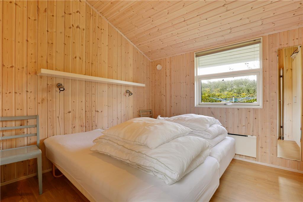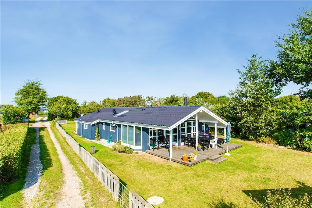 Dette sommerhus er fra 2008, det fremstår lyst og stort og med moderne indretning. Husets 101 kvm er fordelt på et køkken med opvaskemaskine, der er i åben forbindelse til den store stue, der er med brændeovn. I stuen er der en alkove med en dobbeltseng. Herudover er der tre soverum med henholdsvis to dobbeltsenge og to enkeltsenge. Herudover er der et badeværelse med brus og gulvvarme og et gæstetoilet. Huset har desuden et bryggers.