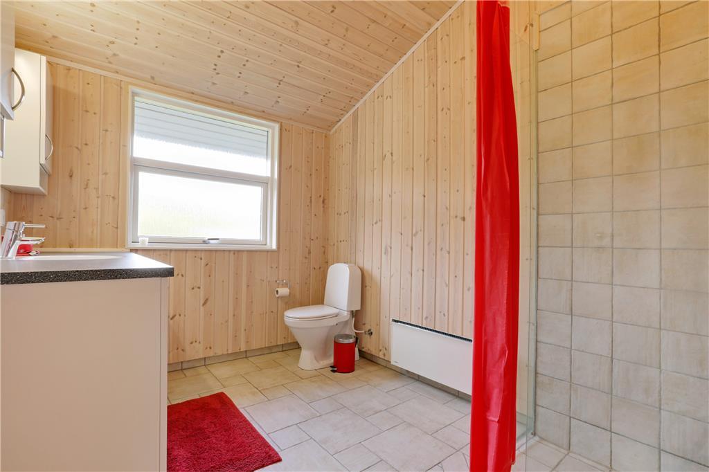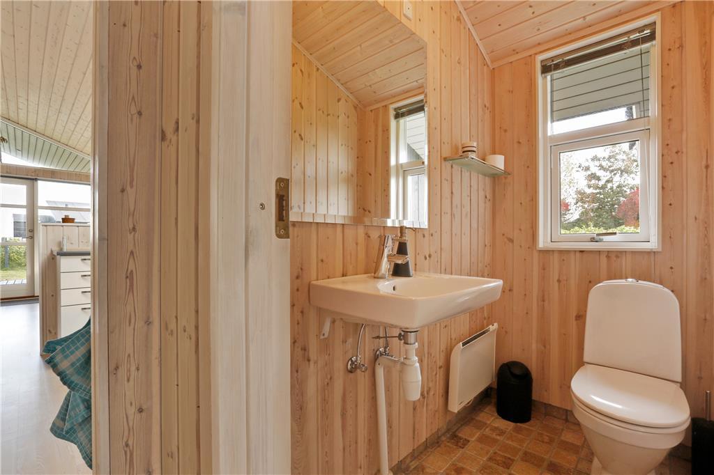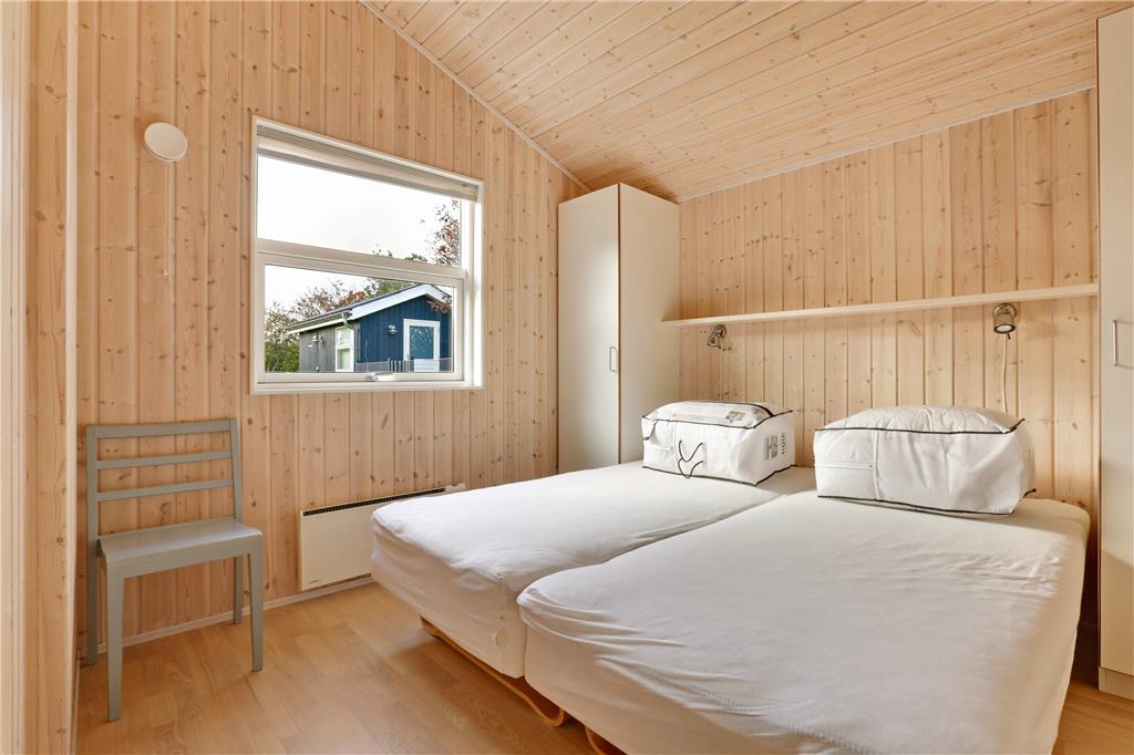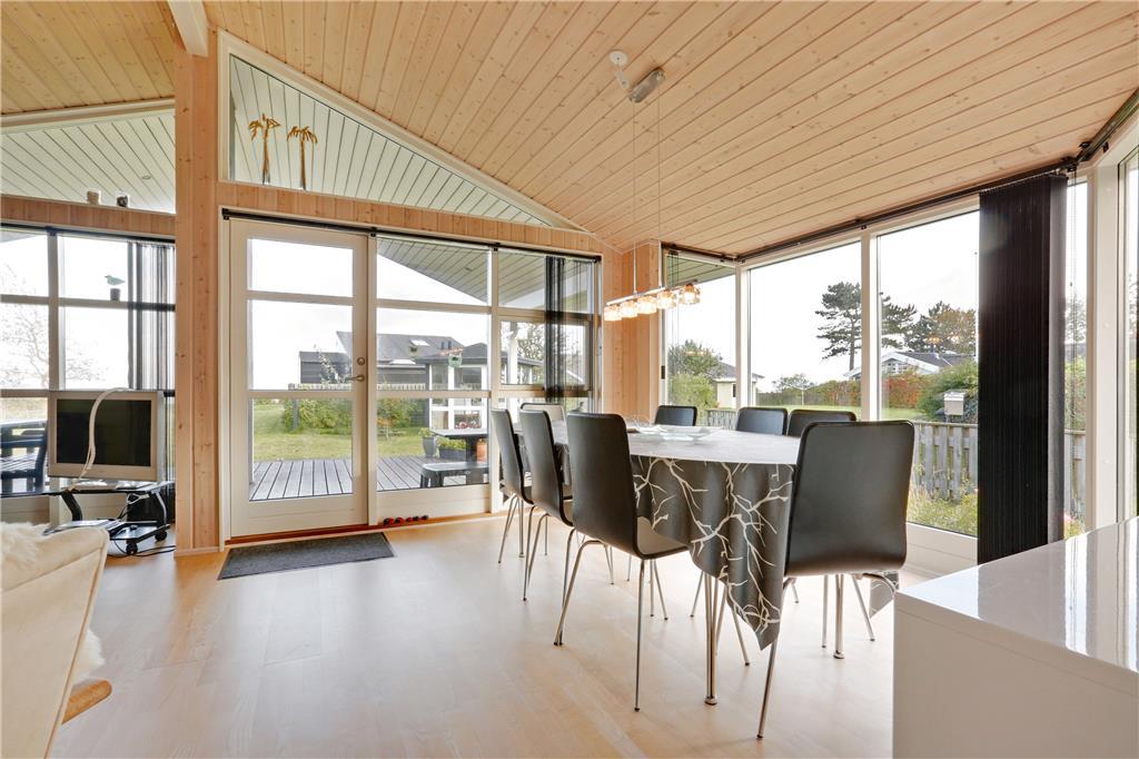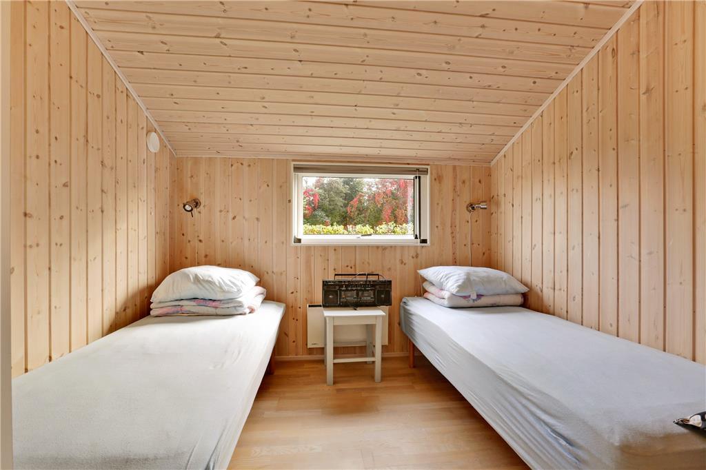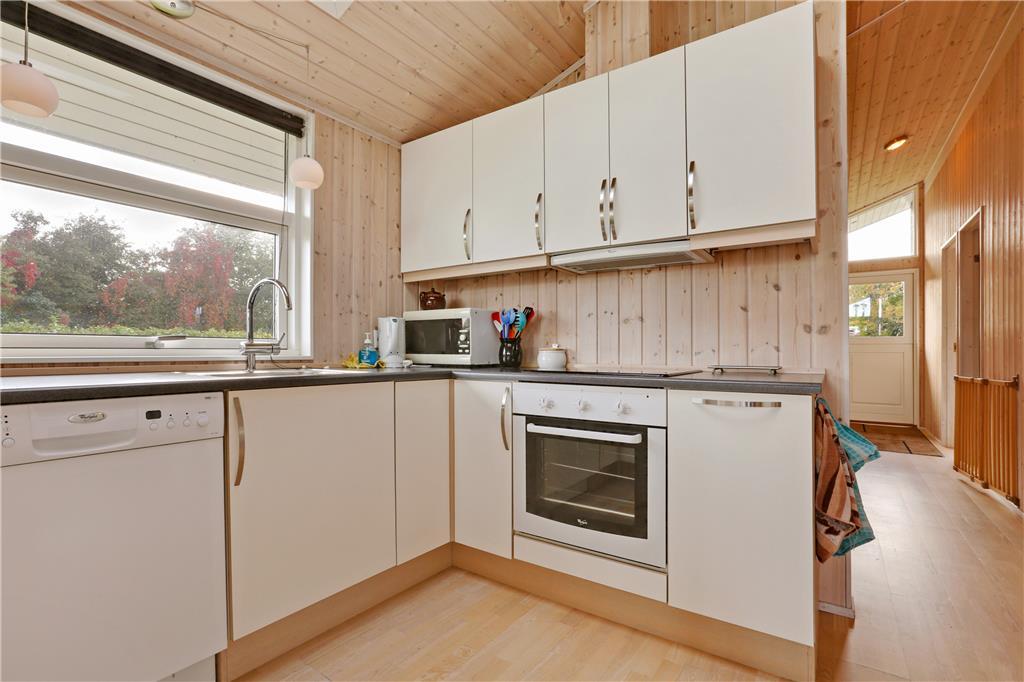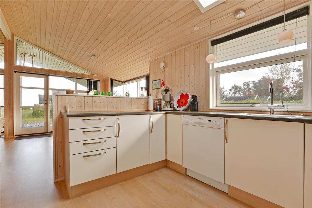 Dette sommerhus er fra 2008, det fremstår lyst og stort og med moderne indretning. Husets 101 kvm er fordelt på et køkken med opvaskemaskine, der er i åben forbindelse til den store stue, der er med brændeovn. I stuen er der en alkove med en dobbeltseng. Herudover er der tre soverum med henholdsvis to dobbeltsenge og to enkeltsenge. Herudover er der et badeværelse med brus og gulvvarme og et gæstetoilet. Huset har desuden et bryggers.