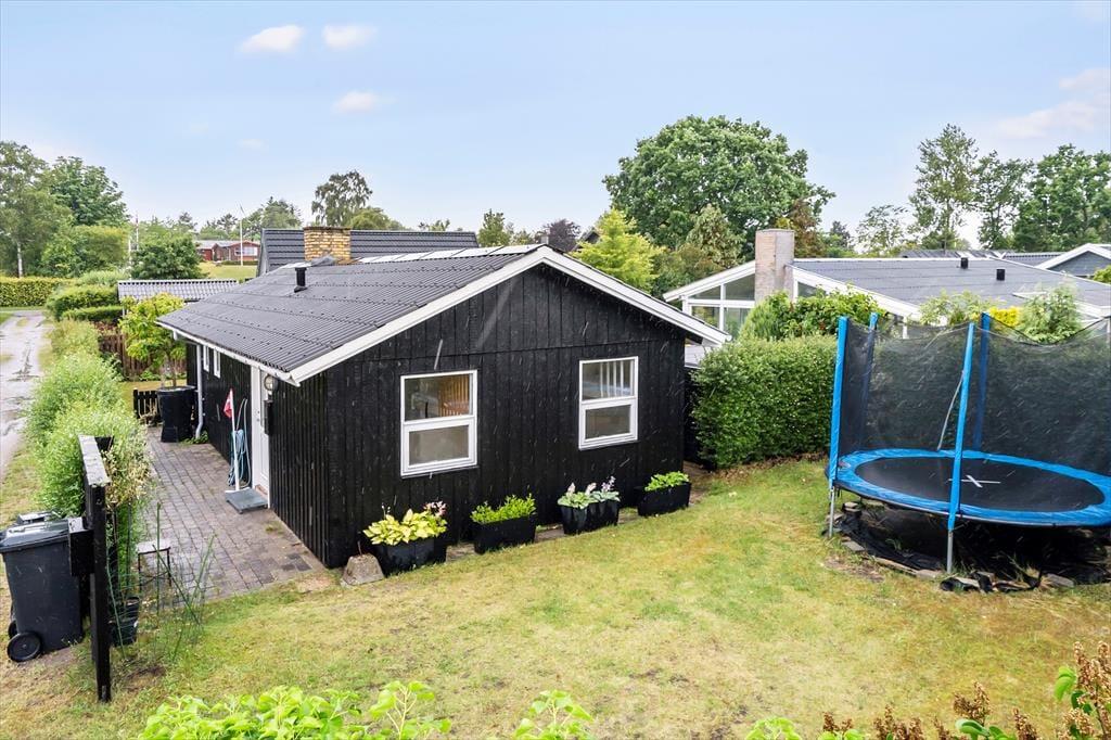 Huset har en dejlig træterrasse hvor man kan hygge eller bare slappe af. Her kan man også sidde og holde øje med børnene, når de leger i haven eller hopper på trampolin. Hvis vejret ændrer sig, er der en overdækket terrasse, så aftensmåltidet kan nydes ude. Grunden er stor og indbyder til udendørs spil og hygge. Både den åbne terrasse samt den overdækkede terrasse vender ud mod haven og gør, at man kan nyde synet af græsset og blomsterne næsten hele året.
