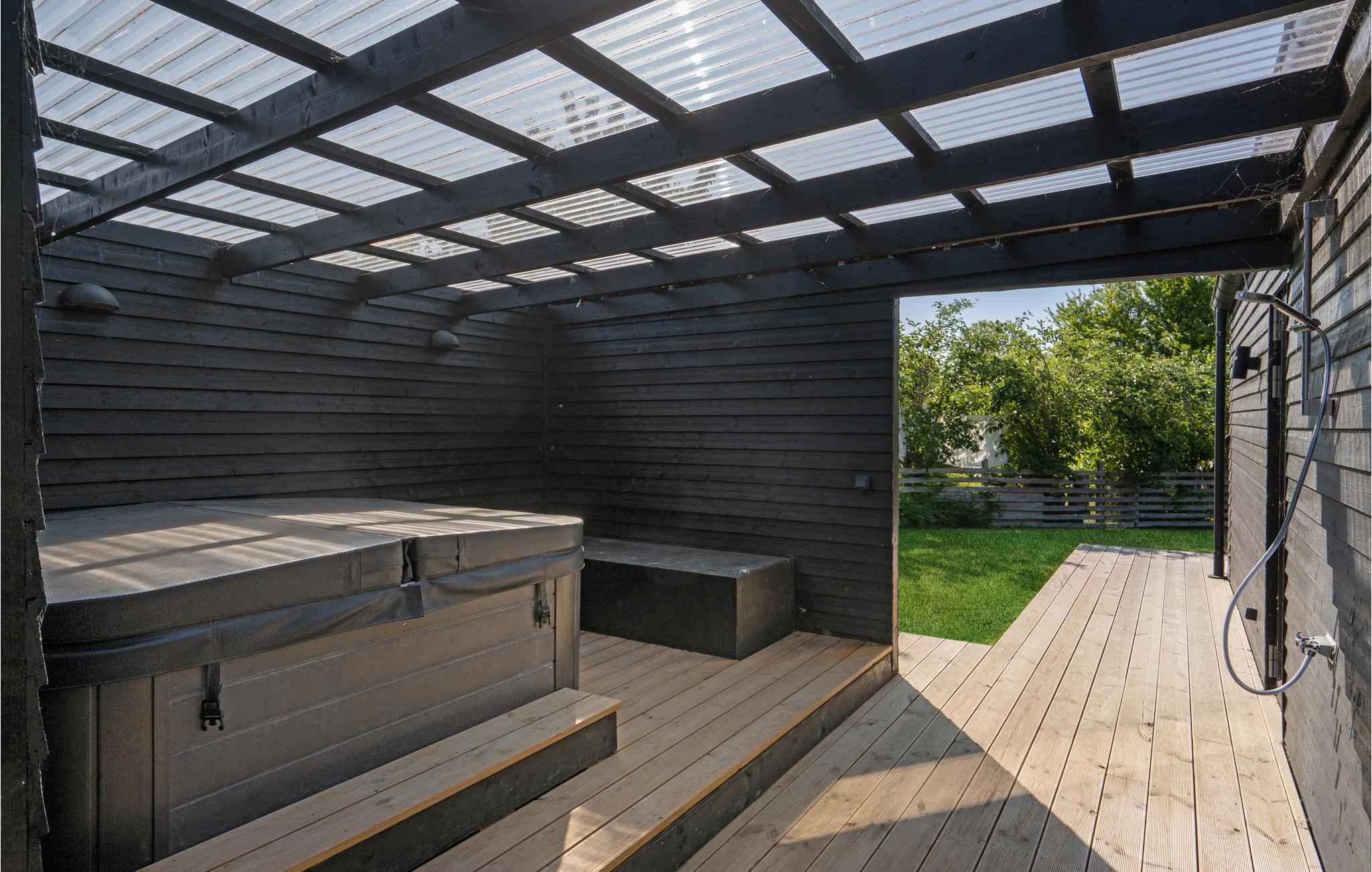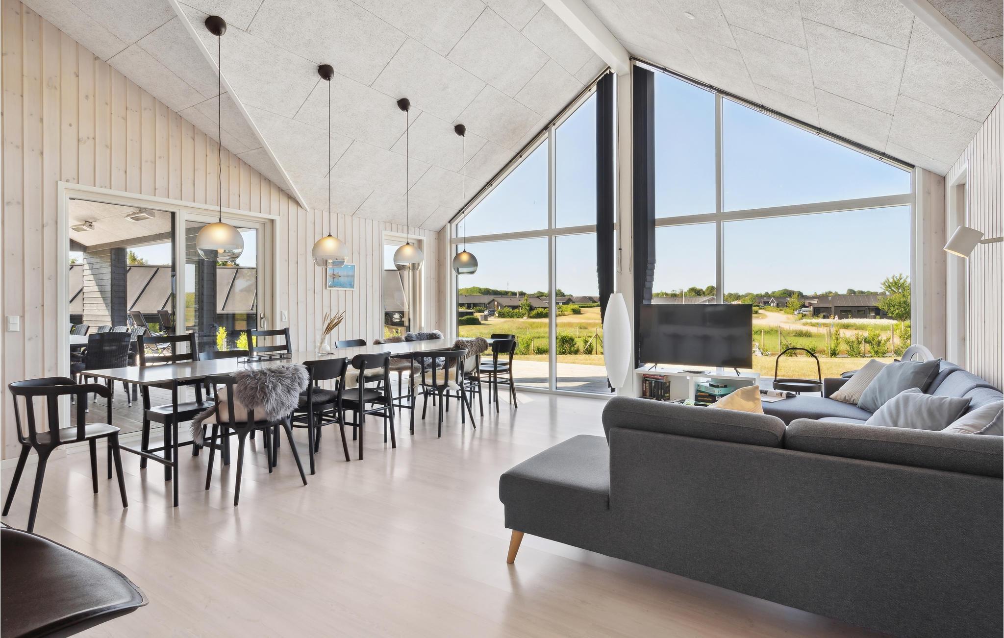 I huset kan I forvente store, lyse rum med høje lofter og masser af plads til leg og hygge. Stuen bliver hurtigt centrum for fælles aktiviteter. Nyd den vidunderlige panoramaudsigt over naturen gennem gulv-til-loft-vinduer under måltiderne ved det lange spisebord, også når I slapper af på den store sofa. På terrassen kan I tilbringe mange timer med hyggelige grillaftener eller nyde jeres morgenkaffe. Rund en dejlig feriedag af med lidt wellness i det udendørs spabad. Beliggenheden er optimal til en strandferie, da huset kun ligger en kort gåtur fra den nærmeste sandstrand.