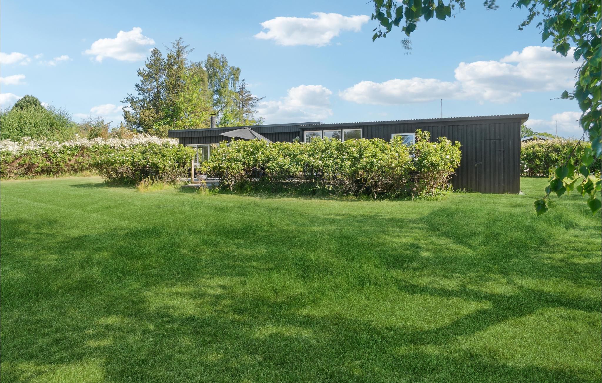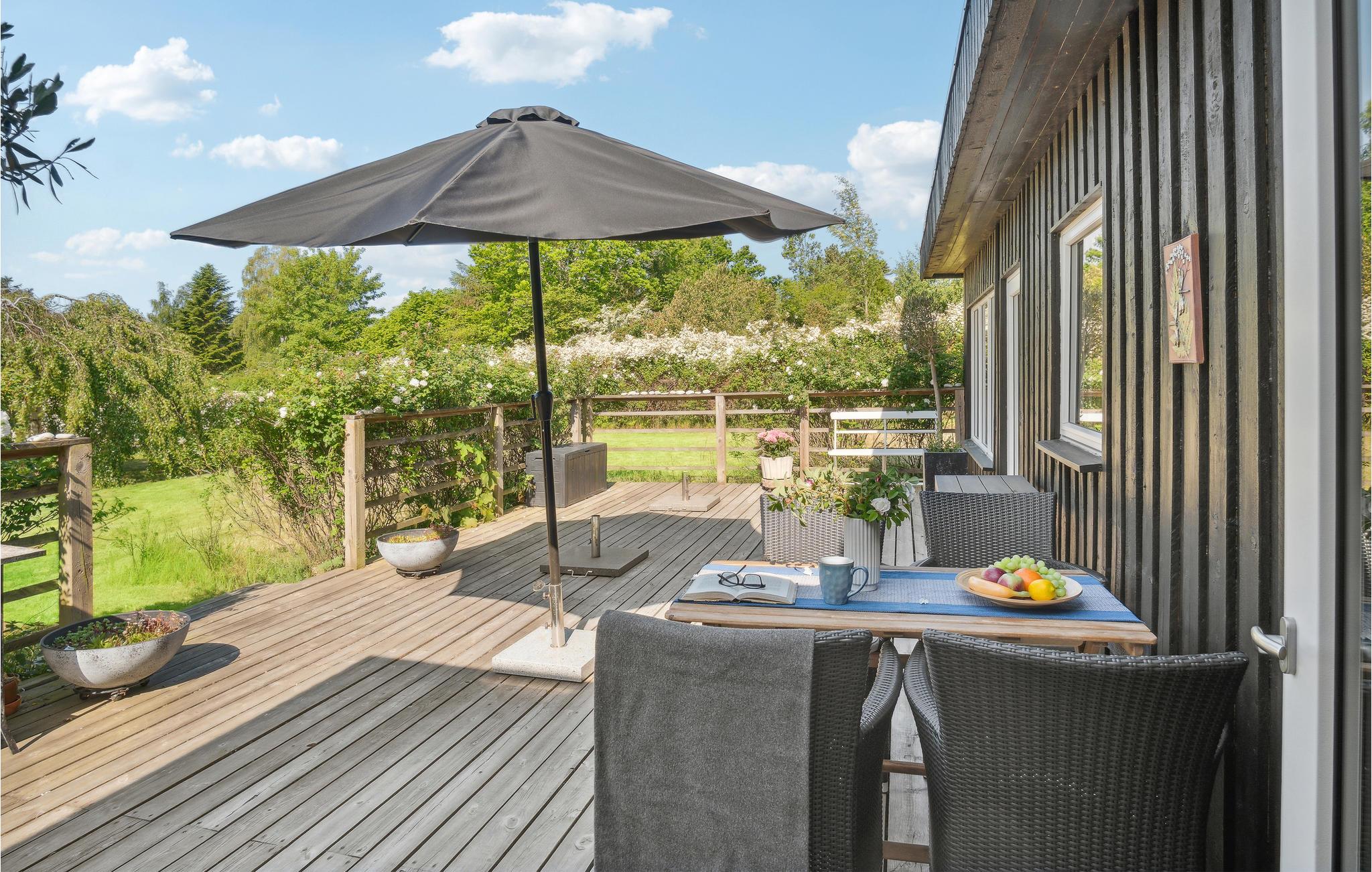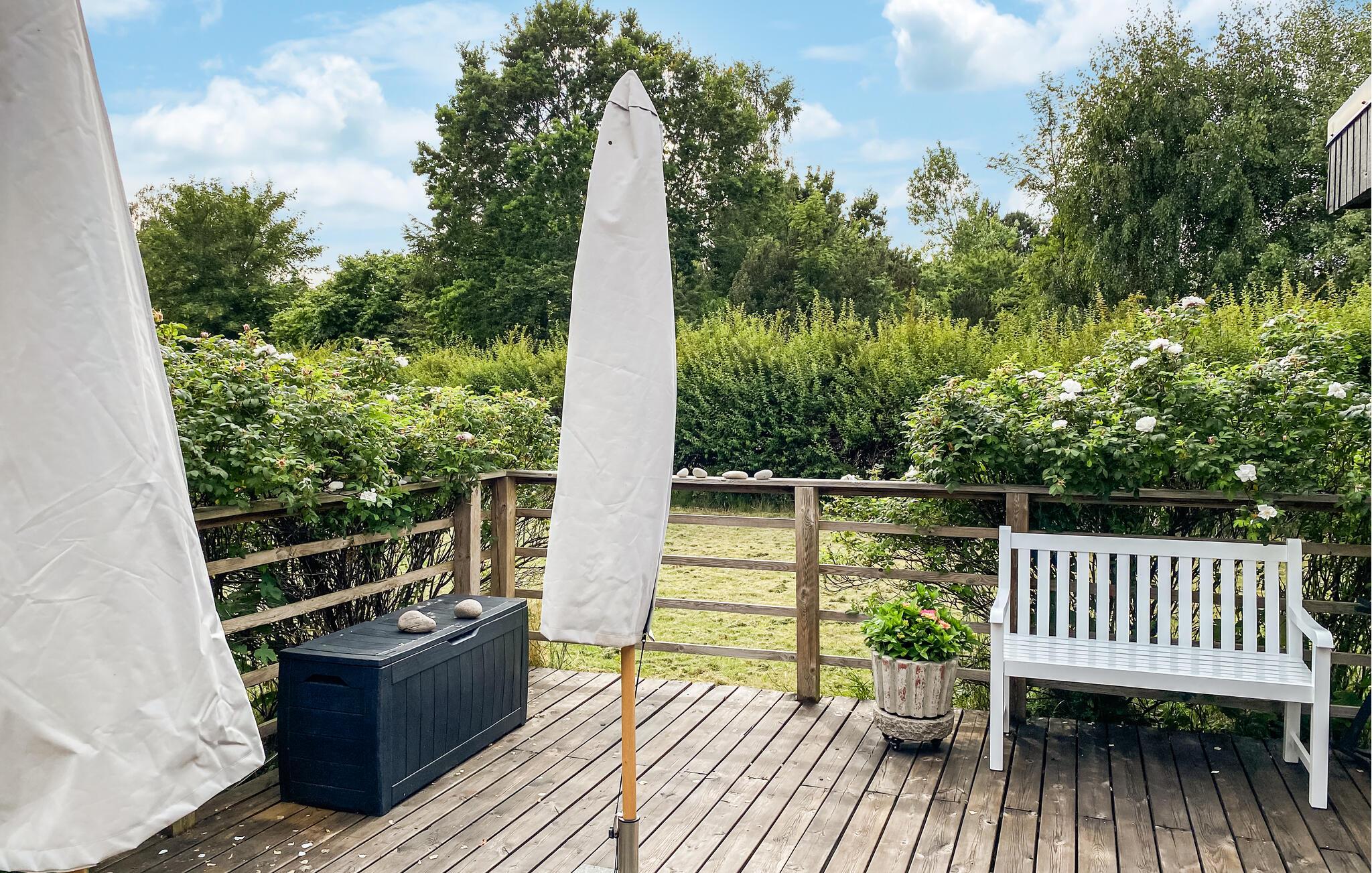 Lyst feriehus nær Saltbæk Strand med stor terrasse, brændeovn og smuk have til afslapning og naturoplevelser.
