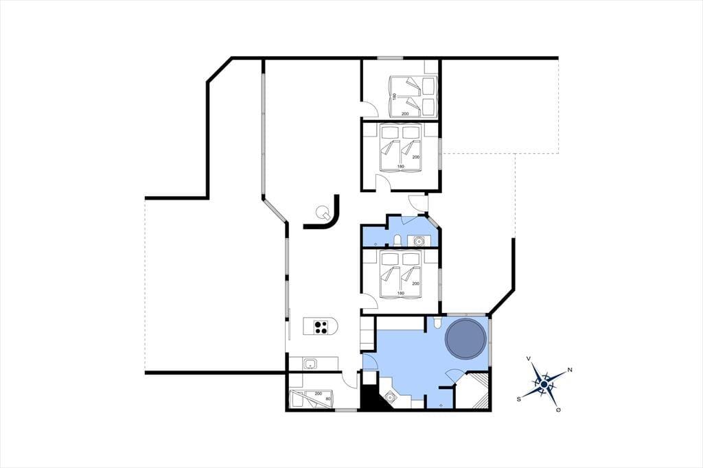 Sommerhuset er indrettet i en lys og imødekommende stil med pæne og moderne møbler. Køkkenet er med fritstående kogeø foran spisepladsen, så der kan laves mad og hygges sammen. I forlængelse heraf ligger stuen med skøn udsigt over grunden gennem store vinduer, og med flere hyggekroge, hvor man kan slappe af med en god bog foran brændeovnen. De 3 værelser er fordelt i hver ende af sommerhuset, så det er muligt at dele sig op, hvis man tager to familier af sted sammen. Herudover er der en hems med madrasser. Desuden er der i sommerhuset to badeværelser, begge med bruser, og i det store kan man desuden med få midler lave lidt wellness-stemning i spabadet og saunaen. Barnestol-og seng forefindes i sommerhuset.