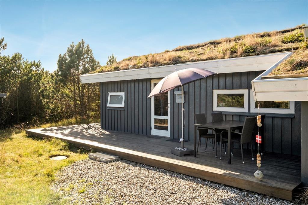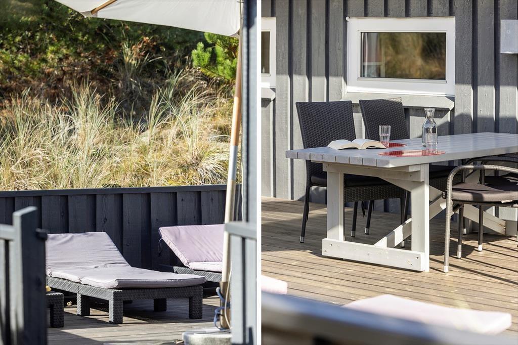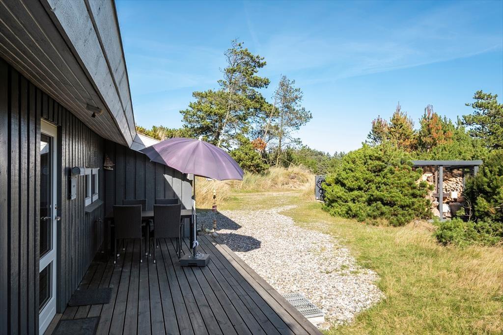 Udenfor finder du den lukkede terrasse, der er den ideelle oase til både afslapning og samvær. Terrasseområdet er perfekt til solrige dage, og her kan du sidde og nyde morgenkaffen eller tage en pause i skyggen af træerne. Den lukkede gårdhave giver jer masser af privatliv, så I kan slappe af uden at blive forstyrret af omverdenen. Det naturskønne område omkring sommerhuset indbyder til lange gåture, hvor I kan udforske skovens og klitternes mange stier. Her er plads til både rolige stunder og aktive oplevelser, alt imens I nyder den unikke natur tæt på.