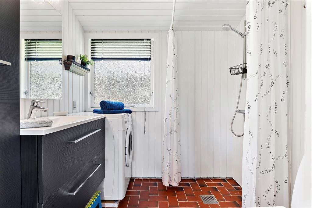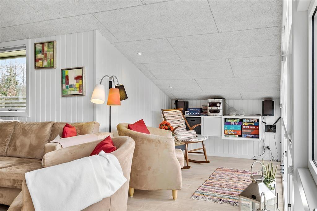 Indenfor mødes du af en lys og rummelig atmosfære, hvor de store vinduespartier mod syd lader solens stråler strømme ind og skaber en dejlig åbenhed. Opholdsrummet er husets hjerte med plads til både afslapning og samvær. Her kan du nyde hyggelige aftener foran brændeovnen, læse en god bog eller samles om spisebordet til fælles måltider. Køkkenet er veludstyret og åbent, så madlavningen bliver en social aktivitet, hvor familien kan være sammen om at tilberede dagens måltider. De lyse farvetoner og det stilfulde møblement skaber en indbydende ramme om feriedagene.