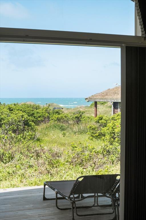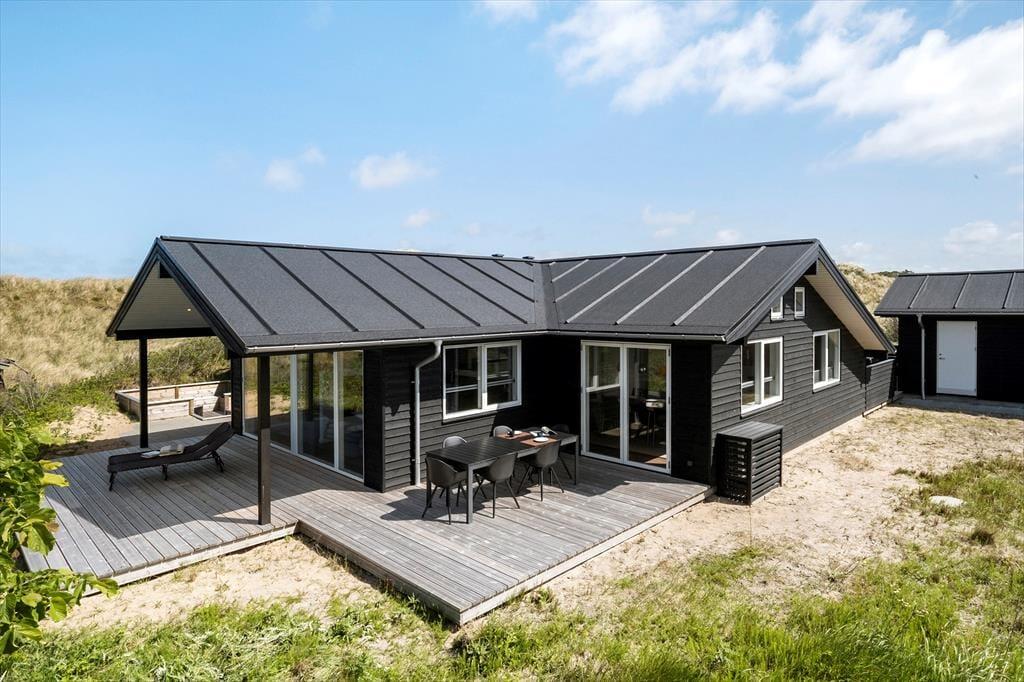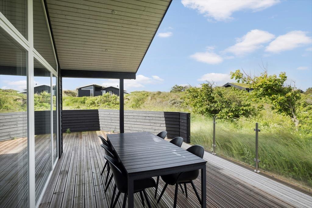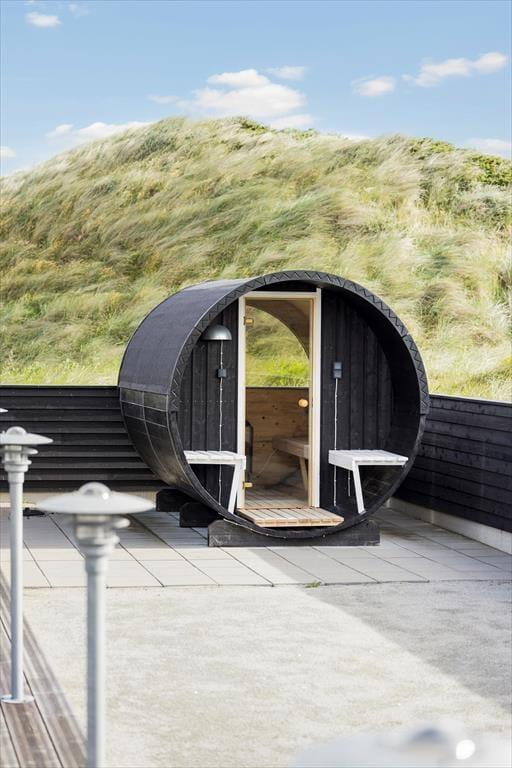 Vest for sommerhuset venter en delvist overdækket træterrasse, hvor I kan nyde driverlivet med udsigt til Vesterhavet, klitterne og duftende hybenbuske. Blandt andet ved solnedgangstid er det skønt at sidde her, men ellers får terrassen skarp konkurrence af det aflukkede opholdsmiljø, der breder sig mod øst. Udover loungemøbler, havebord og liggestole står der et vildmarksbad klar, og der er også en 11x4 meter petanquebane, så I kan hygge jer med at dyste og perfektionere jeres kast.