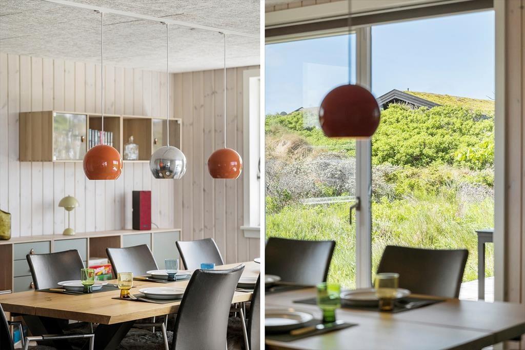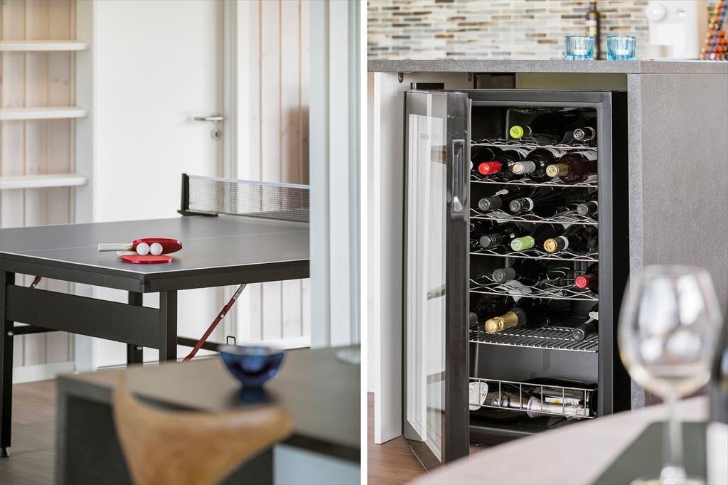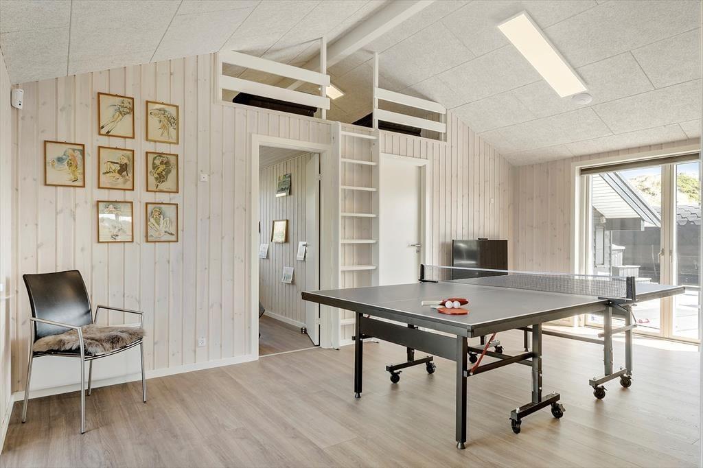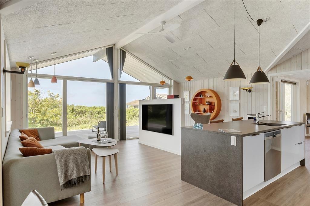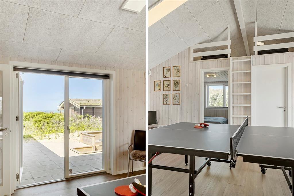 Stuen er placeret mod vest i sommerhuset, så I kan nyde havudsigten gennem det store gavlvindue, der går fra gulv til loft. Et lækkert køkken er integreret med stuen, og når I ikke hygger jer herinde, kan I rykke ind i det tilstødende aktivitetsrum for at spille bordtennis eller dart. Planløsningen byder for øvrigt på to badeværelser med brusenicher og tre soveværelser med dobbeltsenge. Alle rum fremstår lyse, rummelige og er stilfuldt indrettede, så alt i alt er det en skøn feriebolig til seks personer.