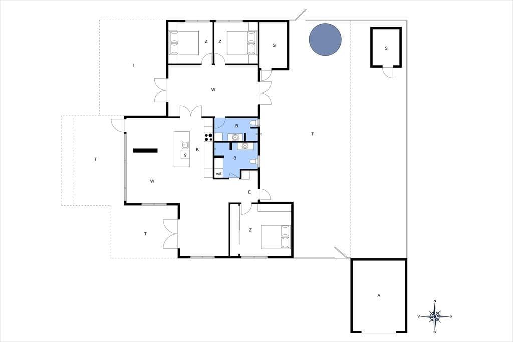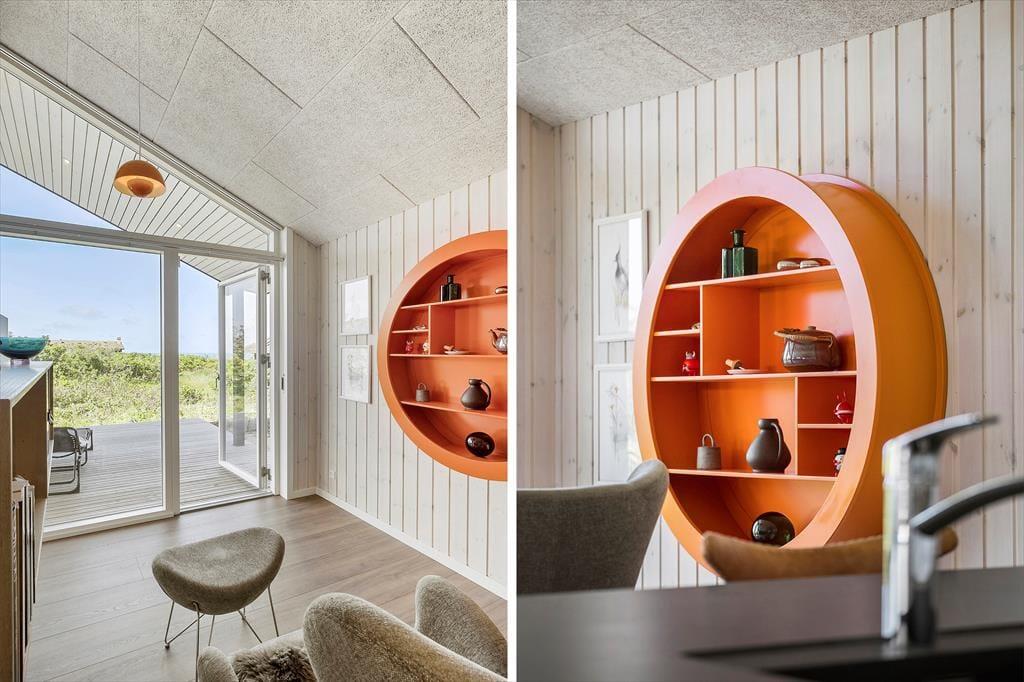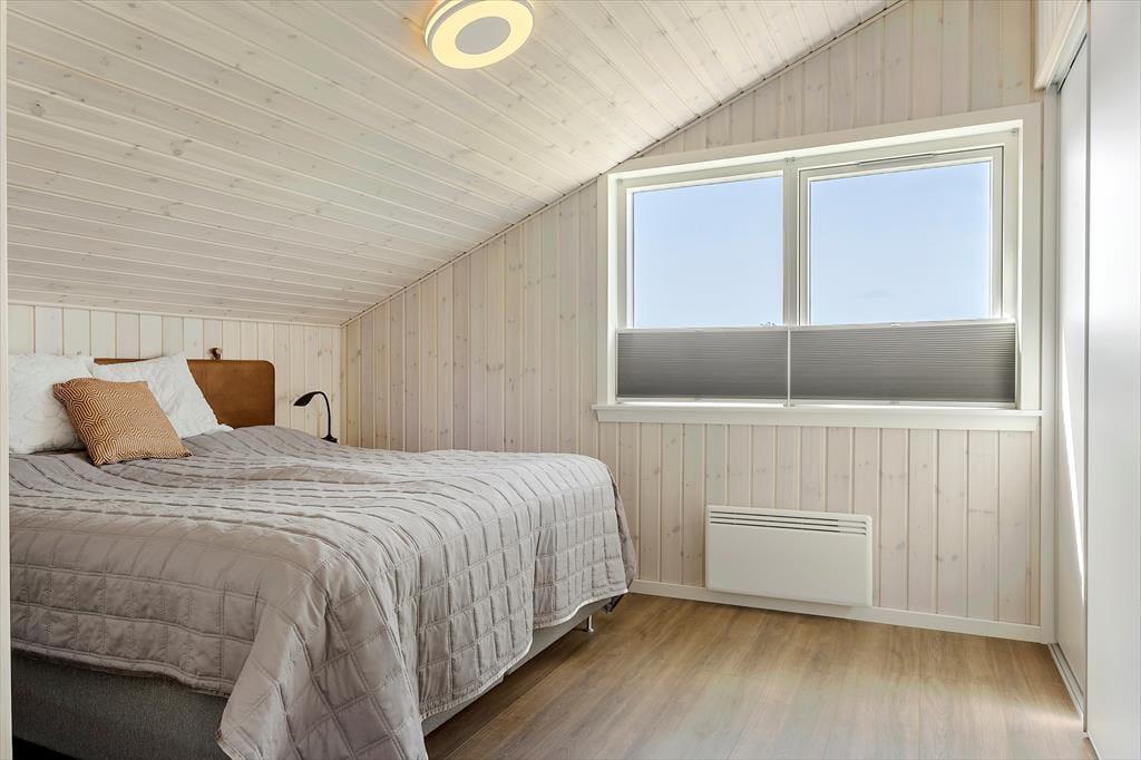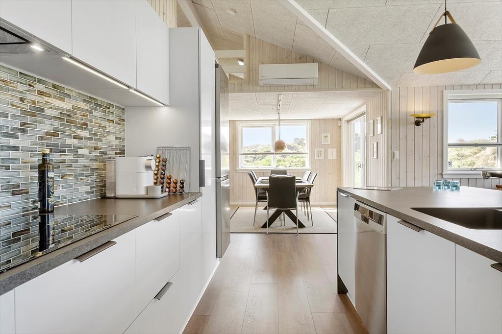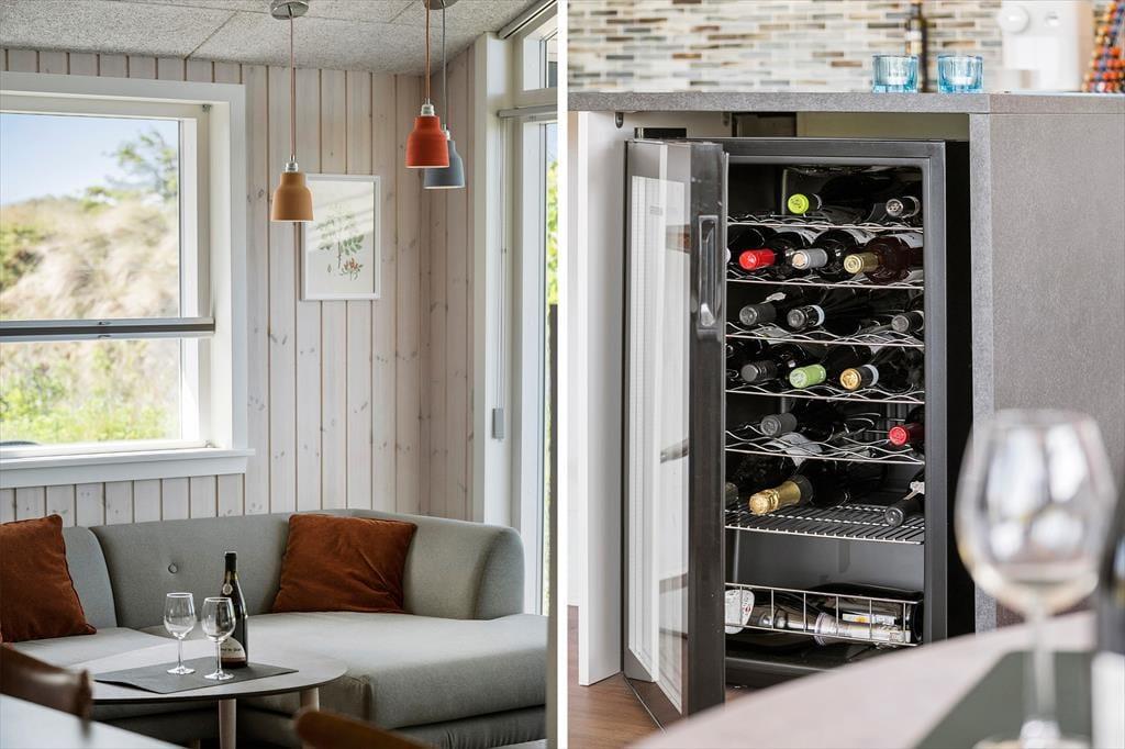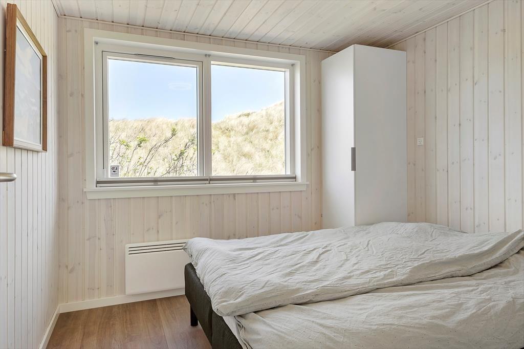 Stuen er placeret mod vest i sommerhuset, så I kan nyde havudsigten gennem det store gavlvindue, der går fra gulv til loft. Et lækkert køkken er integreret med stuen, og når I ikke hygger jer herinde, kan I rykke ind i det tilstødende aktivitetsrum for at spille bordtennis eller dart. Planløsningen byder for øvrigt på to badeværelser med brusenicher og tre soveværelser med dobbeltsenge. Alle rum fremstår lyse, rummelige og er stilfuldt indrettede, så alt i alt er det en skøn feriebolig til seks personer.