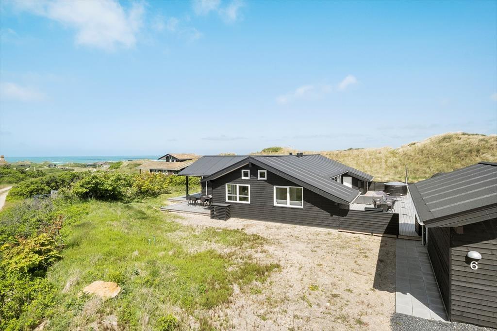 Dette store kvalitetssommerhus fra 2022 er udstyret med bordtennisbord, vildmarksbad og petanquebane, men det er nu beliggenheden, der indledningsvis skal fremhæves. Sommerhuset er nemlig placeret på en lille, lukket vej nær Saltum Strand, og så ligger det højt i landskabet, så I kan skue ud over det naturskønne kystlandskab og Vesterhavet fra stuen.