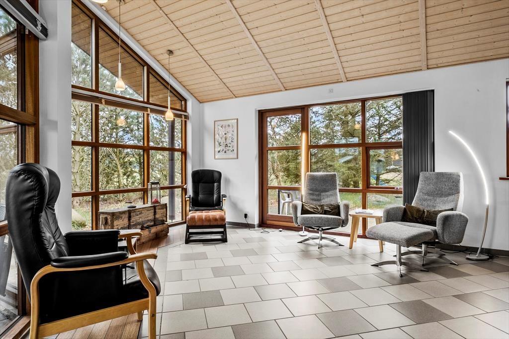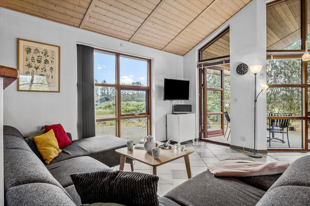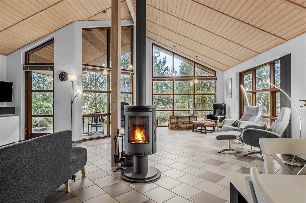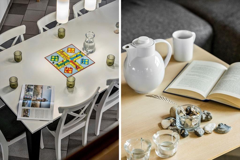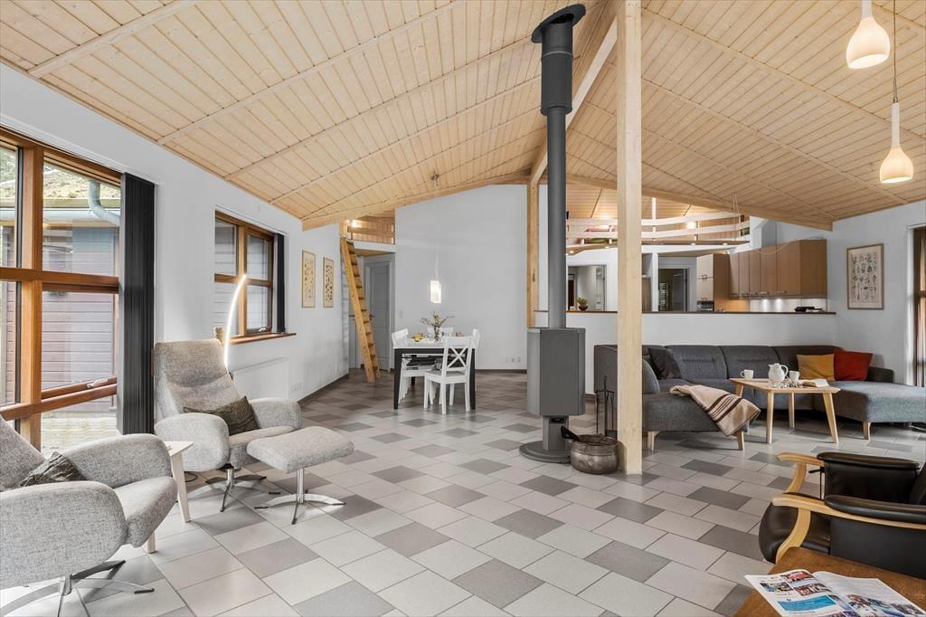 Det store opholdsrum danner rammen om det indendørs ferieliv – og her får du en dejlig fornemmelse af luft og rummelighed fra det øjeblik, du træder ind. Lyset strømmer ind ad de mange vinduer og rammer det åbne køkken, spiseområdet og sofahjørnet, hvor du kan flade ud med en god bog eller samles med familien til aftenhygge. Den gennemgående varme fra jordvarmeanlægget gør det ekstra komfortabelt at være her – uanset årstid – og de gode værelser giver dig mulighed for at finde netop den ro, du har brug for. Med flere afdelinger i huset er det også nemt at dele sig op i mindre grupper, hvis nogen vil tage et spil kort, mens andre nyder en stille stund.