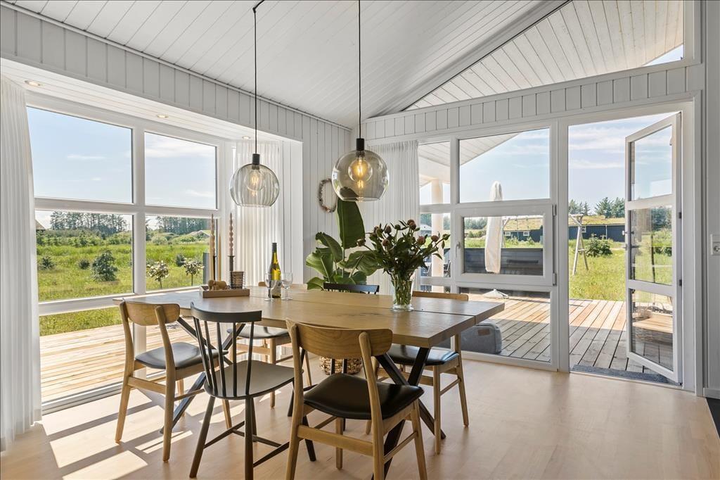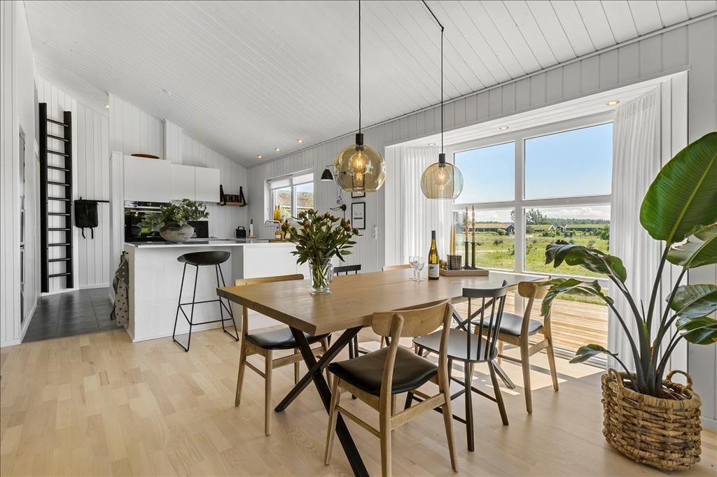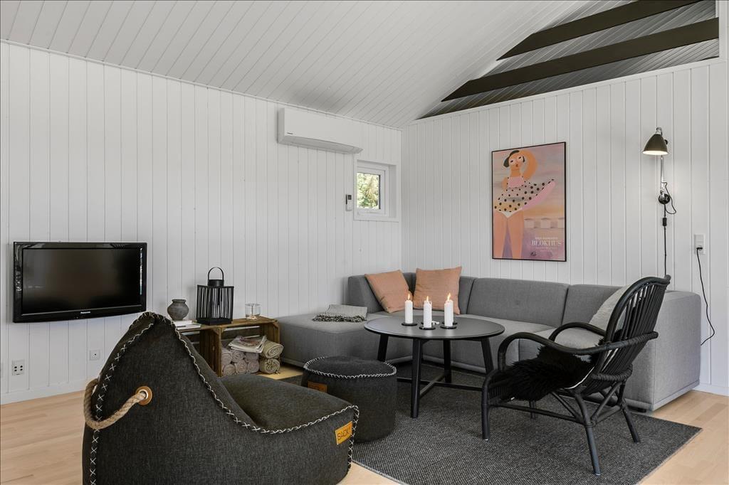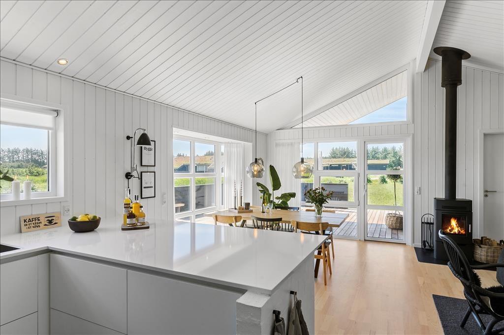 Indenfor bliver I mødt af en hyggelig stue med en dejlig brændeovn, som skaber en varm og indbydende stemning på kolde dage. Her kan I samles om et brætspil, en god bog eller bare nyde roen efter en aktiv dag. Det åbne køkkenalrum er smagfuldt indrettet og udstyret med alt, hvad I behøver for at lave lækre måltider. Samtidig er der rigeligt med plads til at dele madlavningen med familien eller vennerne. Badeværelset er et sandt wellness-område, hvor I kan slappe af i både spabad og sauna – den perfekte måde at afslutte en lang dag på.