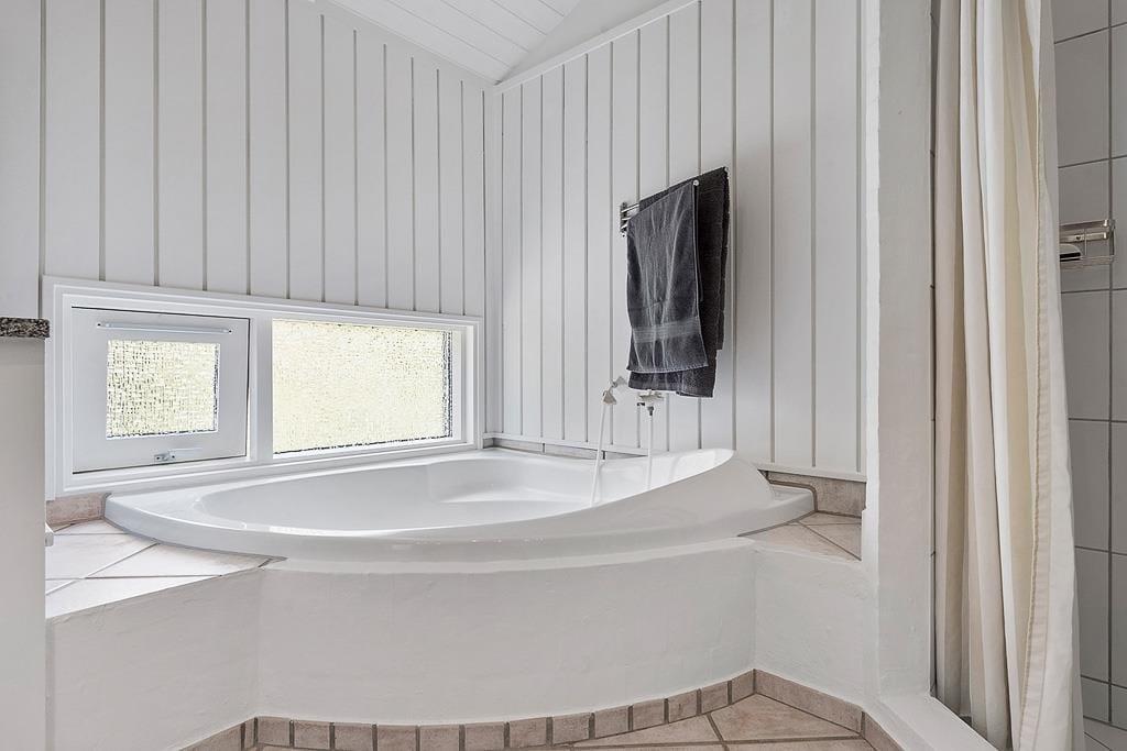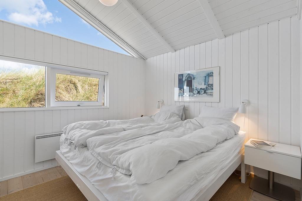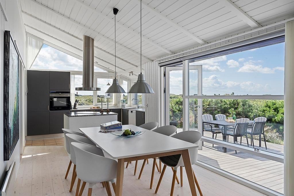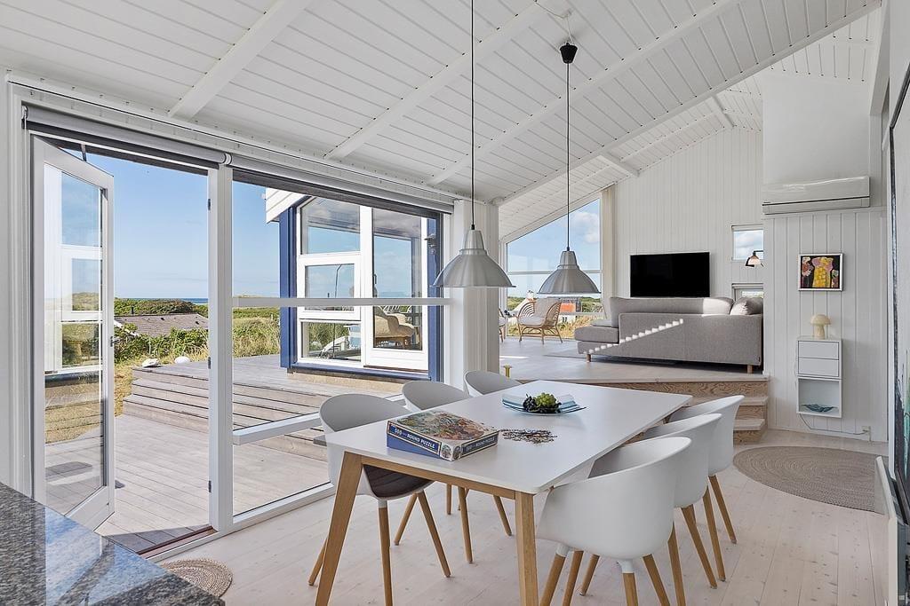 Når I træder indenfor, bliver I mødt af den helt rette sommerhusstemning med en stilren, lys og skandinavisk indretning. De store vinduespartier trækker naturen ind i huset og giver et fantastisk lysindfald. Det åbne opholdsområde indbyder til hygge og samvær. Køkkenet er lækkert og funktionelt, og de komfortable møbler i stuen gør det til det perfekte sted at slappe af efter en dag i naturen, mens I nyder solnedgangen og evt. ilden i brændeovnen. Det lækre badeværelse med stort hjørnebadekar er en oase, der indbyder til selvforkælelse.