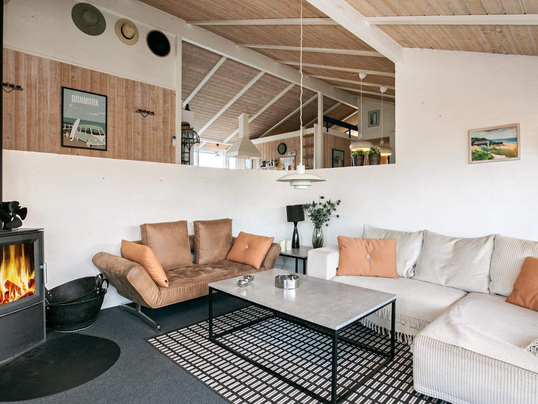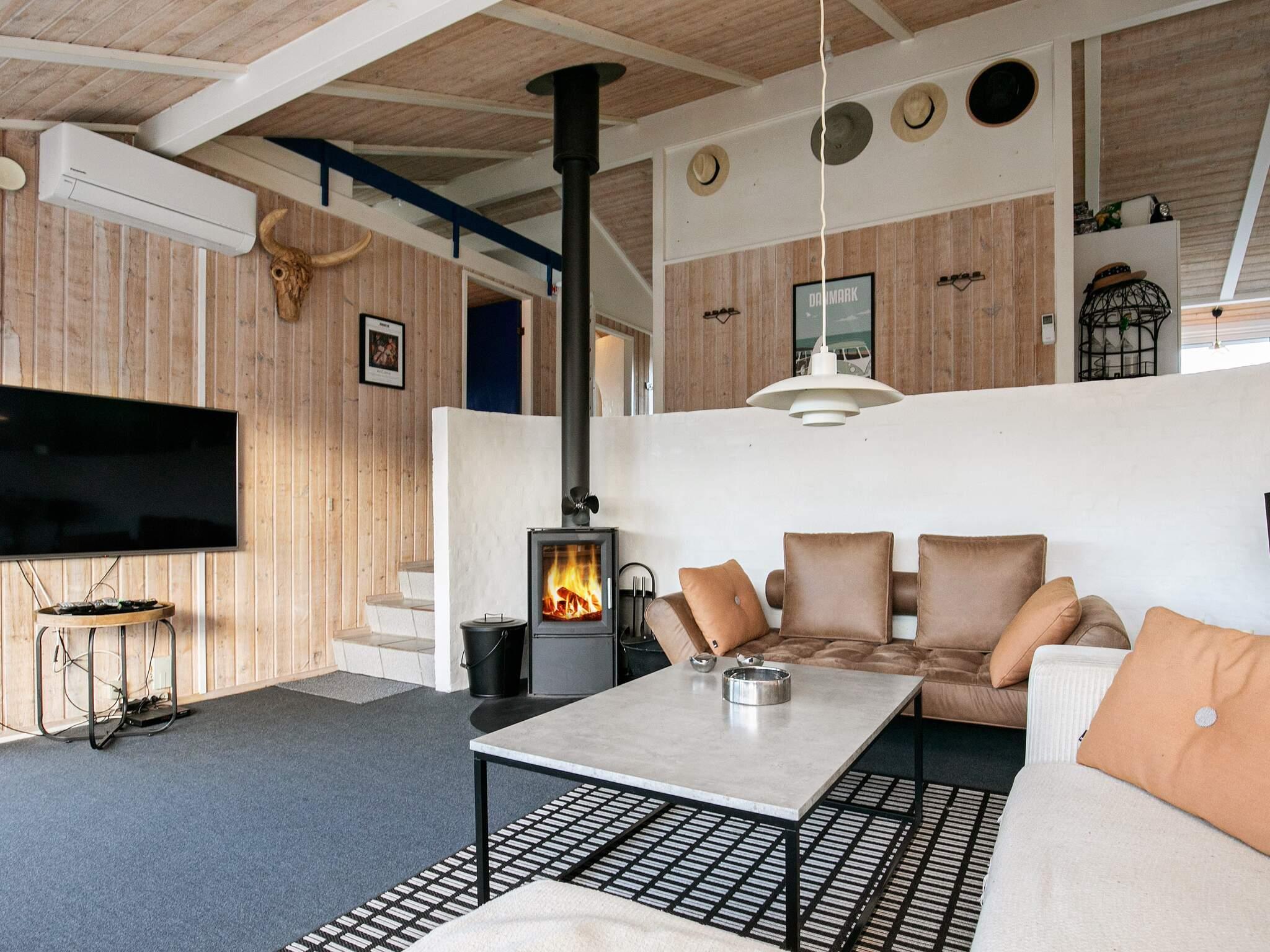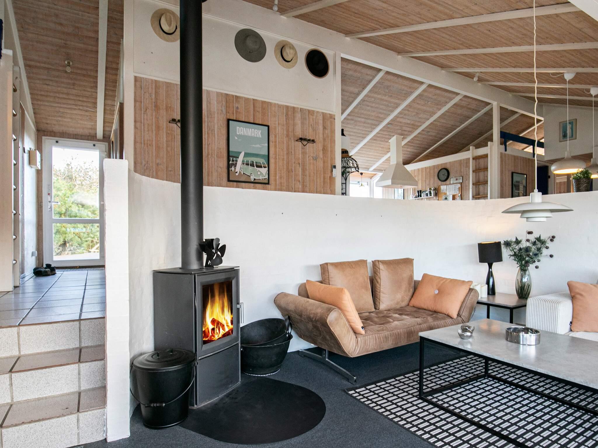 Huset er moderne indrettet og indeholder stor nedsænket stue samt køkken/alrum, der begge har udkig til poolområdet og havet. I stuen findes brændeovn, som giver en god varme i det meste af huset.