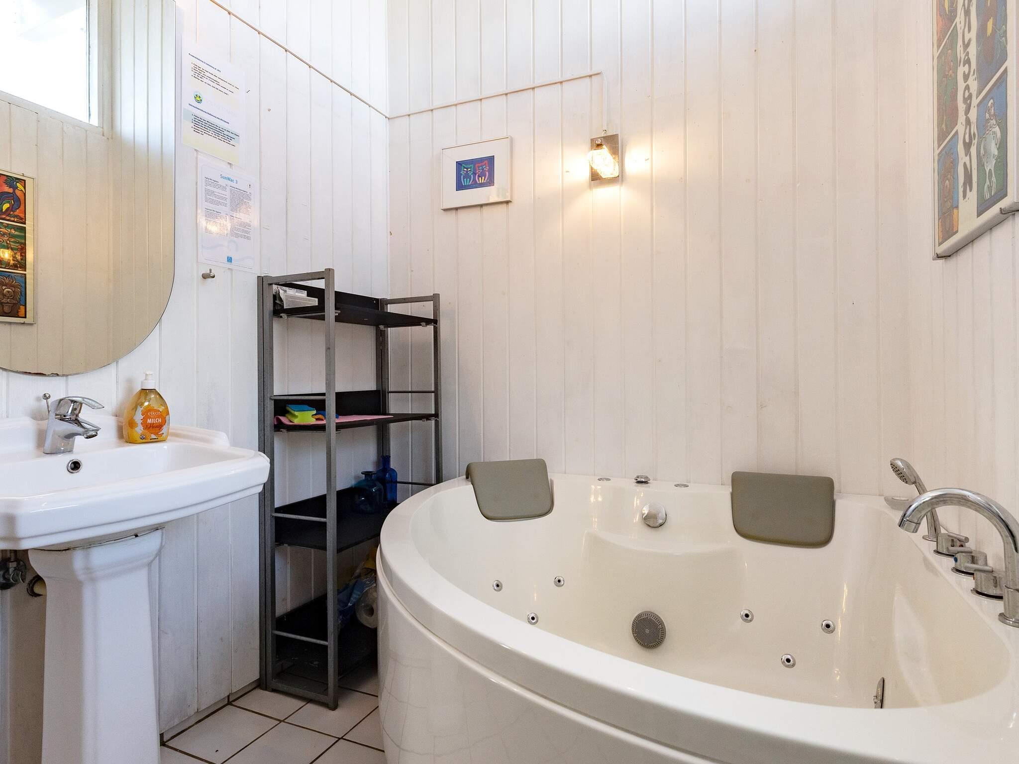 Den lyse og indbydende opholdsstue er perfekt til familiesammenkomster, med plads til at slappe af omkring tv'et eller hygge ved brændeovnen. Det åbne design giver mulighed for interaktion, mens du laver mad i køkkenet eller nyder måltider og spil ved spisebordet, og holder alle sammen. Badeværelset byder på spabad og sauna, ideel til at slappe af efter en dag udendørs.