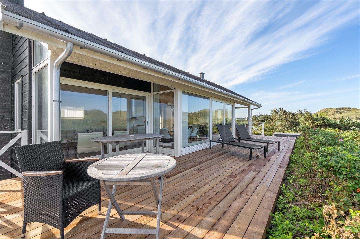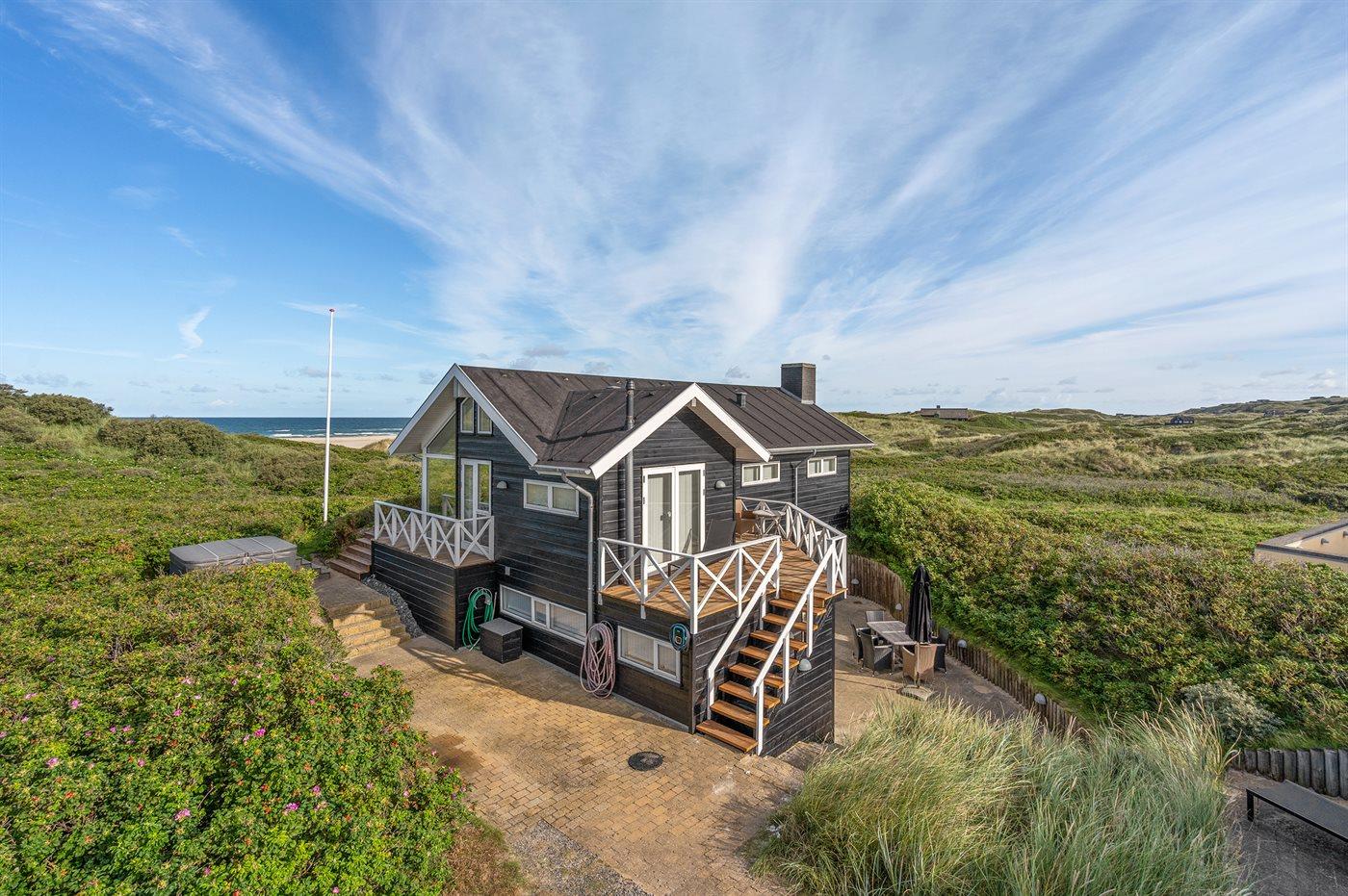 "The Beach House" er en eksklusiv og unik perle, som ligger i 1. klitrække på en sjælden og stor grund direkte ned til den brede sandstrand ved Saltum. Nyd den storslåede strand- og havudsigt fra stuen, køkkenet og den delvist overdækkede terrasse mod vest. På alle årstider kan solnedgangen, livet på stranden og ved vandet følges på tætteste hold. Kun de bedste materialer er anvendt i huset - f.eks. er der granitgulve i alle badeværelser og i hele underetagen. Huset er særdeles veludstyret og der er lagt vægt på beboernes velvære. I underetagen findes indgang med garderobe samt 2 af de 3 soveværelser. Alle værelser har udgang til terrasse og med TV. I den skønne udendørs spa med 38 grader varmt vand, er det muligt at få en dejlig afslappende vandmassage midt i den unikke natur. Spaen er fyldt og klargjort i ugerne 14-44. Her er et af de få huse i 1. klitrække, hvor både vandet og stranden kan nydes fra huset, terrasserne og den udendørs spa.