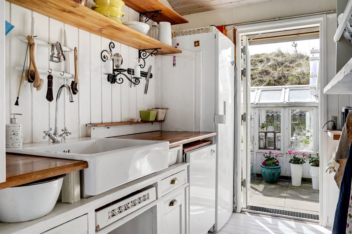 Køkkenet er udstyret med 1 køleskab. Der er 4 induktionskogeplader, varmluftovn samt opvaskemaskine.